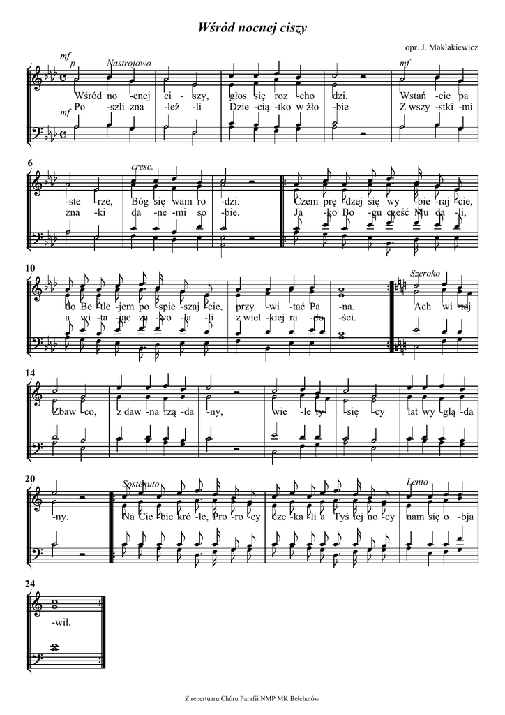 Wśród nocnej ciszy opr. J. Maklakiewicz mf fff D j f a k p Nastrojowo Wśród no -cnej Po -szli zna k j f f f D b f mf k fff j f a k 6 ci - szy, -leź -li j k j jj fff ks kks ks kks kkszz kss ks s f a k t k t t t k t -cie, tdo Be -tle t -jem po -spie -szaj t a wi s za s -li sk ks -ta sk -jąc ksz -wo ks -ła k k ks k k k k k k f b f ff t t t t kt z ttk t t 14 kk kk k kk jj j j k a j j 10 b Zbaw -co, z daw -na rzą -da jj k jj a 20 jj b 24 a ii kk m -ny, j m m k kk k przy -wi -tać Pa z wiel -kiej ra -do m s s s s J kks kk kks kk kk zz kks ks ks t Pro tt -ro t -bie t -le, t -cy t t Cie t kró Na ks ks kks kks ksz kks ks kks J t t t t kz t t t t t Sostenuto -ny. j kk kk k m kk b m j dzi. -bie j k mf k Wstań -cie pa Z wszy -stki -mi k j m k Szeroko J eeee jj kk kk k ii -na. -ści. Ach k kk i k k k k j J eeee j wi -taj kk kk jj kk k j k j jj kk kk k kk k wie -le ty -się -cy lat wy -glą -da kk kk jj jj k kk kk k j j s s kks kks kks kks kk zz kks ks ks t tej tt no t -li t t-cy t -ka t at Tyś cze ks ks kks kks ksz kks ks kks t t t t kz t t t t t J -wił. ii j j s s J kks ks kks ks kk zz ks ks ks t -dzej t wy t -bie tt -raj t -cie, t prę t się t Czem ss das -li,s Ja sz Mu s Bos -gu s cześć sk -ko k k k k k k k k k k k J t t t k k k t tk z tt t t m -dzi. -bie. k k kk kk k k kk kk kk jj kk Bóg się wam ro da -ne -mi so j głos się roz -cho Dzie -cią -tko w żło j kk kk kk -rze, -ki fff j f b j cresc. j -ste zna j kk kk kk k k J Z repertuaru Chóru Parafii NMP MK Bełchatów kk kk kk k Lento nam się o -bja kk kk kk kk