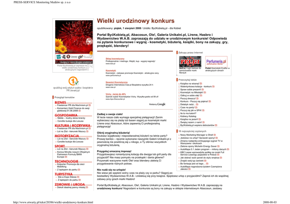 PRESS-SERVICE Monitoring Mediów sp. z o.o Wielki urodzinowy konkurs opublikowany: piątek, 1 sierpień 2008 / źródło: ByćKobietą.pl - dla Kobiet Portal ByćKobietą.pl, Abacosun, Ole!, Galeria Unikalni.pl, Lirene, Hasbro i Wydawnictwo W.A.B. zapraszają do udziału w urodzinowym konkursie! Odpowiedz na pytanie konkursowe i wygraj - kosmetyki, biżuterię, książki, bony na zakupy, gry, przękąski, blendery! Zakupy przez internet Sklep kosmetyczny Profesjonalnie i niedrogo. Wejdź, kup - wygraj nagrody! www.lara.pl Portal ByćKobietą.pl zaprasza na wielki urodzinowy konkurs z atrakcyjnymi nagrodami! Kosmetyki Kosmetyki - ciekawe promocje Kosmetyki - atrakcyjne ceny NetCar Felgi stalowe do samochodów marki Renault Pedet Kosmetyki Evaflor w atrakcyjnych cenach www.perfumeria.pl Przeczytaj także Nowości Kosmetyczne Drogeria Internetowa Ciao.pl Bezpłatna wysyłka 24 h www.ciao.pl Przegląd tematów Vichy - taniej do 40% Szeroki wybór Kosmetyków Vichy. Wysyłka gratis od 99 zł! www.Apo-Discounter.pl Freelancer PR dla Machniom.pl Komentarz Gold Finance do sesji giełdowej 01.08.2008 Meble – trudny okres branży Condite buduje dla Lexusa Freelancer PR dla Machniom.pl Lot na Zlot - kierunek Mazury Lot na Zlot - kierunek Mazury Condite buduje dla Lexusa Lot na Zlot - kierunek Mazury Konica Minolta nowym Oficjalnym Partnerem Formuły BMW Europe Kolporter Promocja dla sieci Mobilking Z laptopem do parku Siła w Expo Silesia Z laptopem do parku Dekolt idealnej panny młodej http://www.otwarty.pl/tekst/20386/wielki-urodzinowy-konkurs.html Zadbaj o swoje ciało! W lecie nasze ciało wymaga specjalnej pielęgnacji! Zanim wybierzesz się na plażę lub basen sięgnij po kosmetyki marki Lirene oraz Abacosun, które zapewnią Ci profesjonalną pielęgnację! Olśnij oryginalną biżuterią! Szukasz wyjątkowej i niepowtarzalnej biżuterii na letnie party? Proszę bardzo – ręcznie wykonane naszyjniki Galerii Unikalni.pl z pewnością nie powtórzą się u nikogo, a Ty olśnisz wszystkich oryginalną biżuterią. Przygotuj smaczną imprezę! Przygotowujesz romantyczną kolację dla dwojga lub grill party dla przyjaciół? Nie masz pomysłu na przekąski i dania główne? Przysmaki warzywne marki Ole! oraz blendery ułatwią Ci przygotowanie różnych potraw. Książka na wiosnę! Walentynkowa kolacja - konkurs Spraw sobie prezent! Kosmetyki na Mikołajki! Odkryj w sobie siłę! Poczuj dreszcz! Konkurs - Poczuj się piękna! Dietetyk radzi... Czas na party! Poczuj się jak w SPA! Ile to ma kalorii? Kobiecy Katalog Książka na jesień! Świętuj razem z nami! ByćKobietą.pl wspiera debiutantów 10 najczęściej czytanych Nowy Marketing Manager w Shell Jedziesz na urlop? Sprawdź opony! Zmiana nadajnika emitującego sygnał TV w Warszawie i okolicach Zielone opony Michelin Energy Saver AutoMapa 5.1 Jeden program – miliony danych KBC Lease wprowadziła spółkę na rynek Full Service Leasingu pojazdów w Polsce Jak dobrać wzór paneli do stylu wnętrza Znajdź swój typ żarówki Bo fantazja jest od tego… AutoMapa nagrodzona tytułem Czempiona Jakości Nie nudź się na urlopie! Nie wiesz jak spędzić wolny czas na plaży czy w parku? Sięgnij po bestsellery Wydawnictwa W.A.B. i zrelaksuj się przy książce. Spędzasz urlop z przyjaciółmi? Zaproś ich do wspólnej zabawy przy grach marki Hasbro! Portal ByćKobietą.pl, Abacosun, Ole!, Galeria Unikalni.pl, Lirene, Hasbro i Wydawnictwo W.A.B. zapraszają na urodzinowy konkurs! Nagrodami w konkursie są bony na zakupy w sklepie internetowym Abacosun, zestawy 2008-08-03 PRESS-SERVICE Monitoring Mediów sp. z o.o Nike FISSION – eksplozja energii! Nowy zapach Nike pobudza, inspiruje, wyróżnia. Podręczniki czas... wymienić? Dekolt idealnej panny młodej przysmaków warzywnych marki Ole!, blendery, zestaw kosmetyków marki Lirene, ręcznie wykonane i oryginalne naszyjniki z Galerii Unikalni.pl, gry Upwords marki Hasbro oraz zestawy bestsellerów Wydawnictwa W.A.B. Odpowiedz na pytanie konkursowe, które znajdziesz na stronach portalu ByćKobietą.pl i wygraj atrakcyjne nagrody! ByćKobietą.pl ByćKobietą.pl to portal internetowy dla Kobiet. Zawiera artykuły na temat zdrowia, urody, mody, a nawet motoryzacji... W portalu znajduje się forum, testy i kalkulatory dla kobiet, interaktywna baza kalorii oraz Kobiecy Katalog. Abacosun Sklep Abacosun to wyselekcjonowane i sprawdzone produkty marek Abacosun, które odpowiadają wymaganiom współczesnego klienta oczekującego najwyższej jakości i efektywności. Marka Ole! Marka Ole! to uznane i lubiane, wysokiej jakości ciekawe przysmaki warzywne takie jak: cebulki, czosnki, pieczarki, szparagi, oliwki i wiele innych. Galeria Unikalni.pl Galeria jest miejscem dla pasjonatów, artystów, twórców, projektantów, którzy tworzą w najróżniejszych technikach. Tu znajdziesz wyjątkowy prezent! Lirene Lirene troszczy się o kobiety i chce, aby zawsze wyglądały pięknie. Pielęgnacja Lirene to połączenie skutecznego działania produktów i niezwykłej przyjemności stosowania. Hasbro Hasbro International jest jednym z największych producentów gier i zabawek, którego produkty są znane i lubiane przez dzieci na całym świecie. Wydawnictwo W.A.B. Wydawnictwo W.A.B. zostało założone w 1991 roku. W W.A.B. ukazują się książki m.in. Anny Bojarskiej, Katarzyny Grocholi, Krystyny Jandy, Krystyny Kofty. tekst dostarczony za pomocą systemu pr.otwarty.pl ByćKobietą.pl - dla Kobiet http://www.byckobieta.pl http://www.otwarty.pl/tekst/20386/wielki-urodzinowy-konkurs.html 2008-08-03