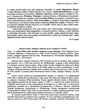 OPERA SLAVICA X, 2000, 1 ni vztahy polsko-ruské jsou pak objektem zkoumání ve statích Boguslawa Muchy z Lodže (Římská setkání Adama Mickiewicze s Rusy), Józefa Borsukiewicze z Lublina (polská literatura a Lermontov), Barbary Olaszek z Lodže (postavy románů B . Pru se a I. Gončarova) a Wieslawy Wožniak z Lublina (Čechov a Wlodzimierz Perzyriski). Tematickou atraktivitou zaujmou studie Leonida Hellera (Lausanne) o polských a rus kých modemistických utopiích, Jana Orlowského o polských historických legendách v ruské poezii a srovnávací práce polsko-bulharská (Henryka Czajka z Varšavy). Dvě ma studiemi přispěli Danuše Kšicová a Ivo Pospíšil z Bma (oba ze sféry česko-ruskoevropských literárních vztahů). I když téma konference bylo dost široké, tedy všeslovanské, tematická koncen trace byla jednoznačně dána geograficky a kulturně polohou Lublina, a tudíž inklinací k východním Slovanům. Jako tak často tu zcela chyběly vztahy západoslovansko-západoslovanské (česko-slovensko-polsko-lužickosrbské) a slabě byly prezentovány vztahy západoslovansko-jihoslovanské. Ivo Pospíšil Daniel Vetter, dzialacz Jednoty braci czeskich w Polsce Vetter, D.: ISLANDIA albo Krótkie opisanie wyspy Islandyji. Prače Naukowe Uniwersytetu Šlqskiego w Katowicach, nr 1656. Seria: Historia Literatury Polskiej. Opracowat i wst?pem opatrzyl Dariusz Rott. Wydawnictwo Uniwersytetu Šlaskiego, Katowice 1997, 56 s., 28 ilustracji. Jednota braci czeskich (založona 1467) wpisala s i ; tak do dziejów ziem czeskich jak polskich. Juž w 1548 roku przyszli do Wielkopolski, wygnani z dobr królewskich w Czechach, pierwsi bracia czescy, drugi wielki exodus nastapil po kl?sce pod Biala. Góra. w Pradze w 1620 roku, kiedy to do Polski udalo si? wielu wychodžców z Czech i Moraw. Siedziba. seniorów Jednoty braci czeskich stal si? Ostroróg a po 1640 Leszno. W 1632 osiadt w Lesznie takže Morawianin Daniel Vetter, dzialacz Jednoty i jej drukarz. Daniel Vetter urodzit si? prawdopodobnie mi?dzy 12 sierpnia a 12 paždziernika 1592 roku w Hranicach na Morawach. Jego ojciec Jiří Strejc byl starszym zboru Jedno ty ijednym ztlumaczy Biblii kralickiej. Daniel sp?dzil mlodoáč chyba w Židlochowicach (dokad przenióst si? Jiří Strejc i gdzie w 1599 r. w wieku 63 lat zmarl), Kralicach i Náměšti nad Oslava, (w obu miasteczkach doskonalil si? w 1629 roku w sztuce typograficznej), ksztatcit si? w gimnazjach protestanckich w Hebron i Bremie, studiowal wydziai teologiczny uniwersytetu w Heidelbergu. Studia teologiczne kontynuowal (z przerwami) w latách 1623-1632 na uniwersytecie w Leiden, skad byt zmuszony uciekač do Niderlandów po calkowitym úpadku powstania w Czechach (1623). W Lesznie zostat Daniel Vetter w 1632 roku mianowany ministrem Jednoty, objal równiež kierownictwo drukami braci czeskich. W tym warsztacie typograficznym uká zalo si? wtedy (do 1656 roku) ponad 160 druków czeskich, polskich, niemieckich i ta- 55 OPERA SLAVICA X, 2000, 1 ciňskich, np. okolo 30 utworów J. A . Komenskiego, 6 utworów Samuela ze Skrzypyny Twardowskiego czy Satyry K . Opaliňskiego (niektóre, bardzo starannie wydane, mogty konkurowač z najlepszymi drukami oficyn poznanskich czy torunskich). Kiedy Vetter studiowal w gymnázium w Bremie, udal s i ; z Morawianinem Janem Salomenem w podróž na Islandy. Wyniszyli 16 mája 1613, wyprawa pomocná trwala okolo 9-11 tygodni. Podczas pobytu na Islandii spisywal Vetter diariusz podrózy (nie zachowal s i ; do naszych czasów). Dopiero znacznie póžniej zrobil autor selekcj; zebranego materíahi i opracowal tekst (rekopis czeski pochodzi z 1632 roku i liczy 85 stron). Wersja polska ksiažki Islandia albo Krótkie opisanie wyspy Islandyji ukázala s i ; w 1638 roku w drukami w Lesznie, w roku 1640 wydrukowano równiež wersj; niemieclcq, w roku 185$ przetožono tekst na jezyk duriski a dopiero po šmierci Vettera (zmarl chyba w 1669 roku) opublikowano w Pradze w roku 1673 wersj; czeska.. Istnieja. jednak hipotezy (K. Estreicher i Č. Zíbrt), že Vetter z wersja. czeska. opracowal równolegle wersj; polsky i že obydwie edycj; opublikowat miedzy 1637 a 1640 rokiem (prawdopodobnie sptonely podczas požáru Leszna w 1656 roku). Daniel Vetter jest wiec autorem jedynego utworu literackiego - Islandia albo Krótkie opisanie wyspy Islandyji. Dlatego Vetterowi dotychczas nie pošwi;cono wiele obszemych uwag, chociaž istnieja. wartoáciowe opracowania i prače badaczy czeskich i polskich (Č. Zíbrt, B . Horák, O. Odložilik i A . Kawecka-Gryczowa, D. Rott), powstary równiež utwory literackie, inspirowane ta. postacia. (np. powiešč St. Helsztyňskiego Uczeň Amosa). Ksiažki podróžnicze i chorograficzne, obok pamietnikarstwa, relacji, kronik, roczników i diaríuszy, nalézaly w 17 wieku do bardzo populamych. Równiež ksiažka Vettera mogla przypašč do gustu ówczesnym czytelnikom. Ale dlaczego ukazu je s i ; Islandia pod koniec wieku dwudziestego w sérii naukowej i z bardzo starannym szkicem (Wst;p) Dariusza Rotta? Opracowanie Rotta jest owocnym przyczynkiem do badania dziejów i dzialalnosci zboru Jednoty braci czeskich w Polsce i przypomienie wartoáci ksiažeczki - która. wybitny islandzki przyrodnik T. Thoroddsen (1855-1921) uznal za najlepszy opis Islandii w 17 wieku napisany poza Skandynawiq, zaá badacze polscy (H. Dziechciňska, E . K o tarski) za pierwsze sprawozdanie z podrózy w dobie staropolskiej, które nie zostalo zapisane w formie diariusza - jest co najmniej sluszne. Edycja niniejsza stanowi plon ponad dziesi;ciu lat badán D. Rotta nad tekstem Islandii i žyciem i praca. Daniela Vettera. Badacz polski uwypukla niektóre dotad malo znané szczególy z žycia i dzialalnosci Ieszczyňskiego typografa i ocenia jego ksiažk; jako utwór wažny i interesujacy, który do dziá nie stracil swych lekturowych zálet. Islandia ma wedlug Rotta „charakter dokumentarny i autentyany. Jej narrator stanowi umiejetne pofqc