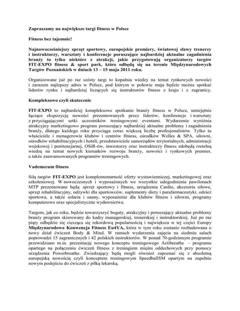 Zapraszamy na największe targi fitness w Polsce Fitness bez tajemnic! Najnowocześniejszy sprzęt sportowy, europejskie premiery, światowej sławy trenerzy i instruktorzy, warsztaty i konferencje poruszające najbardziej aktualne zagadnienia branŜy to tylko niektóre z atrakcji, jakie przygotowują organizatorzy targów FIT-EXPO fitness & sport park, które odbędą się na terenie Międzynarodowych Targów Poznańskich w dniach 13 – 15 maja 2011 roku. Organizowane juŜ po raz szósty targi to kopalnia wiedzy na temat rynkowych nowości i zarazem najlepszy adres w Polsce, pod którym w połowie maja będzie moŜna spotkać liderów rynku i najbardziej liczących się instruktorów fitness z kraju i z zagranicy. Kompleksowo czyli skutecznie FIT-EXPO to najbardziej kompleksowe spotkanie branŜy fitness w Polsce, umiejętnie łączące ekspozycję nowości prezentowanych przez liderów, konferencje i warsztaty z przyciągającymi setki uczestników treningowymi eventami. Wydarzenie wyróŜnia atrakcyjny marketingowo program poruszający najbardziej aktualne problemy i zagadnienia branŜy, dlatego kaŜdego roku przyciąga coraz większą liczbę profesjonalistów. Tylko tu właściciele i menagerowie klubów i centrów fitness, ośrodków Welles & SPA, siłowni, ośrodków rehabilitacyjnych i hoteli, przedstawiciele samorządów terytorialnych, administracji wojskowej i penitencjarnej, OSiR-ów, inwestorzy oraz instruktorzy fitness zdobędą rzetelną wiedzę na temat nowych kierunków rozwoju branŜy, nowości i rynkowych premier, a takŜe zaawansowanych programów treningowych. Vademecum fitness Siłą targów FIT-EXPO jest komplementarność oferty wystawienniczej, marketingowej oraz szkoleniowej. W nowoczesnych i wyposaŜonych we wszystkie udogodnienia pawilonach MTP prezentowane będą: sprzęt sportowy i fitness, urządzenia Cardio, akcesoria siłowe, sprzęt rehabilitacyjny, odŜywki dla sportowców, suplementy diety i parafarmaceutyki, odzieŜ sportowa, a takŜe solaria i sauny, wyposaŜenie dla klubów fitness i siłowni, programy komputerowe oraz specjalistyczne wydawnictwa. Targom, jak co roku, będzie towarzyszyć bogaty, atrakcyjny i poruszający aktualne problemy branŜy program skierowany do kadry managerskiej, trenerskiej i instruktorskiej. JuŜ po raz piąty odbędzie się ciesząca się rekordową popularnością i największa w tej części Europy Międzynarodowa Konwencja Fitness Eu4YA, która w tym roku zostanie rozbudowana o nowy dział ćwiczeń Body & Mind. W ramach wydarzenia zajęcia na siedmiu salach poprowadzi 15 zagranicznych i 42 polskich instruktorów. W ponad 70-godzinnym programie przewidziano m.in. prezentację nowego konceptu treningowego Actibreathe – programu opartego na połączeniu ćwiczeń fitness z treningiem mięśni oddechowych przy pomocy urządzenia Powerbreathe. Zwiedzający będą mogli równieŜ zapoznać się z absolutną europejską nowością czyli konceptem treningowym SpeedballSM opartym na zupełnie nowym podejściu do ćwiczeń z piłką lekarską. Zgodnie z oczekiwaniami branŜy fitness tegoroczna konferencja (wcześniej znana jako Fitness Marketing Event) zostanie w znacznie większym stopniu poświęcona zagadnieniom związanym z filozofią wellness i przyjmie nazwę Fitness & Wellness Event. Nowością będzie takŜe podział spotkania na bloki i moduły, co umoŜliwi sprawne dopasowanie zagadnień do potrzeb uczestników. Pierwszy z nich – „Marketing & Management”, skierowany zostanie do kadry zarządzającej i managerów klubów. Drugi – „Coaching” będzie poświęcony doskonaleniu umiejętności instruktorów fitness and wellness. W ramach wydarzenia po raz drugi zostaną równieŜ wyróŜnione najlepsze branŜowe inicjatywy. Laureaci zostaną wyłonieni w czterech kategoriach: Sieć klubów fitness; Klub fitness z pasją; Marka fitness oraz Fitnessowy projekt marketingowy. Europejskie premiery i rynkowe nowości Siłą napędową targów FIT-EXPO są nowości prezentowane przez naszych wystawców. Podczas szóstej edycji wydarzenia będzie się moŜna zapoznać i przeszkolić m.in. w zakresie wykorzystywania systemu profesjonalnych lin do podwieszania TRX® wykorzystującego masę ciała osoby ćwiczącej i grawitację do stwarzania oporu podczas ćwiczeń. Na Międzynarodowych Targach Poznańskich pojawią się takŜe innowacyjny Leg-check 626 oraz Medi-squad Trainer 776 sygnowane przez firmę Dr.Wollf. Tradycyjnie nie zabraknie takŜe światowych sław treningu i instruktorstwa. Swoją obecność w ramach EU4YA potwierdził m. in. Michael King, który od ponad 30 lat pracuje z techniką pilaste. W ramach Fitness & Wellness Event z uczestnikami spotka się znana na całym świecie prezenterka Lexie Griffiths, wykwalifikowana NLP Life Coach i Business Coach. A tajniki zarządzania branŜą fitness przybliŜy jeden z głównych managerów największej sieci klubów fitness na świecie „LesMills” - Jasper Magnusson. Na brak atrakcji nie będą mogli narzekać takŜe fani stacjonarnych dwóch kółek, którzy po raz kolejny będą mogli stawić czoła wyzwaniom w ramach zajęć Indor Cyclingu EVOLUTION RIDE 2011. A miłośnicy dyscypliny sportowej łączącej najlepsze cechy tenisa, badmintona i squash, po raz kolejny spotkać najlepszych zawodników Europy i wziąć udział w turnieju oraz warsztatach w ramach Speed Badminton Park. ___________________________________________________________________________ FIT-EXPO fitness & sport park 13-15 maja 2011 r. Więcej informacji – www.fitness.mtp.pl Kontakt: Anna Myślak, e-mail: [email protected], tel. +48/ 61 869 20 95, fax +48/ 61 869 20 40 Do zobaczenia na FIT-EXPO 2011!