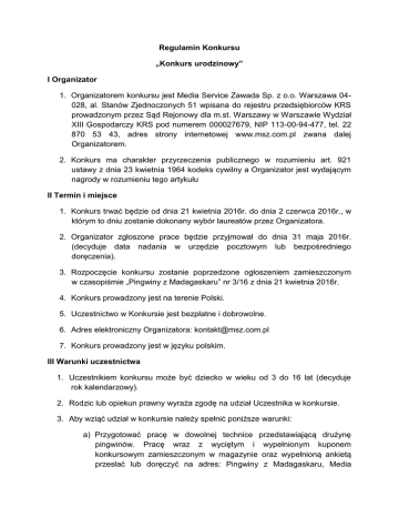 Regulamin Konkursu „Konkurs urodzinowy” I Organizator 1. Organizatorem konkursu jest Media Service Zawada Sp. z o.o. Warszawa 04028, al. Stanów Zjednoczonych 51 wpisana do rejestru przedsiębiorców KRS prowadzonym przez Sąd Rejonowy dla m.st. Warszawy w Warszawie Wydział XIII Gospodarczy KRS pod numerem 000027679, NIP 113-00-94-477, tel. 22 870 53 43, adres strony internetowej www.msz.com.pl zwana dalej Organizatorem. 2. Konkurs ma charakter przyrzeczenia publicznego w rozumieniu art. 921 ustawy z dnia 23 kwietnia 1964 kodeks cywilny a Organizator jest wydającym nagrody w rozumieniu tego artykułu II Termin i miejsce 1. Konkurs trwać będzie od dnia 21 kwietnia 2016r. do dnia 2 czerwca 2016r., w którym to dniu zostanie dokonany wybór laureatów przez Organizatora. 2. Organizator zgłoszone prace będzie przyjmował do dnia 31 maja 2016r. (decyduje data nadania w urzędzie pocztowym lub bezpośredniego doręczenia). 3. Rozpoczęcie konkursu zostanie poprzedzone ogłoszeniem zamieszczonym w czasopiśmie „Pingwiny z Madagaskaru” nr 3/16 z dnia 21 kwietnia 2016r. 4. Konkurs prowadzony jest na terenie Polski. 5. Uczestnictwo w Konkursie jest bezpłatne i dobrowolne. 6. Adres elektroniczny Organizatora: [email protected] 7. Konkurs prowadzony jest w języku polskim. III Warunki uczestnictwa 1. Uczestnikiem konkursu może być dziecko w wieku od 3 do 16 lat (decyduje rok kalendarzowy). 2. Rodzic lub opiekun prawny wyraża zgodę na udział Uczestnika w konkursie. 3. Aby wziąć udział w konkursie należy spełnić poniższe warunki: a) Przygotować pracę w dowolnej technice przedstawiającą drużynę pingwinów. Pracę wraz z wyciętym i wypełnionym kuponem konkursowym zamieszczonym w magazynie oraz wypełnioną ankietą przesłać lub doręczyć na adres: Pingwiny z Madagaskaru, Media Service Zawada Sp. z o.o., al. Stanów Zjednoczonych 51, 04-028 Warszawa. b) Na przesyłce czytelnie napisać swoje imię, nazwisko oraz adres dla doręczeń (adres zamieszkania lub pobytu), c) Kupon konkursowy powinien lub opiekuna prawnego. być wypełniony przez rodzica d) Każdy Uczestnik może wysłać dowolną ilość prac. e) Regulamin w PDF jest dostępny na stronie www.msz.com.pl (wejście przez zakładkę „Konkursy”) oraz jest udostępniony w siedzibie Organizatora. Uczestnik przed wzięciem udziału w Konkursie powinien zapoznać się z jego treścią. Regulamin może być pobrany w wersji PDF. Uczestnik przed przystąpieniem do konkursu powinien zapoznać się z niniejszym regulaminem. Wysłanie kuponu konkursowego oznacza, iż Uczestnik Konkursu (rodzic/opiekun prawny) zapoznał się z Regulaminem i polityką prywatności. f) Biorąc udział w Konkursie, Uczestnik nie będzie dostarczać treści bezprawnych, w szczególności używać obraźliwych oznaczeń UWAGA: Z uwagi na fakt, iż Uczestnikiem Konkursu może być osoba małoletnia, poniżej 18 lat, z Regulaminem Konkursu oraz Polityką prywatności powinien zapoznać się rodzic albo opiekun prawny. Określone czynności powinny być podejmowane przez rodzica (opiekuna prawnego) albo być przez niego potwierdzone. . 4. Uczestnikowi nie przysługuje zwrot kosztów wykonania i przesłania prac. 5. Organizator ma prawo do konkursu i ich publikacji. zatrzymania oryginału prac zgłoszonych IV Wyłonienie laureata 1. Organizator w terminie do 2 czerwca 2016 wyłoni 44 laureatów. 2. Spośród Uczestników Konkursu, którzy dokonali Zgłoszenia do Konkursu. Nagroda przyznana zostanie temu Uczestnikowi, którego odpowiedź na zadanie Konkursowe zostanie uznana za najciekawszą, i która najpełniej spełniła kryteria Konkursu opisane poniżej. Laureatów Konkursu wybierze Komisja Konkursowa, składająca się z 3-5 osób, która przy wyborze Laureata będzie kierowała się następującymi kryteriami: • zgodność merytoryczna, • oryginalność, pomysłowość, • kreatywność, • poprawność językowa. 3. Przy wyborze Laureata nie ma znaczenia kolejność zgłoszeń. 4. Organizator sporządzi listę laureatów zawierającą imiona, nazwiska i adresy dla doręczeń laureatów, rodzaj przyznanej nagrody, datę i podpis osoby sporządzającej listę. 5. Informacja o otrzymaniu nagrody głównej lub nagród dodatkowych zostanie przesłana na adres e-mail Uczestnika lub rodzica/opiekuna prawnego podany w kuponie konkursowym oraz zostanie opublikowana wraz z imieniem, nazwiskiem, miejscowością zamieszkania w czasopiśmie „Pingwiny z Madagaskaru” nr 5/16 z dnia 19.08.2016r. lub na stronie internetowej. V Nagrody 1. Laureaci konkursu otrzymają nagrody w postaci: a) 4 zestawy LEGO City 60113 ufundowane przez firmę LEGO Polska Sp. z o.o. o wartości jednostkowej 40 zł brutto. b) 4 zestawy LEGO City 60114 ufundowane przez firmę LEGO Polska Sp. z o.o. o wartości jednostkowej 40 zł brutto. c) 2 zestawy LEGO Star Wars 75112 ufundowane przez firmę LEGO Polska Sp. z o.o. o wartości jednostkowej 150 zł brutto. d) 3 zestawy LEGO Star Wars 75109 ufundowane przez firmę LEGO Polska Sp. z o.o. o wartości jednostkowej 100 zł brutto. e) 5 zestawów maskotek Angry Birds ufundowanych przez firmę Media Service Zawada Sp. z o.o. o wartości jednostkowej 58 zł brutto. f) 10 T-shirtów z Królem Julianem ufundowanych przez firmę E plus M Sp. z o.o. o wartości jednostkowej 14 zł brutto. g) 3 gry Scrabble Junior ufundowane przez Mattel Poland Sp. z o.o. o wartości jednostkowej 88 zł brutto. h) 5 filmów na DVD „Kapitan Jake i piraci z Nibylandii – Wielka bitwa o Nibymorze” ufundowanych przez firmę Galapagos Sp. z o.o. o wartości jednostkowej 30 zł brutto. i) 2 zestawy klocków Pingwiny z Madagaskaru – Tajna baza ufundowanych przez firmę COBI S.A. o wartości jednostkowej 94 zł brutto. j) 6 zabawek Zelfs Crystal ufundowanych przez firmę EPEE Polska Sp. z o.o. o wartości jednostkowej 62 zł brutto. 2. Nagroda nie może zostać zamieniona na ekwiwalent pieniężny lub inną nagrodę rzeczową. 3. Jeden Uczestnik mo