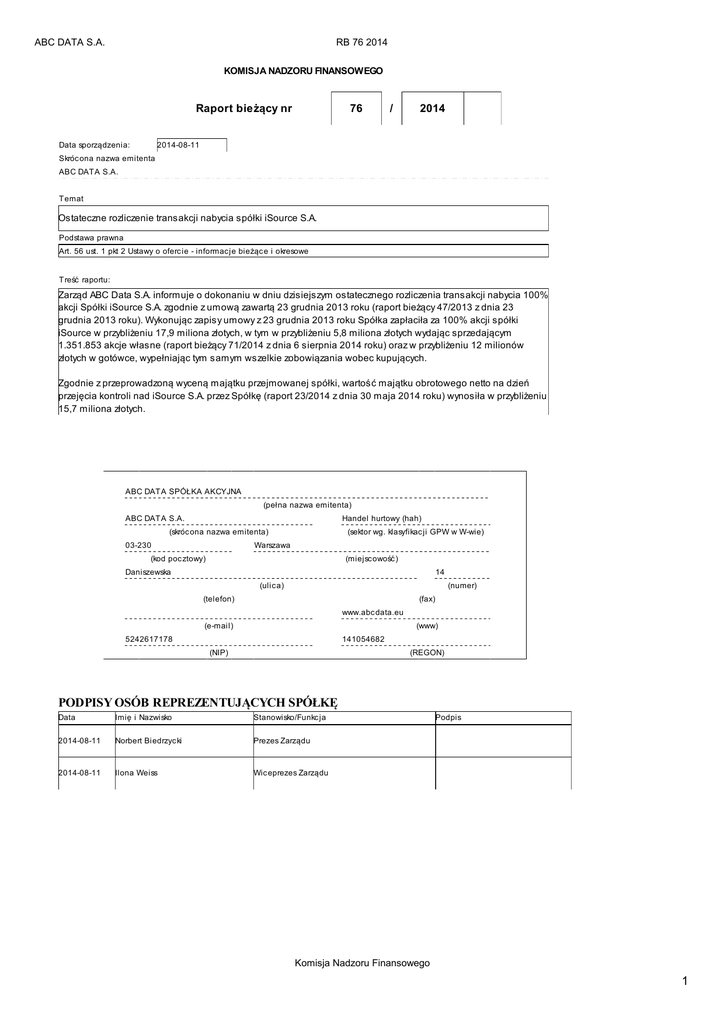 ABC DATA S.A. RB 76 2014 KOMISJA NADZORU FINANSOWEGO Raport bieżący nr 76 / 2014 2014-08-11 Data sporządzenia: Skróc ona nazwa emitenta ABC DATA S.A. Temat Ostateczne rozliczenie transakcji nabycia spółki iSource S.A. Podstawa prawna Art. 56 ust. 1 pkt 2 Ustawy o oferc ie - informac je bieżąc e i okresowe Treść raportu: Zarząd ABC Data S.A. informuje o dokonaniu w dniu dzisiejszym ostatecznego rozliczenia transakcji nabycia 100% akcji Spółki iSource S.A. zgodnie z umową zawartą 23 grudnia 2013 roku (raport bieżący 47/2013 z dnia 23 grudnia 2013 roku). Wykonując zapisy umowy z 23 grudnia 2013 roku Spółka zapłaciła za 100% akcji spółki iSource w przybliżeniu 17,9 miliona złotych, w tym w przybliżeniu 5,8 miliona złotych wydając sprzedającym 1.351.853 akcje własne (raport bieżący 71/2014 z dnia 6 sierpnia 2014 roku) oraz w przybliżeniu 12 milionów złotych w gotówce, wypełniając tym samym wszelkie zobowiązania wobec kupujących. Zgodnie z przeprowadzoną wyceną majątku przejmowanej spółki, wartość majątku obrotowego netto na dzień przejęcia kontroli nad iSource S.A. przez Spółkę (raport 23/2014 z dnia 30 maja 2014 roku) wynosiła w przybliżeniu 15,7 miliona złotych. ABC DATA SPÓŁKA AKCYJNA (pełna nazwa emitenta) ABC DATA S.A. Handel hurtowy (hah) (skróc ona nazwa emitenta) 03-230 (sektor wg. klasyfikac ji GPW w W-wie) Warszawa (kod poc ztowy) (miejscowość) Daniszewska 14 (ulica) (numer) (telefon) (fax) www.abc data.eu (e-mail) (www) 5242617178 141054682 (NIP) (REGON) PODPISY OSÓB REPREZENTUJĄCYCH SPÓŁKĘ Data Imię i Nazwisko Stanowisko/Funkc ja 2014-08-11 Norbert Biedrzyc ki Prezes Zarządu 2014-08-11 Ilona Weiss Wic eprezes Zarządu Podpis Komisja Nadzoru Finansowego 1