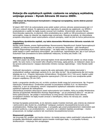 Dotacje dla szpitalnych spółek: czekanie na wiąŜącą wykładnię unijnego prawa – Rynek Zdrowia 30 marca 2009r. Aby cieszyć się finansowymi korzyściami z integracji europejskiej, warto dobrze poznać unijne prawo... W latach 2007-2013 do wykorzystania przez polski system ochrony zdrowia zarezerwowane jest 1,5 mld euro unijnych dotacji. Po ogłoszeniu przez rząd planu B, pojawiła się wątpliwość, czy SPZOZ-y przekształcone w spółki nie będą musiały zwracać tych środków. Wiceminister zdrowia Mariola Dwornikowska zapewniła, Ŝe placówki, które przekształcą się w spółki ze 100-procentowym udziałem samorządów, mogą nie obawiać się negatywnego scenariusza. Okazuje się jednak, Ŝe interpretacja przepisów dotyczących zasad wykorzystania unijnych pieniędzy, nadal nie jest do końca jednoznaczna. Zapytaliśmy dyrektorów szpitali, czy takie stanowisko Ministerstwa Zdrowia rozwiało ich wątpliwości. Renata JaŜdŜ-Zaleska, prezes Ogólnopolskiego Stowarzyszenia Niepublicznych Szpitali Samorządowych (OSNSS), po lekturze komunikatu resortu uwaŜa, Ŝe rzeczywiście, kłopotów – jako beneficjenci środków Regionalnego Programu Operacyjnego – nie będą miały te szpitale, które przekształcą się w spółki będące w pełni własnością samorządów. Jak przekonuje, najwaŜniejsze jest, aby w tych samych budynkach była prowadzona ta sama działalność medyczna, na którą szły środki z UE. OstroŜnie z tą korzyścią – Problem pojawi się wtedy, kiedy samorząd będzie chciał zdywersyfikować udziały czy akcje swojej spółki. Na razie mamy w tej kwestii tylko oficjalną informację, sądzę jednak, Ŝe niebawem ukaŜe się w tej sprawie jednoznaczne i wiąŜące stanowisko ministra rozwoju regionalnego – mówi Renata JaŜdŜZaleska. MoŜliwość skorzystania z unijnego wsparcia dla wielu jednostek, które miałyby skorzystać z przekształceń według rządowego wariantu B, to „być albo nie być”. Na przygotowaną dla nich kwotę składają się m.in.: Program Operacyjny Infrastruktura i Środowisko (411,7 mln euro), Kapitał Ludzki (105 mln euro), 16 regionalnych programów operacyjnych (720 mln euro) oraz szwajcarsko-polski program współpracy (35 mln CHF). KaŜdy z programów określa inny cel, na który uzyskane środki mogą być przeznaczone. Np. Program Operacyjny Infrastruktura i Środowisko pozwala na pozyskanie środków m.in. na ratownictwo medyczne, w tym na rozbudowę, remont i doposaŜenie szpitalnych oddziałów ratunkowych i szpitalnych lądowisk dla helikopterów. Interpretacja przepisów dotyczących zasad wykorzystania tych środków, którą na prośbę Ministerstwa Zdrowia przygotowało Ministerstwo Rozwoju Regionalnego – juŜ po prezentacji planu B – nie jest do końca jednoznaczna. Jak podaje w komunikacie na swej stronie internetowej resort zdrowia, europejskich środków nie będą musieli zwracać ci beneficjenci, którzy nie naruszą tzw. zasady trwałości projektu. Komisja Europejska potwierdziła, Ŝe do złamania zasady trwałości dochodzi, gdy zmienia się właściciel i jednocześnie jako skutek tej „modyfikacji” następuje uzyskanie nieuzasadnionej korzyści przez przedsiębiorstwo. Według tego stanowiska, w przypadku gdy przed przekształceniem właścicielem jest podmiot publiczny, a po przekształceniu – prywatny lub z udziałem kapitału prywatnego – moŜna przypuszczać, Ŝe wystąpi uzyskanie tak rozumianej nieuzasadnionej korzyści. Niepewność pozostaje Jak przyznaje MZ, problem jest bardzo złoŜony i do kaŜdej sprawy naleŜy podchodzić indywidualnie. W przypadku jakichkolwiek wątpliwości sporne kwestie rozstrzygać będą – w przypadku funduszy strukturalnych – instytucje nimi zarządzające. Tam, gdzie samorządy przejmą po przekształceniu 100-procentowe udziały w spółce, kłopotów być nie powinno. Tak uwaŜa zastępca dyrektora do spraw ekonomicznych Szpitala Powiatowego w Łańcucie, Urszula Trojnar: – PoniewaŜ nasza placówka jest beneficjentem środków unijnych, juŜ dwa lata temu zwracaliśmy się do Ministerstwa Rozwoju Regionalnego z zapytaniem, jakie mogą być konsekwencje naszego przekształcenia. Otrzymaliśmy wówczas odpowiedź, Ŝe jeśli po przekształceniu nasz szpital nadal będzie podmiotem publicznym, ze 100-procentowym udziałem własności samorządu, to nie będzie miało to Ŝadnego praktycznie wpływu na zasadę trwałości projektu i nie będziemy musieli zwracać unijnych pieniędzy. – Teraz, po raz drugi, aby mieć absolutną pewność iŜ przekształcenie nie będzie miało dla nas negatywnych skutków, poprzez urząd wojewody ponownie zwróciliśmy się o interpretację przepisów. Otrzymane przez nas odpowiedzi są jednoznaczne. Nie mamy się czego obawiać – twierdzi Urszula Trojnar. Zdaniem wiceprezesa OSNSS Krzysztofa Tuczapskiego, informacja, jaką opublikowało w tej sprawie MZ w części poświęconej tym placówkom, które po przekształceniu pozostaną w rękach samorządów jest przejrzysta. Za informacją powinno pójść jednak ministerialne rozporządzenie, bo sama informacja nie jest dokumentem wiąŜącym. Indywidualnie, czyli jak? – Nie jestem prawnikiem i trudno mi jest interpretować to, co zostało przedstawione w informacji resortu. Wydaje się jednak, iŜ nie wszystko jest w niej do końca oczywiste i klarowne – zauwaŜa Krzysztof Tuczapski. – Jeśli po przekształceniu w jakimś procencie właścicielem placówki będzie ktoś inny niŜ samorząd, to taka sytuacja będzie rozpatrywane indywidualnie. Co to oznacza? Czy dla kaŜdego indywidualnie będzie tworzona interpretacja prawa? – zastanawia się wiceprezes OSNSS. Właśnie m.in. w tej kwestii samorządy i dyrekcje placówek niecierpliwie oczekują na doprecyzowanie interpretacji unijnego prawa. Jacek Janik