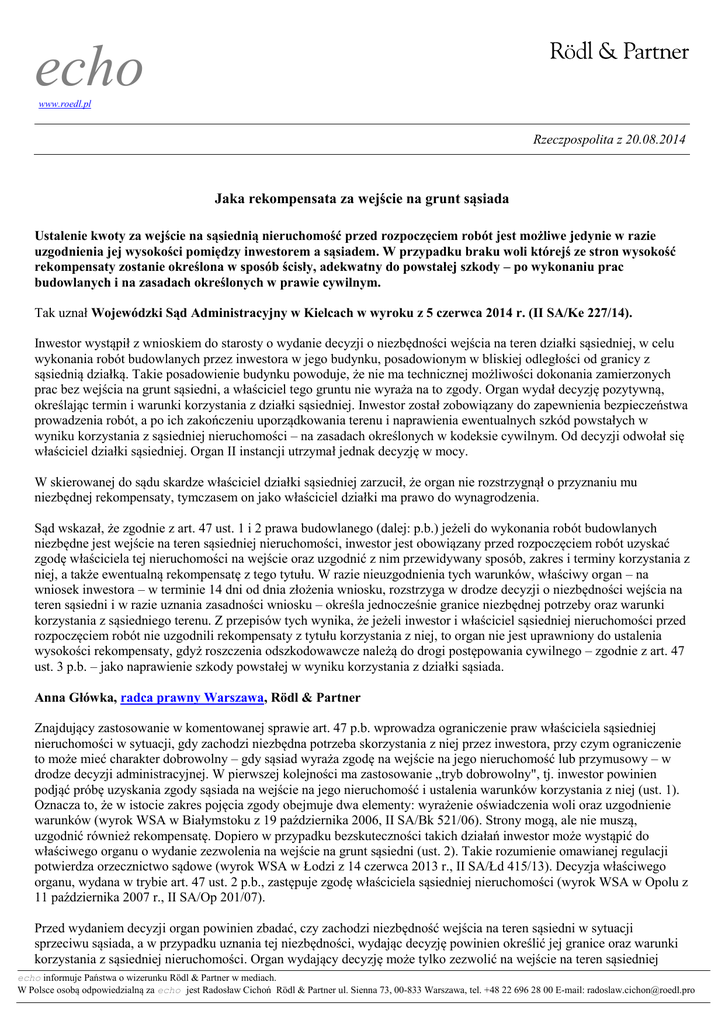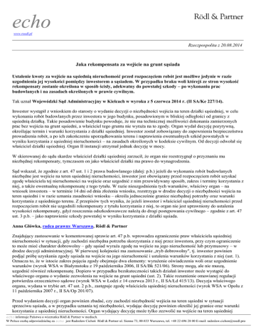 echo www.roedl.pl Rzeczpospolita z 20.08.2014 Jaka rekompensata za wejście na grunt sąsiada Ustalenie kwoty za wejście na sąsiednią nieruchomość przed rozpoczęciem robót jest możliwe jedynie w razie uzgodnienia jej wysokości pomiędzy inwestorem a sąsiadem. W przypadku braku woli którejś ze stron wysokość rekompensaty zostanie określona w sposób ścisły, adekwatny do powstałej szkody – po wykonaniu prac budowlanych i na zasadach określonych w prawie cywilnym. Tak uznał Wojewódzki Sąd Administracyjny w Kielcach w wyroku z 5 czerwca 2014 r. (II SA/Ke 227/14). Inwestor wystąpił z wnioskiem do starosty o wydanie decyzji o niezbędności wejścia na teren działki sąsiedniej, w celu wykonania robót budowlanych przez inwestora w jego budynku, posadowionym w bliskiej odległości od granicy z sąsiednią działką. Takie posadowienie budynku powoduje, że nie ma technicznej możliwości dokonania zamierzonych prac bez wejścia na grunt sąsiedni, a właściciel tego gruntu nie wyraża na to zgody. Organ wydał decyzję pozytywną, określając termin i warunki korzystania z działki sąsiedniej. Inwestor został zobowiązany do zapewnienia bezpieczeństwa prowadzenia robót, a po ich zakończeniu uporządkowania terenu i naprawienia ewentualnych szkód powstałych w wyniku korzystania z sąsiedniej nieruchomości – na zasadach określonych w kodeksie cywilnym. Od decyzji odwołał się właściciel działki sąsiedniej. Organ II instancji utrzymał jednak decyzję w mocy. W skierowanej do sądu skardze właściciel działki sąsiedniej zarzucił, że organ nie rozstrzygnął o przyznaniu mu niezbędnej rekompensaty, tymczasem on jako właściciel działki ma prawo do wynagrodzenia. Sąd wskazał, że zgodnie z art. 47 ust. 1 i 2 prawa budowlanego (dalej: p.b.) jeżeli do wykonania robót budowlanych niezbędne jest wejście na teren sąsiedniej nieruchomości, inwestor jest obowiązany przed rozpoczęciem robót uzyskać zgodę właściciela tej nieruchomości na wejście oraz uzgodnić z nim przewidywany sposób, zakres i terminy korzystania z niej, a także ewentualną rekompensatę z tego tytułu. W razie nieuzgodnienia tych warunków, właściwy organ – na wniosek inwestora – w terminie 14 dni od dnia złożenia wniosku, rozstrzyga w drodze decyzji o niezbędności wejścia na teren sąsiedni i w razie uznania zasadności wniosku – określa jednocześnie granice niezbędnej potrzeby oraz warunki korzystania z sąsiedniego terenu. Z przepisów tych wynika, że jeżeli inwestor i właściciel sąsiedniej nieruchomości przed rozpoczęciem robót nie uzgodnili rekompensaty z tytułu korzystania z niej, to organ nie jest uprawniony do ustalenia wysokości rekompensaty, gdyż roszczenia odszkodowawcze należą do drogi postępowania cywilnego – zgodnie z art. 47 ust. 3 p.b. – jako naprawienie szkody powstałej w wyniku korzystania z działki sąsiada. Anna Główka, radca prawny Warszawa, Rödl & Partner Znajdujący zastosowanie w komentowanej sprawie art. 47 p.b. wprowadza ograniczenie praw właściciela sąsiedniej nieruchomości w sytuacji, gdy zachodzi niezbędna potrzeba skorzystania z niej przez inwestora, przy czym ograniczenie to może mieć charakter dobrowolny – gdy sąsiad wyraża zgodę na wejście na jego nieruchomość lub przymusowy – w drodze decyzji administracyjnej. W pierwszej kolejności ma zastosowanie „tryb dobrowolny", tj. inwestor powinien podjąć próbę uzyskania zgody sąsiada na wejście na jego nieruchomość i ustalenia warunków korzystania z niej (ust. 1). Oznacza to, że w istocie zakres pojęcia zgody obejmuje dwa elementy: wyrażenie oświadczenia woli oraz uzgodnienie warunków (wyrok WSA w Białymstoku z 19 października 2006, II SA/Bk 521/06). Strony mogą, ale nie muszą, uzgodnić również rekompensatę. Dopiero w przypadku bezskuteczności takich działań inwestor może wystąpić do właściwego organu o wydanie zezwolenia na wejście na grunt sąsiedni (ust. 2). Takie rozumienie omawianej regulacji potwierdza orzecznictwo sądowe (wyrok WSA w Łodzi z 14 czerwca 2013 r., II SA/Łd 415/13). Decyzja właściwego organu, wydana w trybie art. 47 ust. 2 p.b., zastępuje zgodę właściciela sąsiedniej nieruchomości (wyrok WSA w Opolu z 11 października 2007 r., II SA/Op 201/07). Przed wydaniem decyzji organ powinien zbadać, czy zachodzi niezbędność wejścia na teren sąsiedni w sytuacji sprzeciwu sąsiada, a w przypadku uznania tej niezbędności, wydając decyzję powinien określić jej granice oraz warunki korzystania z sąsiedniej nieruchomości. Organ wydający decyzję może tylko zezwolić na wejście na teren sąsiedniej echo informuje Państwa o wizerunku Rödl & Partner w mediach. W Polsce osobą odpowiedzialną za echo jest Radosław Cichoń Rödl & Partner ul. Sienna 73, 00-833 Warszawa, tel. +48 22 696 28 00 E-mail: [email protected] nieruchomości oraz określić warunki korzystania z niej (wyrok WSA w Białymstoku z 14 marca 2014 r., II SA/Bk 983/13). Oznacza to, że organ nie ma uprawnienia do określenia wysokości rekompensaty dla właściciela sąsiedniej nieruchomości z tytułu wejścia na nią. Takie stanowisko prezentują także sądy administracyjne – organ nie jest uprawniony do ustalenia wysokości rekompensaty z tytułu korzystania z cudzej nieruchomości, gdyż roszczenia odszkodowawcze należą do drogi postępowania cywilnego, zgodnie z art. 47 ust. 3 p.b. (wyrok NSA z 16 stycznia 2002 r., II SA/Ka 825/00; wyrok WSA w Łodzi z 10 marca 2000 r., II SA/Łd 183/97). Ustalenie rekompensaty z góry, przed rozpoczęciem robót, jest możliwe jedynie w przypadku uzgodnienia tej wysokości pomiędzy inwestorem a właścicielem sąsiedniej nieruchomości. Potrzebna jest do tego wola obu stron. W przeciwnym razie, jeżeli w toku korzystania przez inwestora z sąsiedniej nieruchomości powstanie szkoda, to po wykonaniu robót wymagających wejścia na grunt sąsiedni, jej naprawien