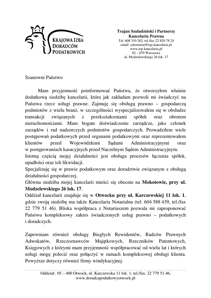 Trajan Szuladziński i Partnerzy Kancelaria Prawna Tel. 608 310 262, tel./fax 22 820 78 24 email: [email protected] www.tsp-kancelaria.pl 02 – 679 Warszawa ul. Modzelewskiego 26 lok. 17 Szanowni Państwo Mam przyjemność poinformować Państwa, że otworzyłem właśnie dodatkową siedzibę kancelarii, która jak zakładam pozwoli mi świadczyć na Państwa rzecz usługi prawne. Zajmuję się obsługą prawno – gospodarczą podmiotów z wielu branż, w szczególności wyspecjalizowałem się w obsłudze transakcji związanych z przekształceniami spółek oraz obrotem nieruchomościami. Mam bogate doświadczenie zarządcze, jako członek zarządów i rad nadzorczych podmiotów gospodarczych. Prowadziłem wiele postępowań podatkowych przed organami podatkowymi oraz reprezentowałem klientów przed Wojewódzkimi Sądami Administracyjnymi oraz w postępowaniach kasacyjnych przed Naczelnym Sądem Administracyjnym. Istotną częścią mojej działalności jest obsługa procesów łączenia spółek, upadłości oraz ich likwidacji. Specjalizuję się w prawie podatkowym oraz doradztwie związanym z obsługą działalności gospodarczej. Główna siedziba mojej kancelarii mieści się obecnie na Mokotowie, przy ul. Modzelewskiego 26 lok. 17. Oddział kancelarii znajduje się w Otwocku przy ul. Karczewskiej 11 lok. 1, gdzie swoją siedzibę ma także Kancelaria Notarialna (tel. 604 588 439, tel./fax 22 779 51 46). Bliska współpraca z Notariuszem pozwala mi zaproponować Państwu kompleksowy zakres świadczonych usług prawno – podatkowych i doradczych. Zapewniam również obsługę Biegłych Rewidentów, Radców Prawnych Adwokatów, Rzeczoznawców Majątkowych, Rzeczników Patentowych, Księgowych z którymi mam przyjemność współpracować od wielu lat i których usługi mogę polecić oraz połączyć w ramach kompleksowej obsługi klienta. Powyższe dotyczy również firmy windykacyjnej. Oddział:. 05 – 400 Otwock, ul. Karczewska 11 lok. 1, tel./fax. 22 779 51 46, www.doradcapodatkowyotwock.pl Główne obszary oferowanych usług doradztwa podatkowego, prawnego i gospodarczego: − Przekształcenia, aporty i tworzenie nowych podmiotów prawnych, − Prowadzenie negocjacji biznesowych, − Obrót nieruchomościami, − Optymalizacja podatkowa, − Dobór optymalnej formy prawnej dla prowadzonej działalności gospodarczej, − Opracowanie struktury korporacyjnej, − Reprezentowanie klientów w czynnościach sprawdzających, kontrolnych i w postępowaniu podatkowym, − Reprezentowanie klientów przed Wojewódzkim i Naczelnym Sądem Administracyjnym, − Przygotowywanie wniosków o interpretację indywidualną i ogólną wydawaną przez Ministra Finansów, − Przygotowanie umów z kontrahentami i umów o wzajemnej współpracy z ograniczeniem lub wyłączeniem skutków podatkowych, − Stała obsługa prawno – podatkowa, − Konsulting gospodarczy, − Audyt prawnopodatkowy, − Przygotowanie dokumentacji cen transferowych oraz umów i zasad rozliczeń pomiędzy podmiotami powiązanymi, − Usługi księgowe, − Odzyskiwanie należności, − Inne. W zakresie świadczonych usług proponuję umowy jednorazowe dotyczące rozwiązania konkretnego problemu, jak i stałą obsługę podmiotu. W zależności od sprawy wynagrodzenie może zostać ustalone w sposób zryczałtowany, jak i poprzez success fee (wynagrodzenie za sukces) obliczone od efektów mojej pracy. Zachęcam Państwa do kontaktu osobistego albo poprzez telefon lub email Szersza informacja o Kancelariach znajduje się na stronach internetowych www.tsp-kancelaria.pl i www.notariuszotwock.pl. Z poważaniem Trajan Szuladziński 2