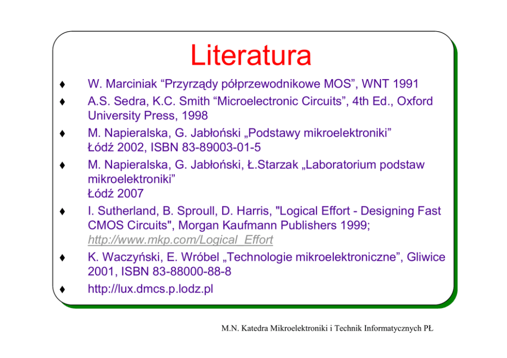 Literatura W. Marciniak “Przyrządy półprzewodnikowe MOS”, WNT 1991 A.S. Sedra, K.C. Smith “Microelectronic Circuits”, 4th Ed., Oxford University Press, 1998 M. Napieralska, G. Jabłoński „Podstawy mikroelektroniki” Łódź 2002, ISBN 83-89003-01-5 M. Napieralska, G. Jabłoński, Ł.Starzak „Laboratorium podstaw mikroelektroniki” Łódź 2007 I. Sutherland, B. Sproull, D. Harris, "Logical Effort - Designing Fast CMOS Circuits", Morgan Kaufmann Publishers 1999; http://www.mkp.com/Logical_Effort K. Waczyński, E. Wróbel „Technologie mikroelektroniczne”, Gliwice 2001, ISBN 83-88000-88-8 http://lux.dmcs.p.lodz.pl M.N. Katedra Mikroelektroniki i Technik Informatycznych PŁ Definicja marginesów szumów Vo VOH RóŜnica między min ampl.sygnału wyj bramki sterującej a min napięciem wej bramki obciąŜanej NMH NMH=VOH-VIH NML NML=VIL-VOL VI VIH VIL VOL Out bramki 1 In bramki 2 M.N. Katedra Mikroelektroniki i Technik Informatycznych PŁ Czasy propagacji M.N. Katedra Mikroelektroniki i Technik Informatycznych PŁ Jeśli dwa nMOS przełączniki są połączone szeregowo, między C1 i C2 utworzone zostanie połączenie tylko jeśli do A i B doprowadzimy sygnał '1'. Realizacja operacji AND M.N. Katedra Mikroelektroniki i Technik Informatycznych PŁ Jeśli dwa nMOS przełączniki są połączone równolegle, między C1 i C2 utworzone zostanie połączenie jeśli do któregokolwiek wejścia A lub B doprowadzimy sygnał '1'. Realizacja operacji OR M.N. Katedra Mikroelektroniki i Technik Informatycznych PŁ Jeśli dwa pMOS przełączniki są połączone szeregowo, między C1 i C2 utworzone zostanie połączenie tylko jeśli do A i B doprowadzimy sygnał ‘0'. Realizacja operacji AND zanegowanych wartości logicznych M.N. Katedra Mikroelektroniki i Technik Informatycznych PŁ Jeśli dwa pMOS przełączniki są połączone równolegle między C1 i C2 utworzone zostanie połączenie jeśli do któregokolwiek wejścia A lub B doprowadzimy sygnał ‘0'. Realizacja operacji OR zanegowanych wartości logicznych M.N. Katedra Mikroelektroniki i Technik Informatycznych PŁ Koncepcja bramki CMOS M.N. Katedra Mikroelektroniki i Technik Informatycznych PŁ bramka NAND - symulacja logiczna M.N. Katedra Mikroelektroniki i Technik Informatycznych PŁ bramka NOR - symulacja logiczna M.N. Katedra Mikroelektroniki i Technik Informatycznych PŁ Biorąc pod uwagę zachowanie pod wpływem pola elektrycznego dzielimy ciała stałe na: przewodniki izolatory półprzewodniki Własności elektryczne materiału zaleŜą od jego struktury atomowej i krystalicznej M.N. Katedra Mikroelektroniki i Technik Informatycznych PŁ Struktura energetyczna EF Poziom Fermiego pasmo walencyjne przewodnik półprzewodnik Eg~0.16aJ izolator Eg~1.6aJ M.N. Katedra Mikroelektroniki i Technik Informatycznych PŁ Poziom Fermiego • W półprzewodniku elektrony „podlegają” statystyce FermiegoDiraca. • Prawdopodobieństwo, Ŝe elektron posiada energię E : Ef - poziom Fermiego odpowiada energii, która w 0K oddziela pasma obsadzone i nieobsadzone • Wielkość charakterystyczna dla danego materiału M.N. Katedra Mikroelektroniki i Technik Informatycznych PŁ koncentracja nosnikow / przewodnictwo Efekt temperaturowy 1E+4 1E+3 1E+2 1E+1 1E+0 1E-1 1E-2 1E-3 1E-4 1E-5 1E-6 1E-7 1E-8 1E-9 1E-10 1E-11 1E-12 1E-13 1E-14 1E-15 1E-16 1E-17 1E-18 1/300 K 0.002 0.004 0.006 0.008 0.010 1/T (1/K) przewodnictwo samoistne silnie rośnie z temperaturą w zakresie od 100 (1/T=0.01) do 500K ( 1/T=0.002) zmienia się o kilkanaście rzędów wielkości M.N. Katedra Mikroelektroniki i Technik Informatycznych PŁ Półprzewodniki domieszkowane M.N. Katedra Mikroelektroniki i Technik Informatycznych PŁ Półprzewodniki domieszkowane Konsekwencje domieszkowania: krzem w temp. pokojowej ni=1.5*1010/cm3 – czyli w 300K mamy kT = 0.25eV >>0.048eV (energia wiązania w sieci krystalicznej krzemu 0.048eV) czyli wszystkie atomy domieszki utracą elektron nadmiarowy jeśli Nd będzie 105 razy większa niŜ ni – konduktywność materiału wzrośnie 100000 odpowiada to 1 atomowi donorowemu na 1 miliard atomów krzemu ρ = q(p-n+ND-NA) – gęstość ładunku przestrzennego w półprzewodniku niesamoistnym M.N. Katedra Mikroelektroniki i Technik Informatycznych PŁ Struktura energetyczna półprzewodnika Pasmo przewodnictwa Stany donorowe Eg Stany akceptorowe Pasmo walencyjne Poziom Fermiego w półprzewodniku typu n leŜy w pobliŜu pasma przewodnictwa, a w półprzewodniku typu p w pobliŜu pasma walencyjnego. JeŜeli połączymy ze sobą róŜne półprzewodniki energie Fermiego powinny się wyrównać. M.N. Katedra Mikroelektroniki i Technik Informatycznych PŁ Dlaczego tranzystor MOS ? Realizacja funkcji cyfrowych i analogowych Metal-Oxide-Semiconductor Field-Effect Transistor (MOSFET) jest kluczowym elementem technologii Complementary Metal-Oxide-Semiconductor (CMOS) element pamięci: Dynamic Random Access Memory (DRAM) i Flash Erasable Programmable Memory (EPROM) Przetwarzanie obrazów: Charge-Couple Device (CCD) wyświetlacze: Active-Matrix Liquid-Crystal Displays M.N. Katedra Mikroelektroniki i Technik Informatycznych PŁ Tranzystor MOS transfer resistor 1930 J. Lilienfend złoŜył patent dotyczący działania przyrządu polowego w USA (słabo przewodzący materiał umieszczony w polu elektrycznym będzie zmieniał swoje przewodnictwo pozwalając na uzyskanie efektu wzmocnienia) 1960 praktyczne wykonanie tranzystora polowego M.N. Katedra Mikroelektroniki i Technik Informatycznych PŁ Tranzystor MOS ang. Metal Oxide Semiconductor Tranzystory polowe: MOSFET, MIS, IGFET Bramka polikrzemowa Warstwa dielektryka Elektroda metalowa Wyspy drenu i źródła PodłoŜe półprzewodnikowe ρ podłoŜa 0.01 - 0.1Ωm koncentracja n+ 1024 - 1026 m-3 tox od kilku nm M.N. Katedra Mikroelektroniki i Technik Informatycznych PŁ Struktura MIS idealna Praca wyjścia metal-półprzewodnik = 0 Izolator idealny (konduktywność=0) Półprzewodnik jednorodnie 