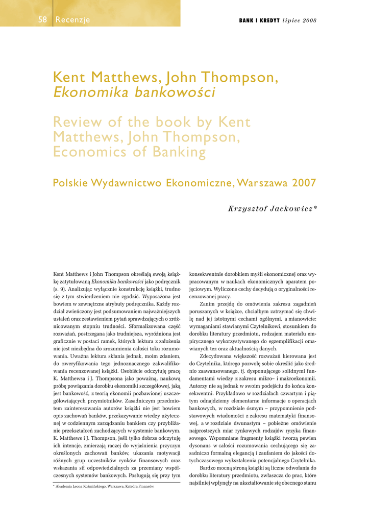 58 Recenzje Bank i K redyt lipiec 2008 Kent Matthews, John Thompson, Ekonomika bankowoÊci Review of the book by Kent Matthews, John Thompson, Economics of Banking Polskie Wydawnictwo Ekonomiczne, Warszawa 2007 Krzysztof Jackowicz* Kent Matthews i John Thompson określają swoją książkę zatytułowaną Ekonomika bankowości jako podręcznik (s. 9). Analizując wyłącznie konstrukcję książki, trudno się z tym stwierdzeniem nie zgodzić. Wyposażona jest bowiem w zewnętrzne atrybuty podręcznika. Każdy rozdział zwieńczony jest podsumowaniem najważniejszych ustaleń oraz zestawieniem pytań sprawdzających o zróżnicowanym stopniu trudności. Sformalizowana część rozważań, postrzegana jako trudniejsza, wyróżniona jest graficznie w postaci ramek, których lektura z założenia nie jest niezbędna do zrozumienia całości toku rozumowania. Uważna lektura skłania jednak, moim zdaniem, do zweryfikowania tego jednoznacznego zakwalifikowania recenzowanej książki. Osobiście odczytuję pracę K. Matthewsa i J. Thompsona jako poważną, naukową próbę powiązania dorobku ekonomiki szczegółowej, jaką jest bankowość, z teorią ekonomii pozbawionej uszczegółowiających przymiotników. Zasadniczym przedmiotem zainteresowania autorów książki nie jest bowiem opis zachowań banków, przekazywanie wiedzy użytecznej w codziennym zarządzaniu bankiem czy przybliżanie przekształceń zachodzących w systemie bankowym. K. Matthews i J. Thompson, jeśli tylko dobrze odczytuję ich intencje, zmierzają raczej do wyjaśnienia przyczyn określonych zachowań banków, ukazania motywacji różnych grup uczestników rynków finansowych oraz wskazania sił odpowiedzialnych za przemiany współczesnych systemów bankowych. Posługują się przy tym * Akademia Leona Koźmińskiego, Warszawa, Katedra Finansów konsekwentnie dorobkiem myśli ekonomicznej oraz wypracowanym w naukach ekonomicznych aparatem pojęciowym. Wyliczone cechy decydują o oryginalności recenzowanej pracy. Zanim przejdę do omówienia zakresu zagadnień poruszanych w książce, chciałbym zatrzymać się chwilę nad jej istotnymi cechami ogólnymi, a mianowicie: wymaganiami stawianymi Czytelnikowi, stosunkiem do dorobku literatury przedmiotu, rodzajem materiału empirycznego wykorzystywanego do egzemplifikacji omawianych tez oraz aktualnością danych. Zdecydowana większość rozważań kierowana jest do Czytelnika, którego pozwolę sobie określić jako średnio zaawansowanego, tj. dysponującego solidnymi fundamentami wiedzy z zakresu mikro– i makroekonomii. Autorzy nie są jednak w swoim podejściu do końca konsekwentni. Przykładowo w rozdziałach czwartym i piątym odnajdziemy elementarne informacje o operacjach bankowych, w rozdziale ósmym – przypomnienie podstawowych wiadomości z zakresu matematyki finansowej, a w rozdziale dwunastym – pobieżne omówienie najprostszych miar rynkowych rodzajów ryzyka finansowego. Wspomniane fragmenty książki tworzą pewien dysonans w całości rozumowania cechującego się zasadniczo formalną elegancją i zaufaniem do jakości dotychczasowego wykształcenia potencjalnego Czytelnika. Bardzo mocną stroną książki są liczne odwołania do dorobku literatury przedmiotu, zwłaszcza do prac, które najsilniej wpłynęły na ukształtowanie się obecnego stanu B a n k i Kr e dy t l i p i e c 2 0 0 8 wiedzy. W tym sensie książka może stanowić swoistego rodzaju przewodnik dla osób rozpoczynających samodzielne studia literaturowe i poszukujących artykułów o podstawowym znaczeniu dla danego zagadnienia. Autorzy dbają przy tym o obiektywność w referowaniu rezultatów dociekań teoretycznych i empirycznych. W zakresie doboru i oceny omawianych pozycji literatury przedmiotu chciałbym zgłosić jedynie dwa zastrzeżenia. W rozdziale trzecim, poświęconym prezentacji teorii pośrednictwa finansowego, a więc wyjaśnieniu m.in. przyczyn istnienia banków, brak jest odwołania do krytyki tradycyjnych podejść opartych na pojęciach kosztów transakcyjnych oraz asymetrii informacyjnej. Jako szczególnie istotna luka merytoryczna może być odebrane pominięcie artykułu F. Allena i A.M. Santomero (1998), którzy sformułowali tezę, że w obecnych realiach gospodarczych istnienie pośredników finansowych uzasadniają przede wszystkim ich funkcje związane z zarządzaniem ryzykiem, a więc: ułatwianie transferu ryzyka i obniżanie kosztów partycypacji. Praca F. Allena i A.M. Santomero istotnie ożywiła dyskusję na temat właściwego kształtu teorii pośrednictwa finansowego. Przykładem polemiki z częścią ocen wyrażonych przez F. Allena i A.M. Santomero jest artykuł B. Sholtensa i D. van Wensveena (2000). W rozdziale ósmym natomiast autorzy książki dezawuują wymowę badań potwierdzających występowanie zjawiska racjonowania kredytów. Stwierdzają bowiem, że tego rodzaju badania powstają na zamówienie rządu lub grup interesów. Nie jestem specjalistą w zakresie racjonowania kredytu i trudno mi jednoznacznie sprzeciwić się osądowi wyrażonemu przez autorów książki. Wydaje się jednak mało prawdopodobne, by dość liczne w literaturze przedmiotu prace potwierdzające występowanie racjonowania kredytu, publikowane przez różne czasopisma, wykorzystujące dane z bardzo różnych rynków, np. amerykańskiego (Perez 1998; Ambrose, Pennington-Cross, Yezer 2002), polskiego (Petrick 2004) i tajwańskiego (Shen 2002), były nierzetelne naukowo. Książka jest pisana z perspektywy rozwiniętego systemu bankowego. Z tego rodzaju systemów pochodzi zdecydowana większość przytaczanych danych empirycznych. W sytuacji, gdy autorzy posiłkują się przykładami z historii gospodarczej, najczęściej dotyczą one Wielkiej Brytanii i Stanów Zjednoczonych. Powstaje zatem pytanie, na ile czynnik ten ogranicza użyteczność książki dla polskiego Czytelnika. W mojej opinii obecnie jedynie w niewielkim stopniu. Nie sposób wprawdzie zaprzeczyć
