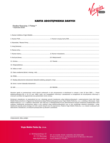 * niepotrzebne skreślić 1. Numer telefonu Virgin Mobile............................................................................................................................................................... 2. Numer PUK.........................................................................3. Numer seryjny karty SIM........................................................................ 4. Nazwisko / Nazwa firmy......................................................................................................................................................................... 5. Imię (Imiona).......................................................................................................................................................................................... 6. Nazwa ulicy............................................................................................................................................................................................. 7. Numer domu......................................................................8. Numer mieszkania.................................................................................. 9. Kod pocztowy....................................................................10. Miejscowość........................................................................................... 11. Gmina..............................................................................12. Powiat.................................................................................................... 13. Województwo...................................................................................................................................................................................... 14. Adres e-mail......................................................................................................................................................................................... 15. Data urodzenia (dzień, miesiąc, rok).................................................................................................................................................... 16. PESEL.................................................................................................................................................................................................... 17. Rodzaj dokumentu tożsamości (dowód osobisty, paszport, inny)........................................................................................................ 18. Seria i numer dowodu tożsamości....................................................................................................................................................... 19. NIP...................................................................................20. REGON.................................................................................................... Wyrażam zgodę na przetwarzanie moich danych osobowych w celu otrzymywania w określonych w ustawie z dnia 16 lipca 2004 r. – Prawo telekomunikacyjne (Dz. U. Nr 171 poz. 1800 z późn. zm.) przypadkach informacji i zawiadomień w szczególności do otrzymywania informacji o zmianach cenników lub regulaminów oraz potwierdzeń zmian umowy. Niniejszym oświadczam, że zapoznałem/-am się i akceptuję warunki świadczenia usług telekomunikacyjnych z wykorzystaniem Karty SIM Virgin Mobile Polska określone w Regulaminie Świadczenia Usług Telekomunikacyjnych przez Virgin Mobile Polska Sp. z o.o. z siedzibą w Warszawie. Virgin Mobile Polska Sp. z o.o. z siedzibą w Warszawie (02-724) przy ul. Wołodyjowskiej 42 jest administratorem danych osobowych Użytkowników. Dane osobowe Użytkownika przetwarzane będą w celu realizacji usług telekomunikacyjnych oraz w celu marketingu własnych produktów i usług. Użytkownik posiada prawo dostępu do treści swoich danych oraz ich poprawiania. Podanie Virgin Mobile Polska Sp. z o.o. danych osobowych jest dobrowolne. Oświadczam, że wskazane powyżej dane są aktualne i prawdziwe. _________________________________________ miejscowość, data, podpis