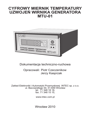 CYFROWY MIERNIK TEMPERATURY UZWOJEÑ WIRNIKA GENERATORA MTU-01 Dokumentacja techniczno-ruchowa Opracowali: Piotr Czeczenikow Jerzy Kasprzak Zak³ad Elektroniki i Automatyki Przemys³owej INTEC sp. z o.o. ul. Bacciarellego 54, 51-649 Wroc³aw tel. 71 348 18 18, fax. 71 348 15 15, www.intec.com.pl Wroc³aw 2010 SPIS TREŚCI Zastosowanie .............................................................................................. 1 Parametry techniczne ................................................................................. 1 Budowa ....................................................................................................... 2 Zasada działania ......................................................................................... 3 Przetworniki separujące napięcia i prądu ................................................... 3 Instrukcja obsługi ........................................................................................ 5 Kontrola dokładności miernika temperatury .............................................. 8 Instrukcja instalacji ..................................................................................... 9 ZASTOSOWANIE Cyfrowy Miernik Temperatury Uzwojeń Wirnika Generatora MTU-01 służy do pomiaru średniej temperatury uzwojeń wirnika metodą pośrednią poprzez pomiar zmian rezystancji uzwojeń. Rezystancja uzwojeń wirnika określana jest poprzez pomiar napięcia i prądu wzbudzenia. Miernik MTU-01 współpracuje z przetwornikami separacyjnymi napięcia WSU-01 i prądu WSI-01, umieszczonymi w szafie układu wzbudzenia generatora. Przetworniki zamieniają napięcie i prąd wzbudzenia generatora na sygnały standardowe 0÷20 mA. Producent dostarcza przetworniki w komplecie z miernikiem. Miernik MTU-01 posiada wymiary typowego miernika tablicowego, montuje się go na tablicy pomiarowej operatora turbozespołu. Wartość mierzonej temperatury jest obrazowana w postaci cyfrowej na wyświetlaczu LED. Dodatkowo jest ona podawana na wyjście analogowe miernika 0÷20 mA lub 4÷20 mA z własnym zasilaniem. Wyjście analogowe można podłączyć do rejestratora lub do systemu komputerowego. Parametry techniczne Zakres pomiarowy 0÷150°C Dokładność pomiaru 2% Rozdzielczość 1°C Stała czasowa filtru analogowego 3s Ilość próbek do wyliczenia wartości średniej 50 Sygnał wejściowy 0÷20 mA Wyjście 0÷20 mA lub 4÷20 mA (z zasilaniem wewnętrznym) Napięcie zasilania 220 VAC ±20%, 50 Hz Pobór mocy 15 VA Wymiary 135 x 65 x 165 mm Masa 0.45 kg Temperatura pracy 0÷55°C Dodatkowe parametry wskazywane przez miernik 0÷999 V Napięcie wzbudzenia - Uw 0÷9999 A Prąd wzbudzenia - Iw 0÷100°C Temperatura wodoru* Wprowadzane dane Rezystancja uzwojeń w stanie zimnym - Rz 0÷999.9 mW 0÷999 °C Temperatura uzwojeń w stanie zimnym - Tz *) Funkcja na zamówienie -1- 165 O C CYFROWY MIERNIK TEMPERATURY UZWOJEŃ WIRNIKA GENERATORA TEST 8 65×135 70 140 MTU-01 Rysunek 1. Wymiary MTU-01. BUDOWA Miernik MTU-01 zbudowany jest z trzech podstawowych bloków: 1. Blok układów pomiarowych Blok ten filtruje sygnały wejściowe i standaryzuje je dla wewnętrznych potrzeb urządzenia. Za pomocą multipleksera i scalonego przetwornika A/C typu ICL 7109 mierzone są sygnały: prądowy i napięciowy. Sygnał wyjściowy formowany jest przy pomocy układu C/A typu MAX 7545 i przetwornika napięcie/prąd. W skład bloku układów pomiarowych wchodzi także pamięć EEPROM i zasilacz dostarczający napięć ±5 V, ±15 V dla potrzeb układu pomiarowego i sterowania. 2. Blok procesora Blok ten odpowiedzialny jest za sterowanie układem pomiarowym, odczyt wielkości zmierzonych i wysterowanie wyjścia. Wielkości zmierzone i wprowadzone parametry generatora służą blokowi procesora do wyliczenia średniej temperatury uzwojeń wirnika generatora. Blok procesora steruje także wyświetlaczem i odczytuje stan przycisków płyty czołowej. Blok ten zbudowany jest w oparciu o mikrokontroler typu SIEMENS 80C535. 3. Blok płyty czołowej Blok ten pozwala wyświetlić zebrane informacje na polu odczytowym zbudowanym z siedmiosegmentowych wyświetlaczy LED - 5 pozycji. Blok ten wyposażony jest także w trzy przyciski dostępne na płycie czołowej. Dwa z nich, ukryte w otworach, służą do programowania parametrów charakterystycznych generatora. Przycisk TEST, będący w zasadzie przyciskiem RESET, zeruje miernik i rozpoczyna cykl pracy od początku. Wpisane ustawienia nie ulegają zniszczeniu. -2- ZASADA DZIAŁANIA Pomiar średniej temperatury uzwojeń wirnika generatora odbywa się na zasadzie pomiaru oporności tego uzwojenia. Oporność ta zmienia się z temperaturą wg zależności: 242 + Tw (1) Rw=Rz 242 + Tz gdzie: Rw- rezystancja uzwojeń generatora w temperaturze Tw, Rz- rezystancja uzwojeń generatora w stanie zimnym w temperaturze Tz, 242 - współczynnik temperaturowy rezystancji miedzi - srebro. Blok procesora dzieli zmierzoną wartość napięcia wzbudzenia przez mierzony prąd płynący przez uzwojenie wirnika. Rw= Uw Iw (2) Rezystancję Rz i temperaturę Tz wprowadza się jako wartości charakterystyczne (zmierzone)danego generatora. Ostatecznie z (1) i (2) otrzymujemy wzór na temperaturę uzwojeń wirnika generatora: Tw= Uw / Iw (242 + Tz) - 242 Rz (3) Dokładność pomiaru: Na błąd pomiaru temperatury uzwojeń wirnika generatora wynoszący sumarycznie mniej niż 2% składają się następujące składniki: 1) błąd wynikający z niedokładności pomiaru napięcia i prądu 0.2% 2) błąd wynikający z niedokładności obliczeń numerycznych 0.1% 3) błąd spowodowany wpływem spadku napięcia na szczotkach wirnika 1% 4) błąd wynikający z nieliniowości funkcji R=f(t) 0.5% 5) błąd spowodowany składową zmienną prądu wzbudzenia generatora 0.2% PRZETWORNIKI SEPARUJĄCE NAPIĘCIA I PRĄDU Przetworniki separujące napięcia i prądu WSU-01 i WSI-01 dopasowują miernik temperatury wirnika generatora MTU-01 do parametrów obwodu wzbudzenia, sta