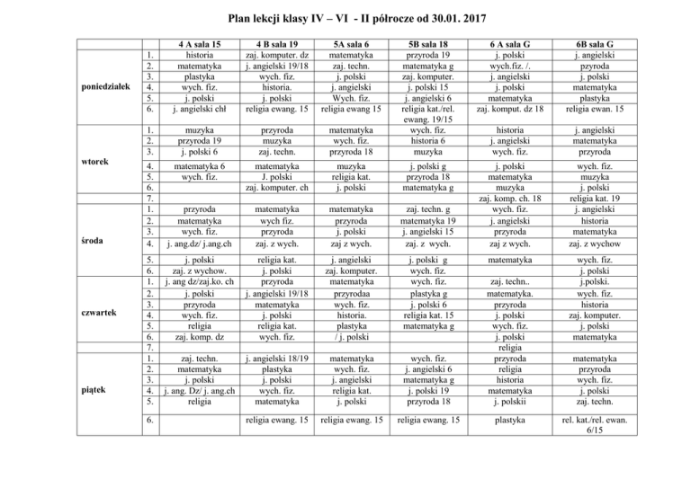 Plan lekcji klasy IV – VI - II półrocze od 30.01. 2017 poniedziałek wtorek środa czwartek piątek 1. 2. 3. 4. 5. 6. 4 A sala 15 historia matematyka plastyka wych. fiz. j. polski j. angielski chł 4 B sala 19 zaj. komputer. dz j. angielski 19/18 wych. fiz. historia. j. polski religia ewang. 15 5A sala 6 matematyka zaj. techn. j. polski j. angielski Wych. fiz. religia ewang 15 1. 2. 3. muzyka przyroda 19 j. polski 6 przyroda muzyka zaj. techn. 4. 5. 6. 7. 1. 2. 3. 4. matematyka 6 wych. fiz. 5. 6. 1. 2. 3. 4. 5. 6. 7. 1. 2. 3. 4. 5. 6. 6 A sala G j. polski wych.fiz. /. j. angielski j. polski matematyka zaj. komput. dz 18 6B sala G j. angielski pzyroda j. polski matematyka plastyka religia ewan. 15 matematyka wych. fiz. przyroda 18 5B sala 18 przyroda 19 matematyka g zaj. komputer. j. polski 15 j. angielski 6 religia kat./rel. ewang. 19/15 wych. fiz. historia 6 muzyka historia j. angielski wych. fiz. j. angielski matematyka przyroda matematyka J. polski zaj. komputer. ch muzyka religia kat. j. polski j. polski g przyroda 18 matematyka g przyroda matematyka wych. fiz. j. ang.dz/ j.ang.ch matematyka wych fiz. przyroda zaj. z wych. matematyka przyroda j. polski zaj z wych. zaj. techn. g matematyka 19 j. angielski 15 zaj. z wych. j. polski matematyka muzyka zaj. komp. ch. 18 wych. fiz. j. angielski przyroda zaj z wych. wych. fiz. muzyka j. polski religia kat. 19 j. angielski historia matematyka zaj. z wychow j. polski zaj. z wychow. j. ang dz/zaj.ko. ch j. polski przyroda wych. fiz. religia zaj. komp. dz religia kat. j. polski przyroda j. angielski 19/18 matematyka j. polski religia kat. wych. fiz. j. angielski zaj. komputer. matematyka przyrodaa wych. fiz. historia. plastyka / j. polski j. polski g wych. fiz. wych. fiz. plastyka g j. polski 6 religia kat. 15 matematyka g matematyka zaj. techn. matematyka j. polski j. ang. Dz/ j. ang.ch religia j. angielski 18/19 plastyka j. polski wych. fiz. matematyka matematyka wych. fiz. j. angielski religia kat. j. polski wych. fiz. j. angielski 6 matematyka g j. polski 19 przyroda 18 zaj. techn.. matematyka. przyroda j. polski wych. fiz. j. polski religia przyroda religia historia matematyka j. polskii wych. fiz. j. polski j.polski. wych. fiz. historia zaj. komputer. j. polski matematyka religia ewang. 15 religia ewang. 15 religia ewang. 15 plastyka matematyka przyroda wych. fiz. j. polski zaj. techn. rel. kat./rel. ewan. 6/15