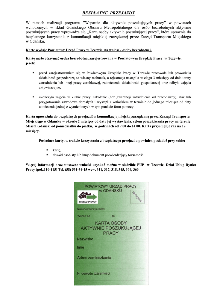 BEZPŁATNE PRZEJAZDY W ramach realizacji programu ”Wsparcie dla aktywnie poszukujących pracy” w powiatach wchodzących w skład Gdańskiego Obszaru Metropolitalnego dla osób bezrobotnych aktywnie poszukujących pracy wprowadza się „Kartę osoby aktywnie poszukującej pracy”, która uprawnia do bezpłatnego korzystania z komunikacji miejskiej zarządzanej przez Zarząd Transportu Miejskiego w Gdańsku. Kartę wydaje Powiatowy Urząd Pracy w Tczewie, na wniosek osoby bezrobotnej. Kartę może otrzymać osoba bezrobotna, zarejestrowana w Powiatowym Urzędzie Pracy w Tczewie, jeżeli: przed zarejestrowaniem się w Powiatowym Urzędzie Pracy w Tczewie pracowała lub prowadziła działalność gospodarczą na własny rachunek, a rejestracja nastąpiła w ciągu 3 miesięcy od dnia utraty zatrudnienia lub innej pracy zarobkowej, zakończenia działalności gospodarczej oraz odbyła zajęcia aktywizacyjne; ukończyła zajęcia w klubie pracy, szkolenie (bez gwarancji zatrudnienia od pracodawcy), staż lub przygotowanie zawodowe dorosłych i wystąpi z wnioskiem w terminie do jednego miesiąca od daty ukończenia jednej z wymienionych w tym punkcie form pomocy. Karta upoważnia do bezpłatnych przejazdów komunikacją miejską zarządzaną przez Zarząd Transportu Miejskiego w Gdańsku w okresie 2 miesięcy od daty jej wystawienia, celem poszukiwania pracy na terenie Miasta Gdańsk, od poniedziałku do piątku, w godzinach od 9.00 do 14.00. Karta przysługuje raz na 12 miesięcy. Posiadacz karty, w trakcie korzystania z bezpłatnego przejazdu powinien posiadać przy sobie: kartę, dowód osobisty lub inny dokument potwierdzający tożsamość. Więcej informacji oraz stosowne wnioski uzyskać można w siedzibie PUP w Tczewie, Dział Usług Rynku Pracy (pok.110-115) Tel. (58) 531-34-15 wew. 311, 317, 318, 345, 364, 366