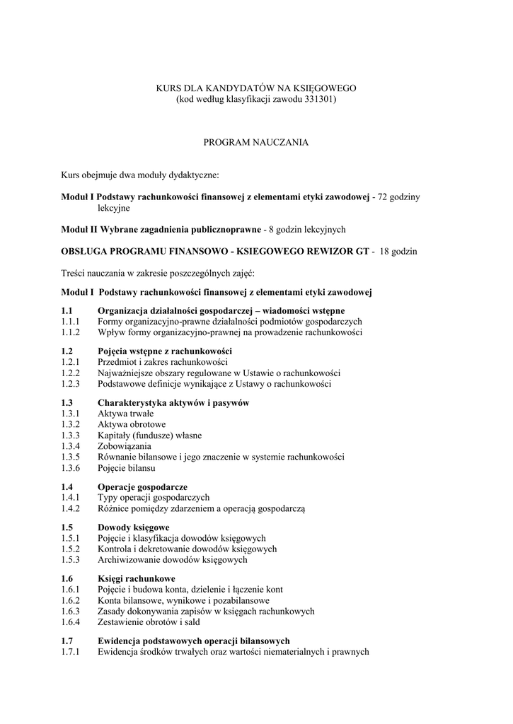 KURS DLA KANDYDATÓW NA KSIĘGOWEGO (kod według klasyfikacji zawodu 331301) PROGRAM NAUCZANIA Kurs obejmuje dwa moduły dydaktyczne: Moduł I Podstawy rachunkowości finansowej z elementami etyki zawodowej - 72 godziny lekcyjne Moduł II Wybrane zagadnienia publicznoprawne - 8 godzin lekcyjnych OBSŁUGA PROGRAMU FINANSOWO - KSIEGOWEGO REWIZOR GT - 18 godzin Treści nauczania w zakresie poszczególnych zajęć: Moduł I Podstawy rachunkowości finansowej z elementami etyki zawodowej 1.1 1.1.1 1.1.2 Organizacja działalności gospodarczej – wiadomości wstępne Formy organizacyjno-prawne działalności podmiotów gospodarczych Wpływ formy organizacyjno-prawnej na prowadzenie rachunkowości 1.2 1.2.1 1.2.2 1.2.3 Pojęcia wstępne z rachunkowości Przedmiot i zakres rachunkowości Najważniejsze obszary regulowane w Ustawie o rachunkowości Podstawowe definicje wynikające z Ustawy o rachunkowości 1.3 1.3.1 1.3.2 1.3.3 1.3.4 1.3.5 1.3.6 Charakterystyka aktywów i pasywów Aktywa trwałe Aktywa obrotowe Kapitały (fundusze) własne Zobowiązania Równanie bilansowe i jego znaczenie w systemie rachunkowości Pojęcie bilansu 1.4 1.4.1 1.4.2 Operacje gospodarcze Typy operacji gospodarczych Różnice pomiędzy zdarzeniem a operacją gospodarczą 1.5 1.5.1 1.5.2 1.5.3 Dowody księgowe Pojęcie i klasyfikacja dowodów księgowych Kontrola i dekretowanie dowodów księgowych Archiwizowanie dowodów księgowych 1.6 1.6.1 1.6.2 1.6.3 1.6.4 Księgi rachunkowe Pojęcie i budowa konta, dzielenie i łączenie kont Konta bilansowe, wynikowe i pozabilansowe Zasady dokonywania zapisów w księgach rachunkowych Zestawienie obrotów i sald 1.7 1.7.1 Ewidencja podstawowych operacji bilansowych Ewidencja środków trwałych oraz wartości niematerialnych i prawnych 1.7.2 1.7.3 1.7.4 Ewidencja zapasów, należności i środków pieniężnych Ewidencja kapitałów (funduszy) własnych Ewidencja zobowiązań 1.8 1.8.1 1.8.2 1.8.3 1.8.4 1.8.5 1.8.6 Ewidencja podstawowych operacji wynikowych Ewidencja przychodów ze sprzedaży działalności operacyjnej Ewidencja kosztów według rodzajów Ewidencja kosztów według miejsc powstawania Ewidencja kosztów i przychodów pozostałej działalności operacyjnej Ewidencja kosztów i przychodów działalności finansowej Ewidencja wyników nadzwyczajnych i podatku dochodowego 1.9 1.9.1 1.9.2 1.9.3 Zasady ustalania wyniku finansowego Elementy kształtujące wynik finansowy Etapy i metody ustalania wyniku finansowego Pojęcie rachunku zysków i strat 1.10 Sprawozdanie finansowe jednostek mikro i małych w rozumieniu ustawy o rachunkowości (załącznik nr 4 i 5 ustawy) Bilans Rachunek zysków i strat Informacja dodatkowa 1.10.1 1.10.2 1.10.3 1.11 Zadanie kompleksowe (od bilansu otwarcia do bilansu zamknięcia i rachunku zysków i strat) 1.12 1.12.1 1.12.2 1.12.3 1.12.4 1.12.5 Podstawy etyki w działalności gospodarczej i zawodowej Współczesne pojęcie etyki Etyka i biznes Etyka w systemie gospodarczym Etyka w działalności przedsiębiorstw Etyka zawodowa jednostki 1.13 1.13.1 1.13.2 Wykorzystanie programów komputerowych w prowadzeniu ksiąg rachunkowych Sprzęt komputerowy i oprogramowanie Bezpieczeństwo i ochrona danych Moduł II Wybrane zagadnienia publicznoprawne 2.1. 2.1.1 2.1.2 System podatkowy w Polsce i Ordynacja podatkowa Charakterystyka podatków obowiązujących w Polsce Najważniejsze obszary regulowane w Ordynacji podatkowej 2.2 VAT – ogólne zasady podatku 2.3 Podatki dochodowe – formy opodatkowania działalności gospodarczej 2.4 Ewidencja podatkowa i zasady prowadzenia ksiąg podatkowych 2.5 Ogólne zasady naliczania podatków i opłat obciążających przedsiębiorstwa 2.6 Podstawy rozliczeń z Zakładem Ubezpieczeń Społecznych OBSŁUGA PROGRAMU FINANSOWO - KSIĘGOWEGO REWIZOR GT 2