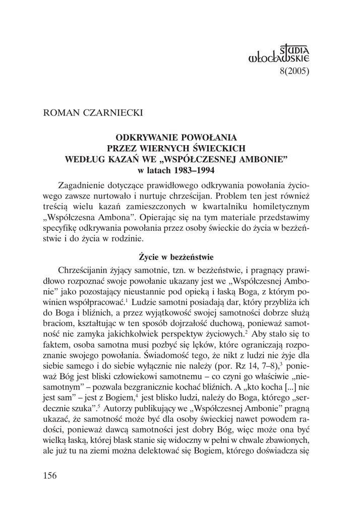 8(2005) ROMAN CZARNIECKI ODKRYWANIE POWOŁANIA PRZEZ WIERNYCH ŚWIECKICH WEDŁUG KAZAŃ WE „WSPÓŁCZESNEJ AMBONIE” w latach 1983–1994 Zagadnienie dotyczące prawidłowego odkrywania powołania życiowego zawsze nurtowało i nurtuje chrześcijan. Problem ten jest również treścią wielu kazań zamieszczonych w kwartalniku homiletycznym „Współczesna Ambona”. Opierając się na tym materiale przedstawimy specyfikę odkrywania powołania przez osoby świeckie do życia w bezżeństwie i do życia w rodzinie. Życie w bezżeństwie Chrześcijanin żyjący samotnie, tzn. w bezżeństwie, i pragnący prawidłowo rozpoznać swoje powołanie ukazany jest we „Współczesnej Ambonie” jako pozostający nieustannie pod opieką i łaską Boga, z którym powinien współpracować.1 Ludzie samotni posiadają dar, który przybliża ich do Boga i bliźnich, a przez wyjątkowość swojej samotności dobrze służą braciom, kształtując w ten sposób dojrzałość duchową, ponieważ samotność nie zamyka jakichkolwiek perspektyw życiowych.2 Aby stało się to faktem, osoba samotna musi pozbyć się lęków, które ograniczają rozpoznanie swojego powołania. Świadomość tego, że nikt z ludzi nie żyje dla siebie samego i do siebie wyłącznie nie należy (por. Rz 14, 7–8),3 ponieważ Bóg jest bliski człowiekowi samotnemu – co czyni go właściwie „niesamotnym” – pozwala bezgranicznie kochać bliźnich. A „kto kocha [...] nie jest sam” – jest z Bogiem,4 jest blisko ludzi, należy do Boga, którego „serdecznie szuka”.5 Autorzy publikujący we „Współczesnej Ambonie” pragną ukazać, że samotność może być dla osoby świeckiej nawet powodem radości, ponieważ dawcą samotności jest dobry Bóg, więc może ona być wielką łaską, której blask stanie się widoczny w pełni w chwale zbawionych, ale już tu na ziemi można delektować się Bogiem, którego doświadcza się 156 „sam na sam”. Podkreślają jednak, że Bóg powołuje człowieka do życia we wspólnocie, a chrześcijanin powinien być świadomy, że podobnie jak inni w Kościele jest powołany do świętości, aby przede wszystkim podobać się Bogu,6 wypełniając w ten sposób nakaz Jezusa (Mt 5, 48). Prędzej czy później samotność budzi różnego rodzaju wątpliwości i pytania. Lekarstwem na wszelkie obawy i rozterki „samotnika”, według kazań drukowanych we „Współczesnej Ambonie”, jest jego własna troska o Dom Ojca i zrozumienie, że prawdziwym powołaniem jest sama służba Bogu i nieustanne przebywanie w „świętości ducha”, która prowadzi do tego, że chrześcijanin staje się wolnym świadkiem Chrystusa, na wzór Syna Bożego, pełnego łaski, chwały i człowieczeństwa.7 Z obecnością ludzi samotnych w Kościele łączy się problem dziewictwa zalecanego przez Zbawiciela (Mk 10; Mt 5, 8; 19, 10–12; Łk 11, 27–28; 18, 28–30; 23, 28–31; por. np. Syr 26, 15; Flp 4, 8). Z analizowanych kazań wnioskujemy, że dziewictwo jest szlachetnym wyrzeczeniem podjętym ze względu na Królestwo niebieskie; jest oddaniem się Bogu i ludziom w służbie nadchodzącego Królestwa Bożego. W dziewictwie, podobnie jak w małżeństwie, ujawnia się prawda o człowieku i jego istnieniu. Dziewictwo jest skarbem bardzo ważnym i musi być prawidłowo wykorzystane, aby nie było powodem wyrzutów związanych z niepewnością wyboru drogi życiowej. Dlatego dziewictwo Maryi jest zachętą dla „zdecydowanych”, którzy wyrzekają się małżeństwa, ślubują czystość, aby poświęcić się w pełni ojcostwu czy macierzyństwu duchowemu.8 To znaczy, że osoba bezżenna, wyrzekająca się dla Boga płodności fizycznej, staje się płodna duchowo, dla wielu stając się rodzicem, ponieważ otwiera swoje serce i spieszy z pomocą potrzebującym.9 Wokół takiej osoby powstaje przestrzeń zaufania i wolności; przestrzeń „obrazu Bożego” (por. Rdz 2, 18).10 Serce takiego człowieka, według kazań „Współczesnej Ambony”, zapala się w wolności do miłowania Boga i ludzi.11 W dziewictwie chrześcijanin trwa, czekając na eschatyczne zaślubiny Chrystusa z Kościołem.12 Ponadto dziewictwo jest „współżyciem duchowym z Bogiem”;13 podobne jest do zaręczyn mistycznych, co na drodze do świętości chrześcijańskiej jest powtórzeniem doskonałości Chrystusa i Maryi.14 Dziewictwo świadczy o tym, że Królestwo Boże i jego sprawiedliwość są najcenniejszą perłą, której człowiek powinien szukać jako jedynej wartości ostatecznej i dla której gotów jest podjąć jedno z największych wyrzeczeń – zrezygnować z własnej, zaspokajanej seksualności. Odkrywanie swojej drogi powołania życiowego w bezżeństwie ma wspólną cechę z pozostałymi drogami życiowymi, mianowicie to, że po- 157 słannictwo dostaje się od Boga na osobności (por. Mojżesz, Prorocy, Jan Chrzciciel). Chrześcijanin w samotności, co nie oznacza jednak wyalienowania ze społeczeństwa, spotyka siebie w prawdzie, aby dowiedzieć się, gdzie zaczyna się jego droga i dokąd prowadzi.15 By to dostrzec, musi w swej samotności spotkać się też z Bogiem, kontemplując Jego obecność, co znowu pozwoli mu naprostować własne drogi (por. Mk 1, 3); musi zawrzeć pokój z Bogiem i samym sobą, zaprowadzić ład i porządek w życiu, zachować „dziewictwo wewnętrzne”, tak by owocować w sposób prawidłowy dla świata – „na zewnątrz” – tj. służyć innym pomocą lub uprawiać naukę czy twórczość artystyczną itp. (por. Łk 1, 38).16 W ten sposób chrześcijanin staje się w pełni człowiekiem nawet w stanie wolnym, za co jest również odpowiedzialny przed Bogiem;17 staje się wierny swemu powołaniu, czym okazuje swoją wierność Bogu (2Tm 3, 16; Rdz 18, 19).18 Wypełnia wolę Bożą19 i kroczy ku doskonałości, ujawniając zarazem miłość chrześcijańską,20 czyli stan ducha, w którym Chrystus wzrasta w jego sercu.21 Chrześcijanin jest wówczas