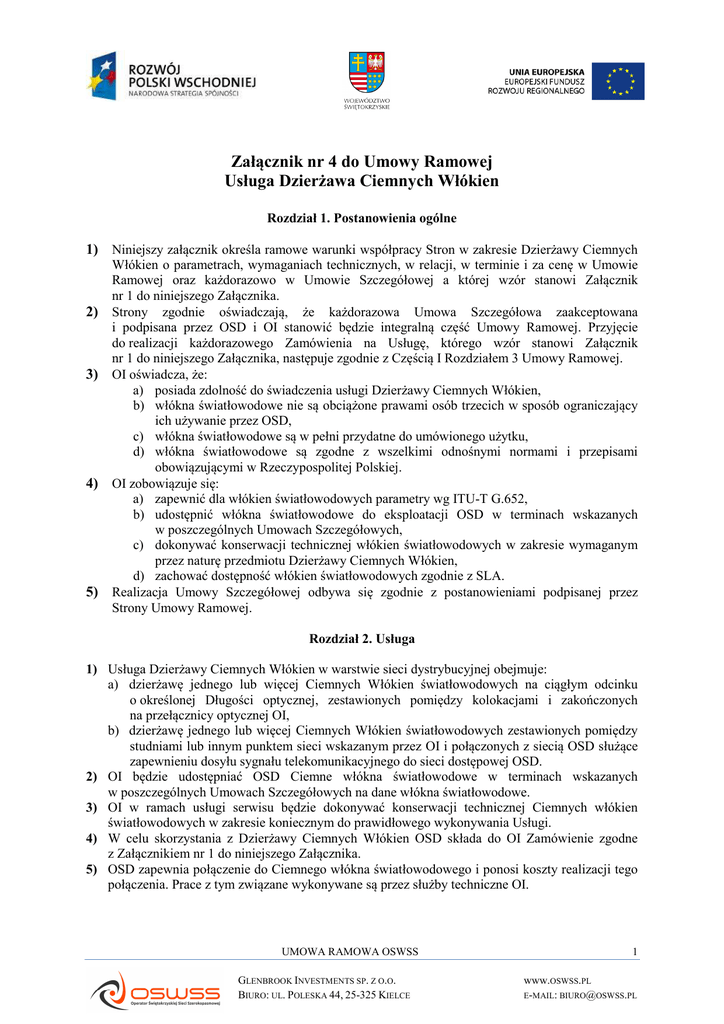 Załącznik nr 4 do Umowy Ramowej Usługa Dzierżawa Ciemnych Włókien Rozdział 1. Postanowienia ogólne 1) Niniejszy załącznik określa ramowe warunki współpracy Stron w zakresie Dzierżawy Ciemnych 2) 3) 4) 5) Włókien o parametrach, wymaganiach technicznych, w relacji, w terminie i za cenę w Umowie Ramowej oraz każdorazowo w Umowie Szczegółowej a której wzór stanowi Załącznik nr 1 do niniejszego Załącznika. Strony zgodnie oświadczają, że każdorazowa Umowa Szczegółowa zaakceptowana i podpisana przez OSD i OI stanowić będzie integralną część Umowy Ramowej. Przyjęcie do realizacji każdorazowego Zamówienia na Usługę, którego wzór stanowi Załącznik nr 1 do niniejszego Załącznika, następuje zgodnie z Częścią I Rozdziałem 3 Umowy Ramowej. OI oświadcza, że: a) posiada zdolność do świadczenia usługi Dzierżawy Ciemnych Włókien, b) włókna światłowodowe nie są obciążone prawami osób trzecich w sposób ograniczający ich używanie przez OSD, c) włókna światłowodowe są w pełni przydatne do umówionego użytku, d) włókna światłowodowe są zgodne z wszelkimi odnośnymi normami i przepisami obowiązującymi w Rzeczypospolitej Polskiej. OI zobowiązuje się: a) zapewnić dla włókien światłowodowych parametry wg ITU-T G.652, b) udostępnić włókna światłowodowe do eksploatacji OSD w terminach wskazanych w poszczególnych Umowach Szczegółowych, c) dokonywać konserwacji technicznej włókien światłowodowych w zakresie wymaganym przez naturę przedmiotu Dzierżawy Ciemnych Włókien, d) zachować dostępność włókien światłowodowych zgodnie z SLA. Realizacja Umowy Szczegółowej odbywa się zgodnie z postanowieniami podpisanej przez Strony Umowy Ramowej. Rozdział 2. Usługa 1) Usługa Dzierżawy Ciemnych Włókien w warstwie sieci dystrybucyjnej obejmuje: a) dzierżawę jednego lub więcej Ciemnych Włókien światłowodowych na ciągłym odcinku o określonej Długości optycznej, zestawionych pomiędzy kolokacjami i zakończonych na przełącznicy optycznej OI, b) dzierżawę jednego lub więcej Ciemnych Włókien światłowodowych zestawionych pomiędzy studniami lub innym punktem sieci wskazanym przez OI i połączonych z siecią OSD służące zapewnieniu dosyłu sygnału telekomunikacyjnego do sieci dostępowej OSD. 2) OI będzie udostępniać OSD Ciemne włókna światłowodowe w terminach wskazanych w poszczególnych Umowach Szczegółowych na dane włókna światłowodowe. 3) OI w ramach usługi serwisu będzie dokonywać konserwacji technicznej Ciemnych włókien światłowodowych w zakresie koniecznym do prawidłowego wykonywania Usługi. 4) W celu skorzystania z Dzierżawy Ciemnych Włókien OSD składa do OI Zamówienie zgodne z Załącznikiem nr 1 do niniejszego Załącznika. 5) OSD zapewnia połączenie do Ciemnego włókna światłowodowego i ponosi koszty realizacji tego połączenia. Prace z tym związane wykonywane są przez służby techniczne OI. UMOWA RAMOWA OSWSS GLENBROOK INVESTMENTS SP. Z O.O. BIURO: UL. POLESKA 44, 25-325 KIELCE 1 www.OSWSS.PL E-MAIL: [email protected] Rozdział 3. Parametry techniczne usługi 1) Parametry fabryczne włókien światłowodowych. Wszystkie łącza światłowodowe będące przedmiotem dzierżawy zostały wykonane z włókien światłowodowych spełniających wymagania określone w zaleceniach ITU-T G.652. Cała sieć światłowodowa OI zbudowana jest w oparciu włókna światłowodowe zakończone w węzłach dystrybucyjnych na przełącznicach optycznych ze złączami w standardzie E2000/APC. 2) Parametry transmisyjne odcinka. 2.1. Z uwagi na możliwość wykorzystania technik zwielokrotnienia falowego DWDM, włókna jednomodowe typu ITU-T G.652D są dostępne w całej strukturze sieci, również w warstwach dostępowych. Tłumienność włókien: - dla fali 1310 nm nie powinna przekraczać 0,40 dB/km. - dla fali 1550 nm nie powinna przekraczać 0,25 dB/km. 2.2. Dla połączeń spajanych (spawów) maksymalna wartość tłumienia spawu może wynosić 0,2 dB. 2.3. Dopuszcza się nieciągłości punktowe charakterystyki tłumienia włókna nie większe niż 0,1 dB na każdy odcinek włókna pomiędzy złączami. 2.4. Dopuszcza się czasowe wydłużenie relacji o max 10% na wypadek wystąpienia awarii wymagającej wprowadzenie wstawki światłowodowej. Rozdział 4. Opłaty 1) Szczegółowe opłaty związane z Usługą Dzierżawy Ciemnych Włókiem określa Cennik stanowiący integralną część Umowy Szczegółowej. Rozdział 5. Postanowienia końcowe 1) Integralną częścią niniejszego Załącznika są następujące załączniki: − Załącznik nr 1 – Zamówienie na Usługę Dzierżawy Ciemnych Włókien/Umowa Szczegółowa, − Załącznik nr 2 – Protokół zdawczo-odbiorczy. OI OSD ……………………………………… ………………………………………… (data i podpis) (data i podpis) UMOWA RAMOWA OSWSS GLENBROOK INVESTMENTS SP. Z O.O. BIURO: UL. POLESKA 44, 25-325 KIELCE 2 www.OSWSS.PL E-MAIL: [email protected] Załącznik nr 1 Zamówienie na Usługę Dzierżawy Ciemnych Włókien / Umowa Szczegółowa Data: ……………………………………… Nr: …………………………………………. I. DANE ADRESOWE OSD: Nazwa Firmy: Adres: Telefon/fax: E-mail: II. PUNKTY STYKU: Punkt Styku A: Nazwa i adres obiektu: Szafa/kontener/ pomieszczenie/inne: Typ złącza: E2000/APC - dotyczy szafy/kontenera/pomieszczenia spaw - mufa E2000/APC - dotyczy szafy/kontenera/pomieszczenia spaw - mufa Punkt Styku B: Nazwa i adres obiektu: Szafa/kontener/ pomieszczenie/inne: Typ złącza: III. SPECYFIKACJA USŁUGI: G.652 1. Typ włókna: Dzierżawa łącza światłowodowego: 2. Ilość włókien: ..………………………………………………………………… 3. Długość optyczna: ................................................................................................ IV. WARIANT SLA: Standard (24h) V. Silver (12h) G