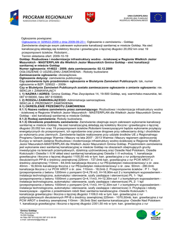 UNIA EUROPEJSKA EUROPEJSKI FUNDUSZ ROZWOJU REGIONALNEGO Ogłoszenie powiązane: Ogłoszenie nr 329522-2009 z dnia 2009-09-23 r. Ogłoszenie o zamówieniu - Gołdap Zamówienie obejmuje swym zakresem wykonanie kanalizacji sanitarnej w mieście Gołdap. Na sieć kanalizacyjną składają się kolektory tłoczne i grawitacyjne o łącznej długości 20,052 km oraz 19 przepompowni ścieków. Robotami... Termin składania ofert: 2009-10-19 Gołdap: Rozbudowa i modernizacja infrastruktury wodno - ściekowej w Regionie Wielkich Jezior Mazurskich - MASTERPLAN dla Wielkich Jezior Mazurskich Gmina Gołdap - sieć kanalizacji sanitarnej w mieście Gołdap Numer ogłoszenia: 414822 - 2009; data zamieszczenia: 02.12.2009 OGŁOSZENIE O UDZIELENIU ZAMÓWIENIA - Roboty budowlane Zamieszczanie ogłoszenia: obowiązkowe. Ogłoszenie dotyczy: zamówienia publicznego. Czy zamówienie było przedmiotem ogłoszenia w Biuletynie Zamówień Publicznych: tak, numer ogłoszenia w BZP: 329522 – 2009r. Czy w Biuletynie Zamówień Publicznych zostało zamieszczone ogłoszenie o zmianie ogłoszenia: nie. SEKCJA I: ZAMAWIAJĄCY I. 1) NAZWA I ADRES: Gmina Gołdap, Plac Zwycięstwa 14, 19-500 Gołdap, woj. warmińsko-mazurskie, tel. 087 6156000, faks 087 6150800. I. 2) RODZAJ ZAMAWIAJĄCEGO: Administracja samorządowa. SEKCJA II: PRZEDMIOT ZAMÓWIENIA II.1) OKREŚLENIE PRZEDMOTU ZAMÓWIENIA II.1.1) Nazwa nadana zamówieniu przez zamawiającego: Rozbudowa i modernizacja infrastruktury wodno - ściekowej w Regionie Wielkich Jezior Mazurskich - MASTERPLAN dla Wielkich Jezior Mazurskich Gmina Gołdap - sieć kanalizacji sanitarnej w mieście Gołdap. II.1.2) Rodzaj zamówienia: Roboty budowlane. II.1.3) Określenie przedmiotu zamówienia: Zamówienie obejmuje swym zakresem wykonanie kanalizacji sanitarnej w mieście Gołdap. Na sieć kanalizacyjną składają się kolektory tłoczne i grawitacyjne o łącznej długości 20,052 km oraz 19 przepompowni ścieków.Robotami towarzyszącymi będzie wykonanie przyłączy energetycznych do przepompowni, ich ogrodzenie oraz prace drogowe przy odtwarzaniu dróg i chodników po wykonaniu prac ziemnych. Zamówienie będzie realizowane przy udziale środków UE z Regionalnego Programu Operacyjnego Warmia i Mazury na lata 2007 - 2013 Warmia i Mazury regionem zjednoczonej Europy w ramach zadania Rozbudowa i modernizacja infrastruktury wodno-ściekowej w Regionie Wielkich Jezior Mazurskich-MASTERPLAN dla Wielkich Jezior Mazurskich Gmina Gołdap. Przedmiotem zamówienia jest wykonanie sieci sanitarnej kanalizacyjnej w mieście Gołdap na obszarach obejmujących grunty inwestycyjne na terenach przemysłowych, dzielnicę uzdrowiskową oraz Osiedle Nad Potokiem, Osiedle Kościuszki i Osiedla I i II.W skład sieci sanitarnej kanalizacyjnej Osiedla I i II wchodzą: 1. kanalizacja grawitacyjna i tłoczna o łącznej długości 1105,50 mb w tym: kan. grawitacyjna z rur polipropylenowych dwuściennych PP-B o średnicy zewnętrznej 225mm - 727,0mb kan. grawitacyjna z rur PCW AROT o średnicy zewnętrznej 110mm - 64,0mb kanalizacja tłoczna z rur PE/polietylen niskociśnieniowy/ o śr. zew. 40mm - 16,50mb kanalizacja tłoczna z rur PE/polietylen niskociśnieniowy/ o śr. zew. 50mm - 280,0mb kanalizacja tłoczna z rur PCW AROT o śr. zew. 110mm - 18,0mb 2. Przepompownie ścieków : P 1 - 1kpl. (przepompownia z betonu 1200mm z pompami Q=4,78 m3, H=16,90m-szt 2 z kompletnym wyposażeniem instalacja technologiczna, automatyka i sterowanie, szafy zasilające i sterownicze) PL 1- 1kpl. (przepompownia z betonu 1000mm z pompami Q=4,11m3, H=12,30m-szt 1 z kompletnym wyposażeniem instalacja technologiczna, automatyka i sterowanie, szafy zasilające i sterownicze) PL 2- 1 kpl (przepompownia z betonu 1000mm z pompami Q=4,11m3, H=12,30m-szt 1 z kompletnym wyposażeniem instalacja technologiczna, automatyka i sterowanie, szafy zasilające i sterownicze) 3. Przyłącza i roboty towarzyszące - zgodnie z przedmiarem robót Sieć sanitarna kanalizacyjna -Osiedle Kościuszki 1. kanalizacja grawitacyjna i tłoczna o łącznej długości 1109,0 mb w tym: kan. grawitacyjna z rur polipropylenowych dwuściennych PP-B o średnicy zewnętrznej 225mm - 1070,50mb, kan. grawitacyjna z rur PCW AROT o średnicy zewnętrznej 110mm - 39,0mb Sieć sanitarna kanalizacyjna -Osiedle Nad Potokiem 1. kanalizacja grawitacyjna i tłoczna o łącznej długości 2351,50 mb w tym: kan. grawitacyjna z rur Gmina Gołdap Plac Zwycięstwa 14 19-500 Gołdap tel./faks 087 615 60 00/ 087 615 08 00 e-mail: [email protected] /1 UNIA EUROPEJSKA EUROPEJSKI FUNDUSZ ROZWOJU REGIONALNEGO polipropylenowych dwuściennych PP-B o średnicy zewnętrznej 225mm - 1621,0mb rurociągi z rur PE/polietylen niskociśnieniowy/ o śr. zew. 315mm -435,0mb rurociągi z rur PCW o śr. zew. 160mm - 6,0mb kan. grawitacyjna z rur PCW AROT o średnicy zewnętrznej 110mm - 45,0mb kanalizacja tłoczna z rur PE/polietylen niskociśnieniowy/ o śr. zew. 75mm - 226,5mb kanalizacja tłoczna z rur PCW AROT o śr. zew. 110mm - 18,0mb 2. Przepompownie ścieków : P 9 - 1kpl (przepompownia z betonu 1500mm z pompami Q=9,62 m3, H=7,47m - szt 2 z kompletnym wyposażeniem - instalacja technologiczna, automatyka i sterowanie, szafy zasilające i sterownicze) Sieć sanitarna kanalizacyjna -Dzielnica Przemysłowa 1. kanalizacja grawitacyjna i tłoczna o łącznej długości 6900,00 mb w tym:kan. grawitacyjna z rur polipropylenowych dwuściennych PP-B o śr.zew. 225mm - 3887,50mb, kan. grawitacyjna z rur polipropylenowych dwuściennych PP-B o śr. zew. 60mm - 16,0mb, rurociągi z rur PE/polietylen niskociśnieniowy/ o śr. zew. 315mm - 1102,0mb, rurociągi z rur PCW o śr.zew. 60mm - 4,0mb kanalizacja z rur PCW AROT o śr. zew. 110mm - 128,0mb, kan. grawitacyjna z rur PCW AROT o średnicy zewnętrznej 110mm - 45,0mb kanalizacja tłoczna z rur PE/polietylen niskociśnieniowy/ o śr. zew. 40mm - 48,0mb kanalizacja tłoczna z rur PE/polietylen niskociśnieniowy/ o śr. zew. 50mm - 42,5mb kanali