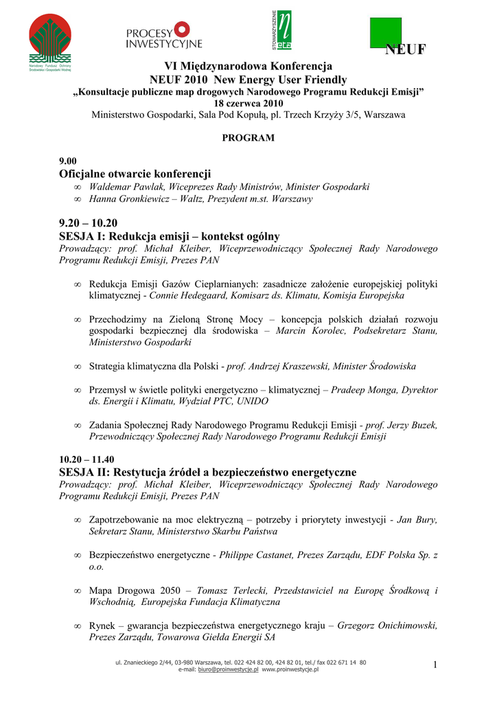 VI Międzynarodowa Konferencja NEUF 2010 New Energy User Friendly „Konsultacje publiczne map drogowych Narodowego Programu Redukcji Emisji” 18 czerwca 2010 Ministerstwo Gospodarki, Sala Pod Kopułą, pl. Trzech KrzyŜy 3/5, Warszawa PROGRAM 9.00 Oficjalne otwarcie konferencji • • Waldemar Pawlak, Wiceprezes Rady Ministrów, Minister Gospodarki Hanna Gronkiewicz – Waltz, Prezydent m.st. Warszawy 9.20 – 10.20 SESJA I: Redukcja emisji – kontekst ogólny Prowadzący: prof. Michał Kleiber, Wiceprzewodniczący Społecznej Rady Narodowego Programu Redukcji Emisji, Prezes PAN • Redukcja Emisji Gazów Cieplarnianych: zasadnicze załoŜenie europejskiej polityki klimatycznej - Connie Hedegaard, Komisarz ds. Klimatu, Komisja Europejska • Przechodzimy na Zieloną Stronę Mocy – koncepcja polskich działań rozwoju gospodarki bezpiecznej dla środowiska – Marcin Korolec, Podsekretarz Stanu, Ministerstwo Gospodarki • Strategia klimatyczna dla Polski - prof. Andrzej Kraszewski, Minister Środowiska • Przemysł w świetle polityki energetyczno – klimatycznej – Pradeep Monga, Dyrektor ds. Energii i Klimatu, Wydział PTC, UNIDO • Zadania Społecznej Rady Narodowego Programu Redukcji Emisji - prof. Jerzy Buzek, Przewodniczący Społecznej Rady Narodowego Programu Redukcji Emisji 10.20 – 11.40 SESJA II: Restytucja źródeł a bezpieczeństwo energetyczne Prowadzący: prof. Michał Kleiber, Wiceprzewodniczący Społecznej Rady Narodowego Programu Redukcji Emisji, Prezes PAN • Zapotrzebowanie na moc elektryczną – potrzeby i priorytety inwestycji - Jan Bury, Sekretarz Stanu, Ministerstwo Skarbu Państwa • Bezpieczeństwo energetyczne - Philippe Castanet, Prezes Zarządu, EDF Polska Sp. z o.o. • Mapa Drogowa 2050 – Tomasz Terlecki, Przedstawiciel na Europę Środkową i Wschodnią, Europejska Fundacja Klimatyczna • Rynek – gwarancja bezpieczeństwa energetycznego kraju – Grzegorz Onichimowski, Prezes Zarządu, Towarowa Giełda Energii SA ul. Znanieckiego 2/44, 03-980 Warszawa, tel. 022 424 82 00, 424 82 01, tel./ fax 022 671 14 80 e-mail: [email protected] www.proinwestycje.pl 1 • Jak stymulować rozwój inwestycji? Finansowanie inwestycji energetycznych – Stanisław Poręba, Ekspert w zakresie Elektroenergetyki, Ernst&Young • Glokalizacja a Kozienice – Marek RóŜycki, Prezes Zarządu, Kozienice II Sp. z o.o. • Mechanizmy wspomagające inwestycje - błękitne certyfikaty - prof. Krzysztof śmijewski, Sekretarz Generalny Społecznej Rady Narodowego Programu Redukcji Emisji 11.40 – 12.00 - Przerwa kawowa 12.00 – 13.30 SESJA III: Efektywność energetyczna Prowadzący: dr inŜ. Arkadiusz Węglarz, Sekretarz Grupy Roboczej ds. Efektywności Energetycznej, Społeczna Rada Narodowego Programu Redukcji Emisji, Dyrektor ds. ZrównowaŜone Rozwoju, KAPE • Efektywność szansą dla bezpieczeństwa dostaw i redukcji emisji – Andrzej Guzowski, p.o. Naczelnika Wydziału Efektywności Energetycznej, Departament Energetyki, Ministerstwo Gospodarki • Wpływ oszczędności energii na konkurencyjność polskiej gospodarki – przemysł, budownictwo, ciepłownictwo, energetyka - dr Sławomir Pasierb, Przewodniczący Grupy Roboczej ds. Efektywności Energetycznej – Społeczna Rada Narodowego Programu Redukcji Emisji, Dyrektor ds. badawczo-rozwojowych - Fundacja na rzecz Efektywnego Wykorzystania Energii • Energy Service Company moŜliwości rozwoju w warunkach polskich – Andrzej Szymański, Prezes Zarządu, Landis+Gyr Sp. z o.o. • Działania mające na celu redukcję emisji CO2 oraz zwiększenie efektywności energetycznej miejskiego systemu ciepłowniczego w Warszawie – Michał Machlejd, Prezes Zarządu, SPEC SA • „Smart Grid: przyszłość czy teraźniejszość?” – Krzysztof Kołodziejczyk, Doradca Zarządu, Globema Sp. z o.o. • Zalety i bariery metody ESCO w Polsce – dr inŜ. Ryszard ŚnieŜyk, niezaleŜny ekspert • Rozwiązania na rzecz zwiększenia efektywności energetycznej - Tuula Ruokonen, Manager, Nordic, Baltic & UK, Fortum Power and Heat Oy ul. Znanieckiego 2/44, 03-980 Warszawa, tel. 022 424 82 00, 424 82 01, tel./ fax 022 671 14 80 e-mail: [email protected] www.proinwestycje.pl 2 13.30 – 14.30 SESJA IV: Czyste technologie węglowe Prowadzący: Tomasz Podgajniak, Prezes Zarządu, CDM Sp. z o.o., były Minister w rządzie Marka Belki • Nawęglenie polskiej gospodarki w kontekście redukcji emisji - Joanna Strzelec – Łobodzińska, Podsekretarz Stanu, Ministerstwo Gospodarki • Zgazowanie węgla – moŜliwości rozwoju - dr Andrzej Siemaszko, Sekretarz Grupy Roboczej ds. Czystych Technologii Węglowych – Społeczna Rada Narodowego Programu Redukcji Emisji, Dyrektor Krajowego Punktu Kontaktowego w Polsce • Węgiel kamienny – perspektywa do 2030 r. – Stanisław Gajos, Prezes Zarządu, Katowicki Holding Węglowy SA 14.30 – 15.15 - Lunch 15.15 – 16.15 SESJA V: Odnawialne źródła energii Prowadzący: Grzegorz Wiśniewski, Członek Grupy Roboczej ds. Odnawialnych Źródeł Energii – Społeczna Rada Narodowego Programu Redukcji Emisji, Prezes Zarządu Instytutu Energetyki Odnawialnej • Jak zazielenić polską elektroenergetykę? OZE jako waŜny element Pakietu Klimatyczno – Energetycznego – Bernard Błaszczyk, Podsekretarz Stanu, Ministerstwo Środowiska • Rola odnawialnych źródeł energii w realizacji pakietu klimatycznego UE - Grzegorz Wiśniewski, Członek Grupy Roboczej ds. Odnawialnych Źródeł Energii – Społeczna Rada Narodowego Programu Redukcji Emisji, Prezes Zarządu Instytutu Energetyki Odnawialnej • Jak nie wylać dziecka z kąpielą - czyli o zrównowaŜonej polityce w sprawie Odnawialnych Źródeł Energii - Krzysztof Nosal, Dyrektor ds. Środowiska, Arizona Chemical • OZE w cieple i kogeneracji - Janusz Nowak, Prezes Zarządu, Dalkia Poznań ZEC • Konkurencja wewnątrz OZE - perspektywa inwestora branŜowego – Krzysztof Müller, Główny MenedŜer, Business Development / M