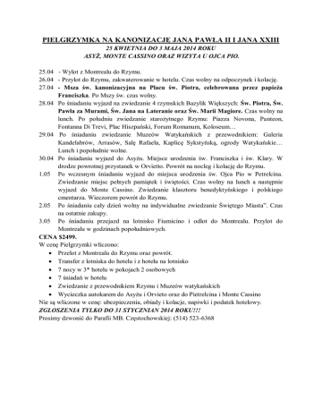 PIELGRZYMKA NA KANONIZACJĘ JANA PAWŁA II I JANA XXIII 25 KWIETNIA DO 3 MAJA 2014 ROKU ASYŻ, MONTE CASSINO ORAZ WIZYTA U OJCA PIO. 25.04 - Wylot z Montrealu do Rzymu. 26.04 - Przylot do Rzymu, zakwaterowanie w hotelu. Czas wolny na odpoczynek i kolację. 27.04 - Msza św. kanonizacyjna na Placu św. Piotra, celebrowana przez papieża Franciszka. Po Mszy św. czas wolny. 28.04 Po śniadaniu wyjazd na zwiedzanie 4 rzymskich Bazylik Większych: Św. Piotra, Św. Pawła za Murami, Św. Jana na Lateranie oraz Św. Marii Magiore. Czas wolny na lunch. Po południu zwiedzanie starożytnego Rzymu: Piazza Novona, Panteon, Fontanna Di Trevi, Plac Hiszpański, Forum Romanum, Koloseum… 29.04 Po śniadaniu zwiedzanie Muzeów Watykańskich z przewodnikiem: Galeria Kandelabrów, Arrasów, Salę Rafaela, Kaplicę Sykstyńską, ogrody Watykańskie… Lunch i popołudnie wolne. 30.04 Po śniadaniu wyjazd do Asyżu. Miejsce urodzenia św. Franciszka i św. Klary. W drodze powrotnej przystanek w Orvietto. Powrót na nocleg i kolację do Rzymu. 1.05 Po wczesnym śniadaniu wyjazd do miejsca urodzenia św. Ojca Pio w Petrelcina. Zwiedzanie miejsc pełnych pamiątek i świętości. Czas wolny na lunch a następnie wyjazd do Monte Cassino. Zwiedzanie klasztoru benedyktyńskiego i polskiego cmentarza. Wieczorem powrót do Rzymu. 2.05 Po śniadaniu cały dzień wolny na indywidualne zwiedzanie Świętego Miasta”. Czas na ostatnie zakupy. 3.05 Po śniadaniu przejazd na lotnisko Fiumicino i odlot do Montrealu. Przylot do Montrealu w godzinach popołudniowych. CENA $2499. W cenę Pielgrzymki wliczono: Przelot z Montrealu do Rzymu oraz powrót. Transfer z lotniska do hotelu i z hotelu na lotnisko 7 nocy w 3* hotelu w pokojach 2 osobowych 7 śniadań w hotelu Zwiedzanie z przewodnikiem Rzymu i Muzeów watykańskich Wycieczka autokarem do Asyżu i Orvieto oraz do Pietrelcina i Monte Cassino Nie są wliczone w cenę: ubezpieczenia, obiady i kolacje, napiwki i podatek hotelowy. ZGLOSZENIA TYLKO DO 31 STYCZNIAN 2014 ROKU!!! Prosimy dzwonić do Parafii MB. Częstochowskiej: (514) 523-6368