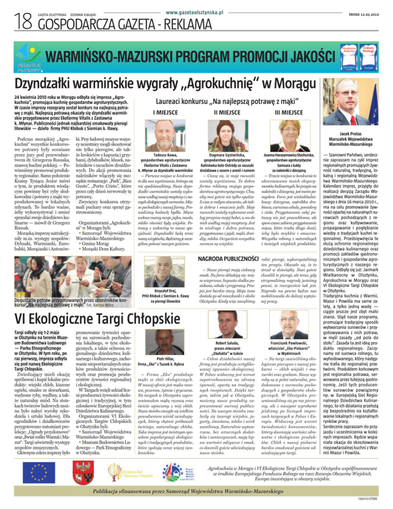 18 GOSPODARCZA GAZETA - REKLAMA GAZETA OLSZTYŃSKA DZIENNIK ELBLĄSKI www.gazetaolsztynska.pl ŚRODA 12.05.2010 WARMIŃSKO-MAZURSKI PROGRAM PROMOCJI JAKOŚCI Dzyndzałki warmińskie wygrały „Agrokuchnię“ w Morągu 24 kwietnia 2010 roku w Morągu odbyła się impreza „Agrokuchnia“, promująca kuchnię gospodarstw agroturystycznych. W czasie imprezy rozegrany został konkurs na najlepszą potrawę z mąki. Najlepszą potrawą okazały się dzyndzałki warmińskie przygotowane przez Ekofarmę Vitalis z Zastawna k. Młynar. Publiczności jednak najbardziej smakowały pierogi litewskie — dzieło firmy PHU Kłobuk z Siemian k. Iławy. Podczas morąskiej „Agrokuchni“ wszystkie konkursowe potrawy były oceniane przez jury pod przewodnictwem dr. Grzegorza Russaka, znawcę kuchni polskiej. — Powinniśmy promować produkty regionalne. Samo położenie Krainy Tysiąca Jezior mówi o tym, że produktem wiodącym powinny być ryby słodkowodne i potrawy z mąki wyprodukowanej w lokalnych młynach. To bardzo ważne, żeby wykorzystywać i umieć sprzedać swoje dziedzicwo kulinarne — mówił dr Grzegorz Russak. Morąską imprezę uatrakcyjniły m.in. występy zespołów: Dybzaki, Warmianki, Eurobabki, Morążanki i Antonów- ki. Przy ludowej muzyce wszyscy uczestnicy mogli skosztować nie tylko pierogów, ale także krokietów z kapustą i grzybami, dybdzalków, klusek, naleśników i racuchów drożdżowych. Do akcji promowania naleśników włączyły się morąskie restauracje: „Park”, „Rico Gusto”, „Porto Cristo”, które przez cały dzień serwowały tę potrawę. Zwycięzcy konkursu otrzymali puchary oraz sprzęt gastronomiczny. Organizatorami „Agrokuchni“ w Morągu byli: • Samorząd Województwa Warmińsko-Mazurskiego • Gmina Morąg • Morąski Dom Kultury. Laureaci konkursu „Na najlepszą potrawę z mąki“ I MIEJSCE II MIEJSCE Jacek Protas Marszałek Województwa Warmińsko-Mazurskiego Tadeusz Kawa, gospodarstwo agroturystyczne Ekofarma Vitalis z Zastawna k. Młynar za dzyndzałki warmińskie — Pierwsze miejsce w konkursie to dla nas wyróżnienie, którego się nie spodziewaliśmy. Nasze dzyndzałki warmińskie zostały wykonane według naszej receptury i z naszych ekologicznych surowców. Mięso pochodziło z naszej farmy. Prowadzimy hodowlę bydła. Mięso wołowe mamy swoje, jajka, masło, mleko również były wiejskie. Potrawy z wołowiny to nasza specjalność. Dzyndzałki będą teraz naszą wizytówką. Będziemy je szczególnie polecać naszym gościom. Dagmara Gęstwińska, gospodarstwo agroturystyczne Kalinówka koło Ostródy za racuszki drożdżowe z sosem z aronii i rumem — Cieszę się, że moje racuszki zostały wyróżnione. To dobra forma reklamy mojego gospodarstwa agroturystycznego. Chcę, aby moi goście nie tylko spędzali czas w miłym otoczeniu, ale także dobrze i smacznie jedli. Moje racuszki zostały wykonane według przepisu mojej babci, a sos do nich według mojej receptury. Jest to niedroga i dobra potrawa, przygotowana z jajek, mąki, drożdży, mleka. Oczywiście wszystkie surowce są wiejskie. NAGRODA PUBLICZNOŚCI Degustacja potraw przygotowanych przez uczestników konkursu „Na najlepszą potrawę z mąki“ Fot. Bartosz Witos III MIEJSCE Krzysztof Drej, PHU Kłobuk z Siemian k. Iławy za pierogi litewskie Joanna Harasymowicz-Stachurska, gospodarstwo agroturystyczne Samsara z Łukty za naleśniki z dziczyzną — Trzecie miejsce w konkursie to ukoronowanie moich eksperymentów kulinarnych, bo przepis na naleśniki z dziczyzną jest moim pomysłem. Farsz jest wieloskładnikowy: dziczyzna, wątróbka drobiowa, czerwona cebula, pomidory i zioła. Przygotowanie całej potrawy nie jest pracochłonne, ale sporo czasu zabiera przygotowanie mięsa, które trzeba długo dusić, żeby było miękkie i smaczne. Wszystko robimy z naturalnych i świeżych wiejskich produktów. — Nasze pierogi mają ciekawy smak. Na farsz składają się: mięso wieprzowe, kapusta słodka posiekana, cebula i przyprawy. Przepis jest bardzo stary. Moja żona dostała go od mieszkanki z okolic Olsztynka. Kiedy więc zaczęliśmy robić pierogi, wykorzystaliśmy ten przepis. Okazało się, że to strzał w dziesiątkę. Nasi goście chwalili te pierogi, ale teraz, gdy otrzymaliśmy nagrodę jesteśmy pewni, że rzeczywiście tak jest. Nagroda na pewno będzie nas mobilizowała do dalszej wytężonej pracy. Robert Saluda, prezes mleczarni „Ekołukta“ w Łukcie — Celem działalności naszej firmy jest produkcja certyfikowanej żywności ekologicznej. W Polsce widoczny jest wzrost zapotrzebowania na zdrową żywność, opartą na tradycyjnych recepturach. Dzięki targom, takim jak w Olsztynku, możemy nasze produkty zaprezentować szerszej publiczności. Na naszym stoisku znalazły się twarogi wiejskie, jogurty, śmietana, mleko i serek waniliowy. Naturalnie wytwarzane, bez sztucznych dodatków i zanieczyszczeń, mają lepsze wartości odżywcze i smak, co docenili goście odwiedzający nasze stoisko. Franciszek Pawłowski, właściciel „Eko-Piekarni“ w Wydminach — Na targi zawieźliśmy ekologiczne pieczywo z naszej piekarni — chleb wiejski i mazurski oraz graham. Nasze wyroby są w pełni naturalne, produkowane z surowców pochodzących z gospodarstw ekologicznych. W Olsztynku prezentowaliśmy się po raz pierwszy, ale z naszymi wyrobami jeździmy po licznych imprezach targowych w Polsce i Europie. Widoczny jest wzrost świadomości konsumentów, którzy doceniają wartości zdrowotne i ekologiczne produktów. Chleb z naszej piekarni bardzo smakował gościom odwiedzającym targi. VI Ekologiczne Targi Chłopskie Targi odbyły się 1-2 maja w Olsztynku na terenie Muzeum Budownictwa Ludowego — Parku Etnograficznego w Olsztynku. W tym roku, po raz pierwszy, impreza odbyła się pod nazwą Ekologiczne Targi Chłopskie. Zwiedzający mieli okazję spróbować i kupić lokalne produkty: wiejski chleb, kiszone ogórki, smalec ze skwark