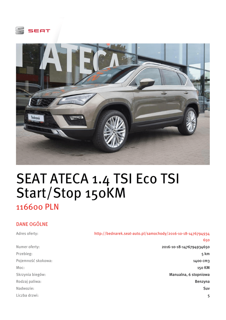 SEAT ATECA 1.4 TSI Eco TSI Start/Stop 150KM 116600 PLN DANE OGÓLNE Adres oferty: http://bednarek.seat-auto.pl/samochody/2016-10-18-1476794934 650 Numer oferty: Przebieg: Pojemność skokowa: Moc: Skrzynia biegów: Rodzaj paliwa: Nadwozie: Liczba drzwi: 2016-10-18-1476794934650 5 km 1400 cm3 150 KM Manualna, 6 stopniowa Benzyna Suv 5 Liczba miejsc: 5 Kolor: zielony Rok produkcji: 2016 WYPOSAŻENIE / ABS / Alufelgi / ASR (kontrola trakcji) / Bluetooth / CD / Centralny zamek / Czujnik deszczu / Czujnik zmierzchu / Czujniki parkowania przednie / Czujniki parkowania tylne / Elektrochromatyczne lusterka boczne / Elektrochromatyczne lusterko wsteczne / Elektryczne szyby przednie / Elektryczne szyby tylne / Elektrycznie ustawiane fotele / Elektrycznie ustawiane lusterka / ESP (stabilizacja toru jazdy) / Gniazdo AUX / Gniazdo SD / Gniazdo USB / Immobilizer / Isofix / Klimatyzacja automatyczna / Klimatyzacja dwustrefowa / Komputer pokładowy / Kurtyny powietrzne / MP3 / Nawigacja GPS / Odtwarzacz DVD / Podgrzewana przednia szyba / Podgrzewane lusterka boczne / Podgrzewane przednie siedzenia / Poduszka powietrzna chroniąca kolana / Poduszka powietrzna kierowcy / Poduszka powietrzna pasażera / Poduszki boczne przednie / Poduszki boczne tylne / Przyciemniane szyby / Radio fabryczne / Relingi dachowe / Światła do jazdy dziennej / Światła LED / Światła przeciwmgielne / System Start-Stop / Tapicerka skórzana / Tapicerka welurowa / Tempomat / Tempomat aktywny / Wielofunkcyjna kierownica / Wspomaganie kierownicy OPIS Wyposażenie standardowe:Pakiet komfortowy: automatyczna klimatyzacja dwustrefowa Climatronic, Przednie światła przeciwmgielne, TempomatPodłokietnik z przodu z regulacją wzdłużną oraz z zintegrowanym schowkiemSchowek z przegrodą z lewej strony bagażnikaOsłony przeciwsłoneczne kierowcy i pasażera z zamykanymi i podświetlanymi lusterkami, ze schowkiem na karty po stronie kierowcySkładana i dzielona tylna kanapaOświetlenie bagażnikaOświetlenie schowka w desce rozdzielczejOświetlenie przestrzeni na nogi z przodu i z tyłuOświetlenie wnętrza LED z możliwością wyboru koloruLampki LED do czytania z przodu i z tyłuZamykany schowek pod fotelem kierowcySchowek na okulary w podsufitcePodłokietnik w drugim rzędzie siedzeńWielofunkcyjna kierownica i gałka zmiany biegów obszyte skórąWnętrze Xcellence z brązowymi elementami dekoracyjnymi konsoli środkowejCzarna podsufitkaFotel kierowcy i pasażera z regulacją podparcia odcinka lędźwiowegoFotel kierowcy i pasażera z regulacją wysokościPrzednie fotele typu comfortSportowe przednie fotele z Alcantary w kolorze brązowymNADWOZIE:Tylne światła LEDOświetlenie powitalne LED w lusterkach bocznychPełne światła LEDPrzednie światła przeciwmgielne18-calowe felgi aluminiowe PERFORMANCE 36/118-calowe dojazdowe koło zapasoweChromowane obramowanie osłony chłodnicyLusterka baczne i klamki w kolorze nadwoziaPodwójna, chromowana końcówka układu wydechowegoZewnętrzny pakiet CHROM: relingi dachowe w kolorze srebrnym, czarne elementy ochronne nadkoli, chromowane obramowania okienZawieszenie typu comfortPrzyciemniane szybyŚwiatła LED do jazdy dziennejELEKTRONIKA:Pakiet zimowy: Podgrzewane fotele przednie, Spryskiwacze reflektorów z podgrzewaniem płynu w spryskiwaczach i wskaźnikiem poziomu płynuSystem bezkluczykowego dostępu i uruchamiania samochodu z systemem KESSYCentralny zamek ze zdalnym sterowaniem, otwieranie klapy bagażnika z pilotaElektrycznie regulowane, podgrzewane i składane lusterka boczneElektrycznie sterowane szyby boczne z przodu i z tyłuElektromechaniczny hamulec postojowyPakiet praktyczny: Czujnik deszczu, Czujnik zmierzchu, Automatyczna funkcja opóźnionego włączania świateł "coming and leaving home" Automatycznie ściemniające się lusterko wsteczneRozbudowana tablica przyrządów z komputerem pokładowym z monochromatycznym ekranem 3,5 '' TFTAutomatyczna klimatyzacja dwustrefowa ClimatronicMedia System Plus: 8-mio calowy kolorowy ekran z czujnikiem zbliżeniowym, radio z CD/MP3/WMA, Złącza 2x USB z obsługą urządzeń Apple, SD, Aux-in, 8 głośników, Bluetooth, funkcja rozpoznawania mowy i sterowania głosem, rozbudowana tablica przyrządów z 3,5 '' wyświetlaczemBEZPIECZEŃSTWO:Kamera cofaniaAsystent parkowania z czujnikiem parkowania z przodu i z tyłuPakiet wspomagania jazdy BASIC ASSISTANT Asystent świateł drogowych, Asystent pasa ruchuAsystent podjazduSeat Drive Profile: 4 profile jazdy: NORMAL, SPORT, ECO i INDIVIDUAL umożliwiające zmianę reakcji silnika, wspomagania kierowcyOgranicznik prędkościTempomatSystem rekomendacji zmiany bieguSystem rozpoznawania zmęczeniaSystem kontroli ciśnienia powietrza w oponachSystem kontroli odstępu Front Assist z funkcją awaryjnego hamowania4 lata gwarancjiZaczepy ISOFIX i Top Tether przy tylnych siedzeniach7 poduszek powietrznychSystem przypominający o obowiązku zapięcia pasówDezaktywacja poduszki powietrznej pasażeraXDS, ESCWYPOSAŻENIE DODATKOWE:Pakiet Comfort +: System kamer 360 z widokiem z góry, nawigacja satelitarna z 8-calowym ekranem dotykowym, Full LinkElektrycznie i bezdotykowo otwierane drzwi bagażnika z systemem KESSYPodgrzewana przednia szybaAlarm z funkcją SAFEMapy Europy dla Navi SystemKolor lakieru: Jungle GreenCena promocyjna: 116 600 PLN