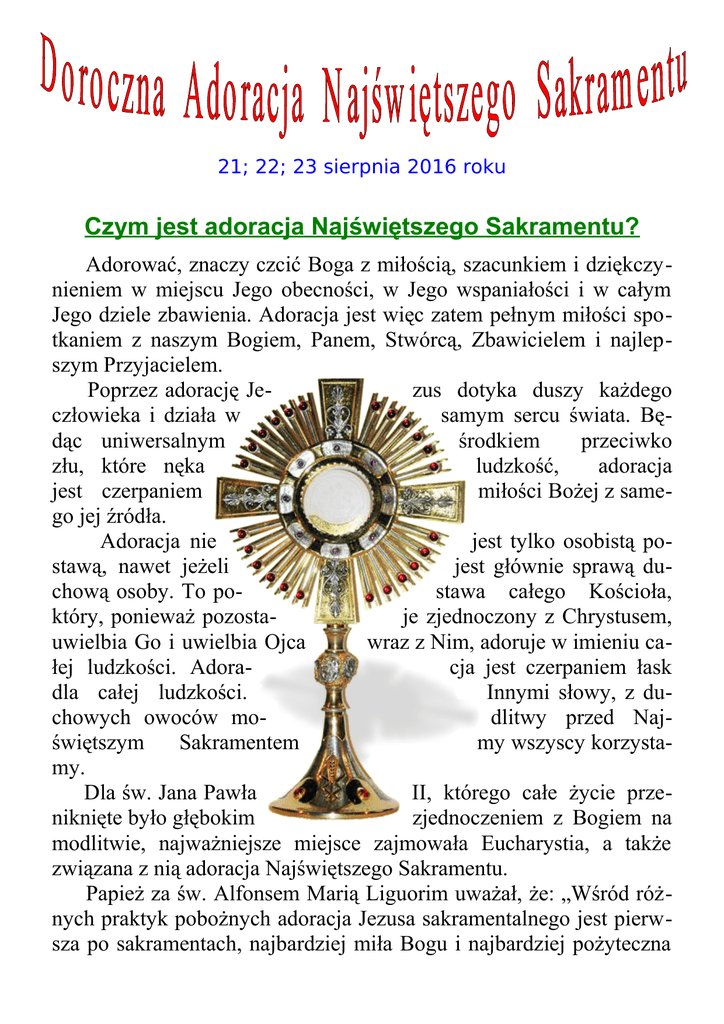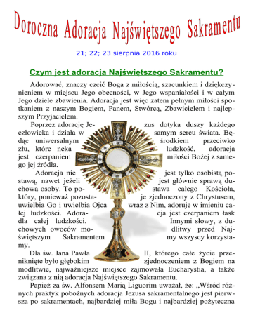 21; 22; 23 sierpnia 2016 roku Czym jest adoracja Najświętszego Sakramentu? Adorować, znaczy czcić Boga z miłością, szacunkiem i dziękczynieniem w miejscu Jego obecności, w Jego wspaniałości i w całym Jego dziele zbawienia. Adoracja jest więc zatem pełnym miłości spotkaniem z naszym Bogiem, Panem, Stwórcą, Zbawicielem i najlepszym Przyjacielem. Poprzez adorację Jezus dotyka duszy każdego człowieka i działa w samym sercu świata. Będąc uniwersalnym środkiem przeciwko złu, które nęka ludzkość, adoracja jest czerpaniem miłości Bożej z samego jej źródła. Adoracja nie jest tylko osobistą postawą, nawet jeżeli jest głównie sprawą duchową osoby. To postawa całego Kościoła, który, ponieważ pozostaje zjednoczony z Chrystusem, uwielbia Go i uwielbia Ojca wraz z Nim, adoruje w imieniu całej ludzkości. Adoracja jest czerpaniem łask dla całej ludzkości. Innymi słowy, z duchowych owoców modlitwy przed Najświętszym Sakramentem my wszyscy korzystamy. Dla św. Jana Pawła II, którego całe życie przeniknięte było głębokim zjednoczeniem z Bogiem na modlitwie, najważniejsze miejsce zajmowała Eucharystia, a także związana z nią adoracja Najświętszego Sakramentu. Papież za św. Alfonsem Marią Liguorim uważał, że: „Wśród różnych praktyk pobożnych adoracja Jezusa sakramentalnego jest pierwsza po sakramentach, najbardziej miła Bogu i najbardziej pożyteczna dla nas”. Eucharystia jest nieocenionym skarbem: nie tylko jej sprawowanie, lecz także jej adoracja poza Mszą św. pozwala zaczerpnąć z samego źródła łaski” (Ecclesia de Eucharistia, 25). Owoce adoracji Pierwszym owocem adoracji w życiu jest najpierw wzrost nadprzyrodzonej wiary. Aby adorować, trzeba czynić akty wiary. Nie czujemy obecności Pana, nie widzimy Go, mimo to wierzymy, że okrągły kawałek chleba to sam Chrystus. Wzrastając w tym akcie wiary, tzn. w uznaniu tego, kim Bóg jest i co robi, dochodzimy do wiary coraz większej, bardziej oczyszczonej i rozumnej. Adoracja odkrywa przed nami nowe światło, coraz bardziej wypełnione tajemnicą. Oczyszcza inteligencję, daje większą jasność, nawet w sprawach konkretnego życia, w codziennych problemach, po prostu dlatego, że wszystko upraszcza. Adoracja prowadzi nas do współczucia i miłości. Adorując stajemy się coraz bardziej podobni do Chrystusa, który przyszedł, by współczuć, wybawiać, uzdrawiać, by uwolnić więźniów, nie możemy nie czynić jak On i dlatego stopniowo wchodzimy we współczucie. Adoracja eucharystyczna przemienia całe nasze życie przez tę osobistą, całkowitą bliskość z Panem. Jezus obecny w tym sakramencie przychodzi, by mieszkać w nas i pośród nas. Jego obecność przemienia nas i ożywia. Powoli życie i uczucia Chrystusa stają się naszymi, abyśmy mogli w prawdzie powiedzieć: „Teraz już nie ja żyję, ale żyje we mnie Chrystus” (Ga 2,20). Adoracja będzie nas także uwalniać i uzdrawiać, bo to przecież ten sam Jezus, który przyszedł uwolnić więźniów, przywrócić wzrok niewidomym, który przeszedł przez ziemię dobrze czyniąc, jest osobiście obecny w Eucharystii. Adoracja daje nam bardziej współpracować w dziele zbawienia, bo adorujemy Adorującego, który naprawia wszelkie zniewagi, wszelkie bałwochwalstwo, wszelki grzech świata popełniony przeciwko Ojcu Światłości. Adoracja przygotowuje nas również do życia wiecznego, bo w Eucharystii adorujemy Tego, który chodził drogami Galilei, cierpiał za nas, zmartwychwstał i żyje w niebie - Tego samego, którego ujrzymy w chwale, którego widok będzie naszym wiecznym nasyceniem. Adoracja przygotowuje nas do tego w sposób tajemniczy, bo poprzez wiarę daje nam widzieć Niewidzialnego, dotknąć Niezmiennego. Stając się czcicielami Boga w Najświętszym Sakramencie, ujrzymy Jego chwałę i zostaniemy nią przemienieni, a także przemienimy świat przyciągając innych do Boga. „W rzeczywistości tylko przez adorację można dojrzeć do głębokiego i autentycznego przyjęcia Chrystusa. I właśnie w tym akcie osobowego spotkania z Panem dojrzewa także posłannictwo społeczne, zawarte w Eucharystii, które ma na celu przełamanie barier nie tylko między Panem a nami, ale także i przede wszystkim barier odgradzających nas od siebie nawzajem” (Benedykt XVI) „Pięknie jest zatrzymać się z Nim i jak umiłowany Uczeń oprzeć głowę na Jego piersi (por. J13, 25), poczuć dotknięcie nieskończoną miłością Jego Serca. Jeżeli chrześcijaństwo ma się wyróżniać w naszych czasach przede wszystkim «sztuką modlitwy», jak nie odczuwać odnowionej potrzeby dłuższego zatrzymania się przed Chrystusem obecnym w Najświętszym Sakramencie na duchowej rozmowie, na cichej adoracji w postawie pełnej miłości? Ileż to razy, moi drodzy Bracia i Siostry, przeżywałem to doświadczenie i otrzymałem dzięki niemu siłę, pociechę i wsparcie!” (św. Jan Paweł II) Zachęceni przykładem Ojca Świętego św. Jana Pawła II postarajmy się i my „dłużej zatrzymać się przed Chrystusem obecnym w Najświętszym Sakramencie na duchowej rozmowie, na cichej adoracji w postawie pełnej miłości” (Ecclesia de Eucharistia, 25). Takiej błogosławionej decyzji prawdopodobnie staną na drodze różne pokusy. Być może będzie to myśl, że nie mamy czasu na kontemplację. Albo że to staromodna praktyka, do niczego niepotrzebna. Niezależnie od tego, jakie głosy będą nas odciągać od adoracji, pamiętajmy, że z Bożą łaską możemy je wszystkie pokonać. Ważne jest, abyśmy nie czekali, aż przyjdzie nam ochota na modlitwę. Najlepiej postanowić sobie, kiedy udamy się na adorację, na jak długo (np. na początek 15 minut czy pół godziny). Pamiętajmy o mądrości zawartej w słowach św. Jana Pawła II: „Czas ofiarowany Chrystusowi nigdy nie jest czasem straconym, ale raczej czasem, który zyskujemy, aby nadać głęboko ludzki charakter naszym relac