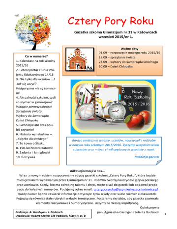 Cztery Pory Roku Gazetka szkolna Gimnazjum nr 31 w Katowicach wrzesień 2015/nr 1. Co w numerze? 1. Kalendarz na rok szkolny 2015/16 2. Fotoreportaż z Dnia Projektu Edukacyjnego 14/15 3. Nie tylko dla uczniów ...! Jak się uczyć? Wulgaryzmy nie są konieczne. 4. Aktualności szkolne, czyli co słychać w gimnazjum? Witajcie pierwszoklasiści Sprzątanie świata Wybory do Samorządu Dzień Chłopaka 5. Gimnazjalisto czas polubić czytanie! 6. Historia wynalazków – „Książka dla każdego” 7. To i owo o Śląsku. 8. 150-lat historii Katowic 9. Zadania i łamigłówki 10. Rozrywka Ważne daty 01.09 – rozpoczęcie nowego roku 2015/16 18.09 – sprzątanie świata 23.09 – wybory do Samorządu Szkolnego 30.09 – Dzień Chłopaka Bardzo serdecznie witamy uczniów, nauczycieli i rodziców w nowym roku szkolnym 2015/2016. Życzymy wszystkim wielu sukcesów oraz miłych chwil spędzonych wspólnie z nami. Redakcja gazetki Kilka informacji o nas... Wraz z nowym rokiem rozpoczynamy edycję gazetki szkolnej „Cztery Pory Roku”, która będzie miesięcznikiem wydawanym przez Gimnazjum nr 31. Pisemko tworzą nauczyciele języka polskiego oraz uczniowie. Każdy, kto ma odrobinę talentu i chęci, może pisać do gazetki lub podawać propozycje do kolejnych numerów. Podajemy adres email: [email protected] Każdy numer będzie zawierał informacje dotyczące życia szkoły oraz wiele różnych ciekawostek. Pojawią się również stałe rubryki i wkładki tematyczne. Postaramy się także, aby gazetka zawierała elementy rozrywkowe i humorystyczne. Liczymy na Waszą współpracę. Opiekunowie Redakcja: A. Gardyjan i J. Bodzioch pani Agnieszka Gardyjan i Jolanta Bodzioch Uczniowie: Robert Małek, Ela Pabisiak, klasy III a i b 1 Kalendarz na rok szkolny 2015/16 18 września – sprzątanie świata 30 września – dzień Chłopaka * 14 października – Dzień Nauczyciela 30 października – obchody Halloween * 6 listopada – Dzień Niesłyszącego 10 listopada – Święto Niepodległości 30 listopada – Andrzejki * 4 grudnia – Mikołajki 22 grudnia – Wigilia i Jasełka * 12 stycznia – egzamin próbny z Historii i WOS oraz języka polskiego 13 stycznia – egzamin próbny z przedmiotów przyrodniczych i matematyki 14 stycznia – egzamin próbny z języka angielskiego podstawa i rozszerzenie * 4 lutego – tłusty czwartek 9 lutego – Ostatki 12 lutego – Walentynki 15 – 28 lutego - FERIE ZIMOWE 8 marca – Dzień Kobiet 10 marca – Dzień Mężczyzny 21 marca – Pierwszy dzień wiosny 23 marca – Śniadanie Wielkanocne * 1 kwietnia – Prima Aprillis 18 kwietnia – egzamin z Historii i WOS oraz języka polskiego 19 kwietnia - egzamin z przedmiotów przyrodniczych i matematyki 20 kwietnia - egzamin z języka angielskiego podstawa i rozszerzenie 29 kwietnia – apel z okazji Święta Konstytucji 3 maja * 1 maja – Święto Pracy 2 maja – Święto Flagi 3 maja – Święto Konstytucji 3 maja 14 maja – Piknik Rodzinny – Dzień Otwarty Zespołu 26 maja – Boże Ciało i Dzień Matki * 1 czerwca – Dzień Dziecka 20-23 czerwca – tydzień podsumowań – Projekt edukacyjny 13 czerwca – Dzień Ojca 24 czerwca – pożegnanie klas III gimnazjum i zakończenie roku szkolnego 25 czerwca – WAKACJE!!!!!!!! Co nowego w gimnazjum ? Gimnazjum nr 31 w Zespole Szkolno – Przedszkolnym dla Dzieci Niesłyszących w roku szkolnym 2015/2016 liczy sześć oddziałów. Po dwa z każdej klasy. Troje uczniów objętych jest nauczaniem indywidualnym i ma dostosowany program nauczania do swoich możliwości. Nauka w gimnazjum trawa 3 lat i kończy się egzaminem gimnazjalnym. W bieżącym roku szkolonym mamy dwie pierwsze klasy: Klasę I a - wychowawcą jest pani Joanna Imielska – Kuś Klasę I b - wychowawcą jest pani Bożena Nadzielska. Łącznie w całym gimnazjum uczy się 41 uczniów. Wszyscy objęci są systematyczną opieką surdopedagogiczną i logopedyczną. II klasy gimnazjum będą po raz kolejny realizować projekt edukacyjny. Temat tegorocznego projektu brzmi: „Dopalacze moim wrogiem”. 2 Fotoreportaż z Dnia Projektu Edukacyjnego w roku szkolnym 2014/15 Tematem ubiegłorocznego projektu edukacyjnego Przygotowano również przedstawienie były : Lodowe pustynie – Arktyka i Antarktyda. pt. „Człowiek na biegunach” W projekcie wzięli udział uczniowie z klasy II a i II b. Opiekunami projektu byli nauczyciele przedmiotów przyrodniczych. Gimnazjaliści przygotowali prezentację multimedialną przybliżająca najważniejsze zagadnienia dotycząc Arktyki i Antarktyki. Uczniowie z pomocą pani Basi i Agaty przedstawili teatrzyk cieni pt. „Wyprawa Anaruka” Była to nowa forma prezentacji. Na zakończenie były podziękowania i wspólna zabawa. Klasa III a i III b 3 Nie tylko dla uczniów ... ! Stałym elementem nasze szkolnej gazetki będą zagadnienia do realizacji na dany miesiąc z Programu Wychowawczego i Profilaktycznego Zespołu oraz formy ich realizacji. Zachęcamy rodziców i uczniów do uważnego śledzenia. Zadania do realizacji w ramach programu wychowawczego i profilaktycznego na wrzesień 1. Bezpieczna droga do szkoły. 2. Jak się uczyć skutecznie. Motywowanie do nauki. 3. Dbamy o kulturę języka – nie używamy wulgaryzmów. Podczas zajęć z wychowawcą zostały przeprowadzone pogadanki z młodzieżą na temat bezpiecznej drogi do szkoły. Zwrócono również uwagę na konieczność stosowania odblasków, zwłaszcza w okresie jesienno – zimowym, kiedy szybko robi się ciemno. Pamiętajcie o tym! Zaczynamy cykl tematyczny poświęcony metodą i sposobom szybszego i skuteczniejszego opanowania nowych wiadomości szkolnych. Przeczytaj je uważnie, zastosuj się do nich ,a na pewno osiągniesz sukces. Jak się uczyć? Możesz uczyć się dla siebie, nie na ocenę, możesz mieć każdy inny cel, ale na pewno musisz naprawdę tego chcieć – od tego wszystko się zaczyna. Chciej się nauczyć – niech ci na tym zależy. Wyznacz sobie odpowie