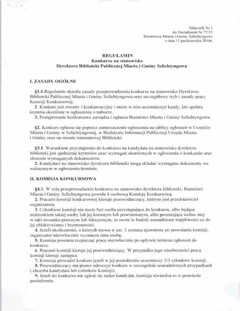 Załącznik Nr I do Zarządzenia Nr 77 15 Burmistrza Miasta i Gminy Szlichtyngowa z dnia 13 października 20l6r. REGULAM IN Konkursu na stanowisku Dyrektora Biblioteki Publicznej Miasta i Gm iny Szlichtyngowa I. ZASADY O G ÓLNE §1.1.Regulamin określa zasady przeprow adzeniu konkursu na stanow isko Dyrektora Biblioteki Publicznej M iasta i Gminy Szlichtyngow a oraz szczegółowy tryb i zasady pracy Komisji Konkursowej. 2. Konkurs jest otwarty i konkurencyjny i może w nim uczestniczyć każdy, kto spełnia kryteria określone w ogłoszeniu o naborze. 3. Postępowanie konkursowe zarządza i ogłasza Burmistrz M iasta i G m iny Szlichtyngowa. §2. Konkurs ogłasza się poprzez zam ieszczenie ogłoszenia na tablicy ogłoszeń w Urzędzie Miasta i G m iny w Szlichtyngowej. w Biuletynie Informacji Publicznej Urzędu M iasta i Gminy oraz na stronie internetowej Biblioteki. §3.1. W arunkiem przystąpienia do konkursu na kandydata na stanowisko dyrektora biblioteki je st spełnienie kryteriów oraz w ym agań określonych w ogłoszeniu o konkursie oraz złożenie wym aganych dokumentów. 2. Kandydaci na stanow isko dyrektora biblioteki mogą składać wym agane dokum enty we wskazanym w ogłoszeniu term inie. II. KOM ISJA K O NK URSO W A §4.1. W celu przeprow adzenia konkursu na stanowisko dyrektora biblioteki. Burmistrz Miasta i Gminy Szlichtyngowa powoła 4 osobow ą Komisję Konkursową. 2. Pracami komisji konkursowej kieruje przewodniczący, którym je st przedstawiciel organizatora. 3. Członkiem komisji nie może być osoba przystępująca do konkursu, albo będąca małżonkiem takiej osoby lub jej krewnym lub powinowatym , albo pozostająca wobec niej w taki stosunku praw nym lub faktycznym, że może to budzić uzasadnione wątpliwości co do jej obiektyw izm u i bezstronności. 4. Jeżeli okoliczności, o których mowa w' ust. 3 zostaną ujawnione po powołaniu komisji, organizator niezwłocznie w yznacza inna osobę. 5. Komisja pow inna rozpocząć pracę niezwłocznie po upływie term inu zgłoszeń do konkursu. 6. Pracami komisji kieruje jej przew odniczący. W przypadku jego nieobecności pracą komisji kieruje zastępca. 7. Komisja prowadzi konkurs jeżeli w jej posiedzeniu uczestniczy 2/3 członków komisji. 8. Przewodniczący ma prawo odroczyć konkurs w szczególnie uzasadnionych przy padkach ( choroba kandydata lub członków komisji). 9. Jeżeli do konkursu nie zgłosi się żaden kandydat, kom isja stw ierdza to w protokole posiedzenia. III. Przebieg konkursu III.I. Zadania komisji. §5. 1. Do zadań komisji należy: 1) określenie kryteriów oceny przydatności kandydata. 2) przeprowadzenie postępow ania konkursowego, 3) sporządzenie protokołów z posiedzeń komisji. 4) przekazanie w yników konkursu wraz z jego dokum entacją organizatorowi. 2. Konkurs odbyw a się dwuetapowo. 3. W pracach komisji nie mogą uczestniczyć osoby nie będące jej członkami. II 1.2. Etap pierwszy . §6.1. Przew odniczący zapoznaje komisję z regulaminem konkursu. 2. Odbiera złożone olerty i spraw dza czy są nienaruszone. 3. Przed przystąpieniem do pracy członkowie komisji składają ośw iadczenia o treści określonej w §4 ust. 3. 4. Kom isja rozpoczyna postępow anie konkursowe od określenia kryteriów oceny przydatności kandydatów. 5. Członkowie komisji zapoznają się z dokumentami złożonymi przez kandydatów, oceniają złożone dokum enty pod względem wymogów formalnych oraz czy z dokum entów wynika, że kandydat spełnia w ym agania kwalifikacyjne określone w ogłoszeniu. 6. Oferty złożone po term inie, oferty nie zaw ierające wszystkich dokum entów oraz oferty z których wy nika, że kandydat nie spełnia wy magań kwalifikacyjnych podlegają odrzuceniu, a kandydaci nie zostają dopuszczeni do dalszego postępow ania konkursowego. 7. Członkowie komisji decydują w głosow aniu jaw nym o dopuszczeniu lub odm ow ie dopuszczenia kandydata do drugiego etapu konkursu. Rozstrzygnięcie następuje zwykłą w iększością głosów i jest ostateczne. W przypadku rów'nej liczby głosów rozstrzyga głos przewodniczącego komisji. 8. Postępowanie konkursowe przeprow adza się także w przypadku zgłoszenia się jednego kandydata. 9. Przewodniczący komisji inform uje kandydatów o dopuszczeniu albo nie dopuszczeniu do dalszego postępow ania konkursowego oraz term inie rozmów. II 1.3. Etap drugi. §7.1. Komisja przeprow adza rozmowy kwalifikacyjne z kandydatami ( w porządku alfabetycznym), w trakcie których kandydaci przedstawiają swoje koncepcje pracy na stanowisku dyrektora biblioteki oraz udzielają odpowiedzi na zadaw ane przez komisję pytania, które mogą dotyczyć przedstawionej koncepcji, zagadnień m erytorycznych, ekonom icznych lub prawnych związanych z działalnością biblioteki. 2. Członkowie komisji dokonują merytorycznej oceny kandydatów poprzez przyznanie punktów w skali od I do 5, w każdym punkcie kryterium , każdemu z kandydatów, na karcie punktowej określającej kryteria przydatności kandydata. 3. Za w ybranego uznaje się kandydata, który w głosow aniu uzyskał największą liczbę punktów, jednak nie mniej niż 50% punktów m ożliwych do uzyskania. 4. W przypadku uzyskania przez dwóch lub więcej kandydatów tej samej ilości punktów, kandydata wylania komisja, zwykłą w iększością głosów w glosow aniu jaw nym . W przy padku równej liczby głosów rozstrzyga głos przew odniczącego komisji. 5. Komisja stwierdza nieprzydatność na stanow isko dyrektora biblioteki wszystkich kandydatów w przypadku, gdy żaden z kandydatów nie uzyska 50% punktów m ożliw ych do uzyskania. 6. Po zakończeniu rozmów kw alifikacyjnych z kandydatami. Przew odniczący zarządza przystąpienie do obliczania punktów, dyskusji nad rekom endacją kandydatury, która uzyskała największą ilość punktów. 7. Z prac komisji sporządza się protokół, który bezpośrednio po zakończeniu prac podpisują wszyscy członkow ie komisji. Do 