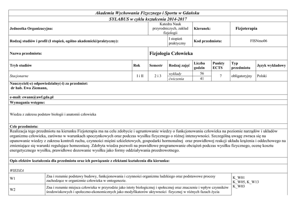 Akademia Wychowania Fizycznego i Sportu w Gdańsku SYLABUS w cyklu kształcenia 2014-2017 Katedra Nauk przyrodniczych, zakład fizjologii Jednostka Organizacyjna: I stopień praktyczny Rodzaj studiów i profil (I stopień, ogólno akademicki/praktyczny): Fizjoterapia Kierunek: Kod przedmiotu: FISNmo06 Fizjologia Człowieka Nazwa przedmiotu: Tryb studiów Rok Stacjonarne I i II Semestr 2i3 Rodzaj zajęć wykłady ćwiczenia Liczba godzin 56 41 Punkty ECTS 7 Typ przedmiotu Język wykładowy obligatoryjny Polski Nauczyciel(-e) odpowiedzialny(-i) za przedmiot: dr hab. Ewa Ziemann, e-mail: [email protected] Wymagania wstępne: Wiedza z zakresu podstaw biologii i anatomii człowieka Cele przedmiotu: Realizacja tego przedmiotu na kierunku Fizjoterapia ma na celu zdobycie i ugruntowanie wiedzy o funkcjonowaniu człowieka na poziomie narządów i układów organizmu człowieka, zarówno w warunkach spoczynkowych oraz podczas wysiłku fizycznego o różnej intensywności. Szczególną uwagę zwraca się na opanowanie wiedzy z zakresu kontroli ruchu, czynności mięśni szkieletowych, gospodarki hormonalnej oraz prawidłowej reakcji układu krążenia i oddechowego na zmieniające się warunki regulujące homeostazę. Zdobyta wiedza pozwoli na prawidłowe programowanie obciążeń podczas wysiłku fizycznego, ocenę kosztu energetycznego wysiłku, prawidłowe dozowanie wysiłku jako formy oddziaływania prozdrowotnego. Opis efektów kształcenia dla przedmiotu oraz ich powiązanie z efektami kształcenia dla kierunku: WIEDZA W1 Zna i rozumie podstawy budowy, funkcjonowania i czynności organizmu ludzkiego oraz podstawowe procesy zachodzące w organizmie człowieka w ontogenezie. W2 Zna i rozumie miejsca człowieka w przyrodzie jako istoty biologicznej i społecznej oraz znaczenie i wpływ czynników środowiskowych i społeczno-ekonomicznych jako modyfikatorów aktywności fizycznej w różnych fazach życia K_W01 K_W05, K_W13 K_W03 W3 człowieka. Zna i rozumie procesy kompensacyjne w organizmie. Zna podstawowe metody i techniki pomiarowe do oceny możliwości funkcjonalnych narządów i układów oraz rozwoju fizycznego. Posiada wiedzę o przeprowadzaniu, zastosowaniu i wykorzystaniu dostępnych testów do oceny podstawowych komponentów wydolności i sprawności fizycznej. Zna podstawowe funkcje organizmu występujące podczas różnych rodzajów wysiłków fizycznych oraz ich negatywne i pozytywne skutki. Rozumie warunki utrzymywania i odzyskiwania homeostazy oraz procesy oddziaływania aktywnością ruchową w celu wytworzenia zmian adaptacyjnych. UMIEJĘTNOŚCI U1 U2 U3 U4 Potrafi wskazać i nazwać najważniejsze elementy składowe układów istotnych w funkcjonowaniu organizmu ludzkiego oraz potrafi wytłumaczyć zależności i związki występujące pomiędzy nimi. Potrafi prawidłowo wykorzystać podstawowe metody i techniki pomiarowe do oceny możliwości funkcjonalnych rozwoju fizycznego oraz dostępne testy do oceny podstawowych komponentów sprawności fizycznej dzieci i młodzieży oraz osób niepełnosprawnych. Potrafi interpretować wysiłkowe czynności organizmu występujące w różnych grupach wiekowych i różnych poziomach i ograniczeniach aktywności ruchowej. Umie stosować podstawowe zasady treningu zdrowotnego. Potrafi regulować i dostosowywać poziom zmęczenia i rodzaj oraz efektywność przerw wypoczynkowych podczas różnych form aktywności fizycznej o charakterze zdrowotnym, rekreacyjnym czy rehabilitacyjnym. Potrafi wyjaśnić i interpretować zmiany metabolizmu pod wpływem wysiłków o różnej intensywności i czasie trwania wykorzystując pomiary wybranych parametrów fizjologicznych. Potrafi formułować i opracować podstawowe cele usprawniania oraz programować programy dydaktyczne prozdrowotne i poprawiające możliwości wysiłkowe. K_U02 K_U17 K_U21 KOMPETENCJE K1 Rozwija własne upodobania sportowe, potrafi ocenić własne i innych możliwości wysiłkowe. K2 Posiada kompetencje do samodzielnego i zespołowego angażowania się w realizację stawianych przed nim celów i zadań, projektuje i wykonuje działania edukacyjne w różnych środowiskach społecznych. K_K01 K_K02 K_K06 Kryteria i metody oceny osiągniętych efektów kształcenia: 1. Zaliczenie z oceną na podstawie cząstkowych ocen z kolokwiów semestralnych (Sem. 2 i 3) oraz raportu wyników doświadczeń laboratoryjnych (sem. 3). W każdym semestrze ocena końcowa jest sumą zdobytych punktów za: aktywność na zajęciach, punktów uzyskanych za 4 wejściówki (3 pytania każda:12 punków) oraz dwa kolokwia 25 punktów każde. 2. Egzamin pisemny z pytaniami otwartymi (10 pytań) Ocena końcowa z egzaminu łączy punkty zdobyte z poszczególnych semestrów oraz punkty za poprawne odpowiedzi na pytanie egzaminacyjne (skala 0-5punktów za każde pytanie). Uzyskanie ocen bdb z dwóch semestrów jest równoznaczne ze zwolnieniem z egzaminu. Aby uzyskać zaliczenie przedmiotu na ocenę dostateczną student musi osiągnąć wszystkie wymienione w sylabusie efekty kształcenia Metody i formy realizacji przedmiotu: Wykłady z projekcją multimedialną Ćwiczenia audytoryjne - rozwiązywanie zadań i ćwiczenia laboratoryjne (samodzielne wykonywanie pomiarów, prób i testów wysiłkowych) Treści kształcenia: Wykłady semestr II: 1. Fizjologia człowieka – nauka o czynnościach organizmu człowieka, homeostaza i mechanizmy ją warunkujące 2. Pobudliwość i przewodnictwo jako podstawowe funkcje komórki nerwowej. 3. Nerwowa kontrola ruchu: a/ struktura i funkcje systemu nerwowego, b/ funkcje układu nerwowego somatycznego i wegetatywnego, c/ centralny system nerwowy, regulacja czucia głębokiego, hamowanie recyprokalne, 3. Nerwowa kontrola ruchu c.d. a) odruchy, ich rodzaje i znaczenie b) receptory własne mięśnia szkieletowego i ich rola 4. Funkcje narządów zmysłów, wzrok, słuch i równowaga ( koordynacja , czucie równowagi i balansu ciała) 5. Mięśnie i ruch. a/ struktura i funkcje 