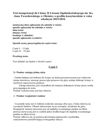 Test kompetencji do I klasy II Liceum Ogólnokształcącego im. Ks. Jana Twardowskiego w Oleśnicy o profilu koszykarskim w roku szkolnym 2015/2016 ostateczna data zgłoszenia do udziału w teście: sposób zgłoszenia do udziału w teście: data testu: miejsce testu: komisja w składzie: sposób ogłoszenia wyników: Sposób oceny poszczególnych części testu: Część I – 15 pkt. Część II – 25 pkt. Przebieg testu: Test składać się będzie z dwóch części: Część I 1) Pomiar zasięgu jedną ręką: - Osoba badana stoi bokiem do ściany na której przymocowana jest widoczna taśma miernicza, unosząc prawą rękę pionowo do góry usiłuje dotknąć ściany w możliwie najwyższym punkcie. Zasięg mierzony jest od podłoża do miejsca dotknięcia ściany przez osobę przystępującą do testu. Pomiar wykonywany jest bez obuwia. 2) Pomiar rozpiętości ramion: - Uczestnik testu stoi w lekkim rozkroku unosząc obie ręce z boku tułowia na wysokość barków. Dłonie skierowane są na zewnątrz, kciukami do góry. Rozpiętość ramion mierzona jest od najdalej wysuniętego punktu na dłoni prawej (zazwyczaj jest to czubek palca środkowego) do najdalej wysuniętego punktu na dłoni lewej. Pomiar odbywa się za pomocą drewnianej poprzeczki z podziałką centymetrową umożliwiającą wiarygodny odczyt. 3) bieg zwrotny 6 x 5 metrów - Bieg polega na pokonaniu sześciu odcinków pięciu metrowych w jak najkrótszym czasie. Próba odbywa się na sali gimnastycznej, odcinek wyznaczony jest przez dwie linie między którymi uczestnik porusza się w trakcie wykonywania próby. Próba zostaje zaliczona jeżeli po każdym przebiegniętym odcinku uczestnik dotknął każdej z linii nogą. Stoper zostaje włączony w momencie gwizdka (sygnalizującego start), wyłączony natomiast po przebiegnięciu szóstego odcinka. Część II 1) Slalom z piłką zakończony rzutem z biegu prawą i lewą ręką oraz rzutem z wyskoku - Uczestnik testu wykonuje rzut z biegu z prawej strony prawą ręką (1). Następnie po zbiórce kozłuje do pierwszego pachołka slalomu, obiega go i kozłując lewą ręką wykonuje rzut z biegu z lewej strony lewą ręką (2). Po oddanym rzucie zbiera piłkę i kozłując między pachołkami biegnie na drugi kosz gdzie wykonuje dowolne zatrzymanie i rzut z wyskoku (3). Próba oceniana jest na podstawie poprawności techniki wykonania ćwiczenia a także płynności ruchu. Próba nie jest wykonywana na czas. 3 3 2 11 - uczeń - tyczka - kierunek biegu z piłką 1,2,3 - kolejność wykonania ćwiczenia W II części można zdobyć 25 pkt. Ocenie poddane zostaną poszczególne elementy: 1. Kozłowanie (przed rzutem z prawej i lewej strony w czasie slalomu) 7 pkt. 1) Rzut z biegu z prawej strony 6 pkt. 2) Rzut z biegu z lewej strony – 6 pkt. 3) Rzut po zatrzymaniu – 6 pkt. 1) Kozłowanie zostanie ocenione na 7 pkt. Start z piłką następuje bez kroków, W czasie kozłowania uczeń nie ma głowy skierowanej w dół, nie patrzy cały czas na piłkę Kozłowanie nie opóźnia biegu i nie jest za wysokie W czasie biegu nie występuje błąd noszenia piłki Po rzucie z prawej strony i zbiórce piłki, następuje kozłowanie lewą ręką do pierwszego pachołka i rzut z lewej strony W czasie slalomu kozłujemy ręką dalszą od pachołka W czasie slalomu zmiana ręki kozłującej jest płynna z jednej ręki do drugiej 2) Rzut z biegu z prawej strony oceniony zostanie na 6 pkt. Rzut wykonany jest w szybkim tempie (w biegu) Występuje poprawna koordynacja pracy nóg: pierwszy krok prawą noga, drugi lewą Odbicie z lewej nogi następuje do góry a nie w przód Piłka w czasie dwutaktu trzymana jest oburącz na wysokości klatki piersiowej lub na wysokości czoła Rzut wykonany jest ręka prawą Rzut zakończony jest ruchem nadgarstka ręki prawej (piłka dostaje rotacje wsteczną) 3)Rzut z biegu z lewej strony oceniony zostanie na 6 pkt. Rzut wykonany jest w szybkim tempie (w biegu) Występuje poprawna koordynacja pracy nóg: pierwszy krok lewą nogą, drugi prawą Odbicie z prawej nogi następuje do góry a nie w przód Piłka w czasie dwutaktu trzymana jest oburącz na wysokości klatki piersiowej lub na wysokości czoła Rzut wykonany jest ręka lewą Rzut zakończony jest ruchem nadgarstka ręki lewej (piłka dostaje rotacje wsteczną) 4) Rzut po zatrzymaniu oceniony zostaje na 6 pkt. Płynne przejście z kozłowania do zatrzymania Zatrzymanie odbywa się poprzez postawienie stopy w kolejności pięta-palce Stopy podczas zatrzymania ustawione są w lekkim rozkroku (mniej więcej na szerokość barków) Chwyt piłki oburącz (umożliwiający podanie, rzut lub minięcie) Po zatrzymaniu następuje wyskok pionowy w górę Wyrzut piłki odbywa się dowolną ręką w sekwencji: prostowanie w stawie łokciowym, zgięcie nadgarstka nadające piłce rotacje wsteczną Każdy z zrealizowanych elementów oceniony zostaje na 1 pkt. W przypadku błędnego wykonania którejkolwiek czynności odjęty zostaje 1 pkt. Test uważa się za zaliczony jeżeli uczestnik z obu części testu ( I i II ) uzyska 21 pkt. W przypadku uzyskania takiej samej ilości procent przez uczniów przystępujących do testu, o przyjęciu decydować będą następujące kryteria: 1) Rejon zamieszkania (przynależność do rejonu szkoły) 2) Wynik testu sprawnościowego 3) Ogólne kryteria szkoły.