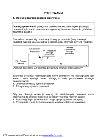 PRZERWANIA 1. Obsługa zdarzeń poprzez przerwania Obsługa przerwania polega na przerwaniu aktualnie wykonywanego procesu i wykonaniu procedury przypisanej danemu zdarzeniu gdy takie zdarzenie zajdzie. Procedura nazywa się procedurą obsługi przerwania (ang. interrupt handler). Często używany jest też skrót ISR (ang. Interrupt Service Routine). Powrót z procedury obslugi przerwania Zdarzenie Z1 Przerwanie P1 - Procedura obslugi przerwania P1 P0 - Proces glówny P0 P0 Obsługa zdarzenia Z1 poprzez procedurę obsługi przerwania P1 Zachodzi potrzeba rozstrzygnięcia które zdarzenie ma obsługiwane gdy wiele z nich wystąpi naraz. Istnieją tu dwie podstawowe strategie postępowania: 1. Jednopoziomowy system przerwań. 2. Priorytetowy system przerwań. Gdy za obsługę oczekuje więcej nie obsłużonych przerwań wybór przerwania do obsługi może być dokonany według różnych zasad. 1. Poszczególnym przerwaniom mogą być przypisane priorytety. 2. Przerwania mogą być obsługiwane według kolejności zgłoszeń. PDF created with pdfFactory trial version www.pdffactory.com Zdarzenie Z1 P0 - Proces glówny Zdarzenie Z2 Obsluga przerwania Z1 Przyjecie obslugi przerwania Z2 Obsluga przerwania Z2 P0 P0 Dwa przerwania obsługiwane w systemie jednopoziomowym Obsluga przerwania Z1 zawieszona Zdarzenie Z1 Zdarzenie Z2 Obsluga przerwania Z1 P0 Obsluga przerwania Z1 wznowiona Obsluga przerwania Z2 Kontynuacja obslugi przerwania Z1 P0 Dw a przerwania obsługiwane w systemie wielopoziomowym Obsługa przerwań w systemie komputerowym jest czasami blokowana przez system operacyjny. Maksymalny czas zablokowania przerwań Tdmax jest podstawową miarą jakości systemu czasu rzeczywistego. Czas Tdmax powinien być jak najkrótszy. Maksymalny czas Tmax reakcji na zdarzenie, w systemie z przerwaniami, jest równy maksymalnemu czasowi zablokowania przerwań Tdmax czyli Tmax = Tdmax . PDF created with pdfFactory trial version www.pdffactory.com Obsługa zdarzeń poprzez przerwania ma dla systemu komputerowego daleko idące konsekwencje. Istnieją dwie strategie obsługi zdarzeń poprzez przerwania: 1. Zdarzenie obsługiwane jest przez procedurę obsługi przerwania. 2. Procedura obsługi przerwania odblokowuje wątek który wykonuje obsługę zdarzenia. wątek procedura obsługi przerwania przerwanie ISR powrót z procedury obsługi przerwania Obsługa zdarzenia poprzez procedurę obsługi przerwania Czas wątek procedura obsługi przerwania wątek obsługi przerwania event ISR przerwanie odblokowanie wątku Procedura obsługi przerwania wykonuje część pracy a następnie odblokowuje wątek wątek obsługi przerwania wątek event przerwanie Czas odblokowanie wątku Przerwanie zamieniane w zdarzenie które odblokowuje wątek. PDF created with pdfFactory trial version www.pdffactory.com 2. Obsługa przerwań w komputerach typu PC Procesory serii 80x86 stosowane w komputerach PC obsługują następujące rodzaje przerwań: 1. Przerwania zewnętrzne – generowane są przez urządzenia zewnętrzne i koordynowane przez kontroler przerwań. 2. Przerwania wewnętrzne - generowane są przez układy wewnętrzne procesora i zwykle związane z naruszeniem systemu ochrony. 3. Przerwania programowe – generowane przez oprogramowanie. Procesor posiada jedną linię zgłaszania przerwania IRQ (ang. Interrupt Request). Liczba urządzeń mogących zgłosić przerwanie jest większa. Aby rozwiązać ten problem stosuje się kontrolerem przerwań (ang. Interrupt Controller) urządzenie RAM Procedura obslugi przerwania 255 Tablica wektorów przerwan VH7 VH1 VH0 Linie przerwan NMI P1 INT V Procesor 0 Baza B kontrolera nazywane INTA INT Kontroler przerwan IRQ0 IRQ1 IRQi IRQ7 IMR CR Urzadzenie Kontroler urzadzenia V=B+i i - numer lini IRQ Obsługa przerwań w komputerze PC Linia IRQ0 posiada najwyższy priorytet, Linia IRQ7 najniższy. Kontroler posiada dwa dostępne z zewnątrz 8 bitowe rejestry: 1. Rejestr poleceń CR (ang. Control Register). Do rejestru CR system wpisuje polecenia i odczytuje zeń statusy. 2. Rejestr maski IMR (ang. Interrupt Maskl Register). Rejestr IMR pozwala na zamaskowanie przyjmowania przerwań. Gdy bit i IMR jest ustawiony na 1 przerwanie IRQi będzie ignorowane. Gdy bit i ustawimy na 0 przerwanie IRQi będzie przyjmowane. PDF created with pdfFactory trial version www.pdffactory.com Funkcje kontrolera przerwań: 1. Arbitraż przerwań. 2. Maskowanie przerwań. 3. Tworzenie powiązania pomiędzy pobudzeniem linii przerwania IRQi a wektorem przerwań VHi. Gdy przerwanie IRQi zostanie przyjęte, kontroler przekazuje do procesora bajt zawierający liczbę V = B + i (baza kontrolera + numer przerwania). Na tej podstawie procesor wykonuje instrukcję INT V a zatem i procedurę obsługi przerwania IRQi . Adres procedury obsługi przerwania IRQi procesor pobiera z wektora VHi = V. IRQ Wektor IRQ Master Slave HEX 0 8 1 2 8 9 10 11 12 13 14 15 3 4 5 6 7 9 70 71 72 73 74 75 76 77 B C D E F Urządzenie Timer – generuje przerwania zegarowe Klawiatura Zegar czasu rzeczywistego RTC W kontrolerze master wejście z kontrolera slave W kontrolerze slave wolne wolne wolne wolne Koprocesor Kontroler 1 dysków IDE Kontroler 2 dysków IDE Układ transmisji szeregowej COM2 Układ transmisji szeregowej COM1 Port drukarki LPT1 Kontroler dysków elastycznych Port drukarki LPT2 Tablica linii przerwań, wektorów przerwań i urządzeń generujących przerwania w komputerze AT PDF created with pdfFactory trial version www.pdffactory.com PDF created with pdfFactory trial version www.pdffactory.com