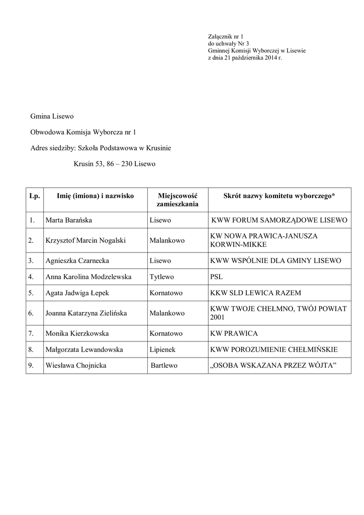 Załącznik nr 1 do uchwały Nr 3 Gminnej Komisji Wyborczej w Lisewie z dnia 21 października 2014 r. Gmina Lisewo Obwodowa Komisja Wyborcza nr 1 Adres siedziby: Szkoła Podstawowa w Krusinie Krusin 53, 86 – 230 Lisewo Lp. Imię (imiona) i nazwisko Miejscowość zamieszkania Skrót nazwy komitetu wyborczego* 1. Marta Barańska Lisewo KWW FORUM SAMORZĄDOWE LISEWO 2. Krzysztof Marcin Nogalski Malankowo KW NOWA PRAWICA-JANUSZA KORWIN-MIKKE 3. Agnieszka Czarnecka Lisewo KWW WSPÓLNIE DLA GMINY LISEWO 4. Anna Karolina Modzelewska Tytlewo PSL 5. Agata Jadwiga Łepek Kornatowo KKW SLD LEWICA RAZEM 6. Joanna Katarzyna Zielińska Malankowo KWW TWOJE CHEŁMNO, TWÓJ POWIAT 2001 7. Monika Kierzkowska Kornatowo KW PRAWICA 8. Małgorzata Lewandowska Lipienek KWW POROZUMIENIE CHEŁMIŃSKIE 9. Wiesława Chojnicka Bartlewo „OSOBA WSKAZANA PRZEZ WÓJTA” Załącznik nr 2 do uchwały Nr 3 Gminnej Komisji Wyborczej w Lisewie z dnia 21 października 2014 r. Gmina Lisewo Obwodowa Komisja Wyborcza nr 2 Adres siedziby: Szkoła Podstawowa w Lisewie Ul. Toruńska 16, 86 – 230 Lisewo Lp. Imię (imiona) i nazwisko Miejscowość zamieszkania Skrót nazwy komitetu wyborczego* 1. Magdalena Szews - Wojdyła Lisewo KW PiS 2. Mariola Makowska Drzonowo KW NOWA PRAWICA-JANUSZA KORWIN-MIKKE 3. Bartosz Piotr Jaworski Lisewo KWW FORUM SAMORZĄDOWE LISEWO 4. Marianna Mikowska Lipienek KWW POROZUMIENIE CHEŁMIŃSKIE 5. Anna Kolek Lisewo KWW FORUM SAMORZĄDOWE POWIATU CHEŁMNO 6. Damian Binkowski Lisewo KWW WSPÓLNIE DLA GMINY LISEWO 7. Karol Ryszard Piątek Lisewo KWW „LISEWO-NASZA SPRAWA” 8. Dorota Anna Lampert Lisewo KWW TWOJE CHEŁMNO, TWÓJ POWIAT 2001 9. Marta Anna Brzozowska Krusin „OSOBA WSKAZANA PRZEZ WÓJTA” Załącznik nr 3 do uchwały Nr 3 Gminnej Komisji Wyborczej w Lisewie z dnia 21 października 2014 r. Gmina Lisewo Obwodowa Komisja Wyborcza nr 3 Adres siedziby: Gminne Gimnazjum w Lisewie Ul. Toruńska 17, 86 – 230 Lisewo Lp. Imię (imiona) i nazwisko 1. Paweł Kachniarz Miejscowość zamieszkania Skrót nazwy komitetu wyborczego* Błachta KWW FORUM SAMORZĄDOWE POWIATU CHEŁMNO 2. Natalia Szpręglewska Lisewo KWW TWOJE CHEŁMNO, TWÓJ POWIAT 2001 3. Przemysław Grabowski Kornatowo KW PiS 4. Angelika Lewandowska Lipienek KWW POROZUMIENIE CHEŁMIŃSKIE 5. Wiesława Wojdyła Pniewite KW PRAWICA 6. Sylwia Małgorzata Zelmańska Drzonowo KWW WSPÓLNIE DLA GMINY LISEWO 7. Halina Klafczyńska Pniewite KW NOWA PRAWICA-JANUSZA KORWIN-MIKKE 8. Katarzyna Czarnecka Lisewo KWW „LISEWO-NASZA SPRAWA” 9. Monika Magdalena Maćkowska Lisewo „OSOBA WSKAZANA PRZEZ WÓJTA” Załącznik nr 4 do uchwały Nr 3 Gminnej Komisji Wyborczej w Lisewie z dnia 21 października 2014 r. Gmina Lisewo Obwodowa Komisja Wyborcza nr 4 Adres siedziby: Świetlica Środowiskowa w Pniewitem Pniewite 1, 86 – 230 Lisewo Lp. Imię (imiona) i nazwisko 1. Janina Klafczyńska Miejscowość zamieszkania Skrót nazwy komitetu wyborczego* Pniewite KWW FORUM SAMORZĄDOWE LISEWO KWW FORUM SAMORZĄDOWE 2. Agata Przeperska Pniewite 3. Aleksandra Mucha Lisewo 4. Bogumiła Stanisława Grabowska Kornatowo KWW TWOJE CHEŁMNO, TWÓJ POWIAT 2001 5. Kamila Paulina Uchacz Lisewo KWW WSPÓLNIE DLA GMINY LISEWO 6. Kamil Łukasz Adamczyk Kornatowo KWW POROZUMIENIE CHEŁMIŃSKIE 7. Beata Dądelska Lisewo KW PRAWICA 8. Monika Wiktoria Kościńska Chrusty KW PiS 9. Dorota Jankowska Lisewo „OSOBA WSKAZANA PRZEZ WÓJTA” POWIATU CHEŁMNO KW NOWA PRAWICA-JANUSZA KORWIN-MIKKE Załącznik nr 5 do uchwały Nr 3 Gminnej Komisji Wyborczej w Lisewie z dnia 21 października 2014 r. Gmina Lisewo Obwodowa Komisja Wyborcza nr 5 Adres siedziby: Dom Pomocy Społecznej w Mgoszczu Mgoszcz 54, 86 – 230 Lisewo Lp. Imię (imiona) i nazwisko Miejscowość zamieszkania Skrót nazwy komitetu wyborczego* 1. Sybilla Preiss Kornatowo KW PiS 2. Elżbieta Maria Kolek Lisewo KWW FORUM SAMORZĄDOWE LISEWO 3. Gabriela Honorata StrzelecKochowicz Lisewo KWW WSPÓLNIE DLA GMINY LISEWO 4. Barbara Moch Lisewo KW NOWA PRAWICA-JANUSZA KORWIN-MIKKE 5. Maria Agnieszka Matyjasik Malankowo KW Prawica 6. Władysława Barbara Dudzińska Kornatowo PSL 7. Dorota Marzenna Kornacka Lipienek „OSOBA WSKAZANA PRZEZ WÓJTA”