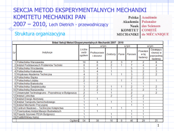 SEKCJA METOD EKSPERYMENTALNYCH MECHANIKI KOMITETU MECHANIKI PAN 2007 – 2010, Lech Dietrich - przewodniczący Struktura organizacyjna 1 Cele i formy działania Integracja środowiska Spotkania plenarne organizowane w różnych ośrodkach: 13-12-2007 – Instytut Podstawowych Problemów Techniki – I spotkanie w kadencji 2007 – 2010, 16-05-2008 – Instytut Transportu Samochodowego w Warszawie, 16-10-2008 – XXIII Sympozjum Mechaniki Eksperymentalnej Ciała Stałego, Jachranka, 21-05-2009 – Uniwersytet Technologiczno – Przyrodniczy, Bydgoszcz 22-05-2009 – Pojazdy Szynowe PESA Holding S.A., Bydgoszcz, 20-11-2009 – Centrum Naukowo – Technicznym Kolejnictwa w Warszawie, 7-05-2010 – Instytut Lotnictwa w Warszawie, 22-09-2010 – XXIII Sympozjum Mechaniki Eksperymentalnej Ciała Stałego, Wrocław. 2 Cele i formy działania Integracja środowiska Cykliczne konferencje naukowe: XXIII Sympozjum Mechaniki Eksperymentalnej Ciała Stałego, 15 – 18 październik 2008 Jachranka, XXIV Sympozjum Mechaniki Eksperymentalnej Ciała Stałego – 22 września 2010, Wrocław, DOŚWIADCZALNE BADANIA W MECHANICE CIAŁA STAŁEGO: I Sympozjum – 1962, 77 uczestników, II Sympozjum – 1965, 144 uczestników Komitet Organizacyjny: Zb.Brzoska Przewodniczący, R.Doroszkiewicz, P.Jastrzębski, J.Kapkowski, Zb.Orłoś, J.Stupnicki, W.Szczepiński. ................................ 3 The Danubia-Adria Symposia Europa Number of Participants/Lecturers at Previous DA Symposia 24th DANUBIA – ADRIA Symposium on Advances in Experimental Mechanics, Sep. 19 – 22, 2007, Sibiu, Romania, 25th DANUBIA – ADRIA Symposium on Advances in Experimental Mechanics, Sep. 24 – 27, 2008, Českė Budějovice, Czech Republik, 26th DANUBIA – ADRIA Symposium on Advances in Experimental Mechanics, Sep. 23 – 26, 2009, Leoben, Austria, 27th DANUBIA – ADRIA Symposium on Advances in Experimental Mechanics, Sep. 22 – 25, 2010, Wrocław, Poland. Upcoming Symposia: DAS 28 to be held in Siofok, Hungary, Sept 28 - Oct 1, 2011 DAS 29 to be held in Serbia, 2012 DAS 30 to be held in Croatia, 2013 4 The Danubia-Adria Society on Experimental Methods (DAS) was founded in 1983. The objective of the Society is Europa http://das.tuwien.ac.at to promote experimental mechanics, covering all aspects from the development to the applications of the methods, for the quality improvement of products and processes and for developing new models of education. DANUBIA – ADRIA – 27 lat (1983 – 2010) - Member Organizations: 1. Austrian Society of Experimental Strain Analysis - Josef EBERHARDSTEINER, Wilfried EICHLSEDER 2. Committee of Mechanics of Polish Academy of Sciences - Romuald BEDZINSKI, Lech DIETRICH 3. Croatian Society of Mechanics - Ivo ALFIREVIC, Damir SEMENSKI 4. Czech Society of Mechanics - Frantisek PLANICKA, Milan RUZICKA 5. Hungarian Scientific Society of Mechanical Engineering - Lajos BORBÁS 6. Italian Association for Stress Analysis - Francesca COSMI, Gianni NICOLETTO 7. Romanian Association for Experimental Stress Analysis - Nicolae ILIESCU, Stefan Dan PASTRAMA 8. Serbian Society of Mechanics - Miloslav OGNJANOVIC, Miroslav ZIVKOVIC 9. Slovak Society of Mechanics - Otakar BOKUVKA, Peter PALCEK 10. Experimental Structural Analysis/ Structural Health monitoring (GESA) of the VDI/VDE – Socity for measurement and Automatic Control (od 2010) – Werner DAUM 5 http://www.eurasem.org Europa Świat Europien Society for Experimental Mechanics http://www.eurasem.org Delegates from the National Committees 1. Austria - Prof. J. Eberhardsteiner 2. Belgium - Prof. J. Degrieck, Prof. D. Van Hemelrijck 3. Bulgaria - Prof. D. Angelova, Prof. Dr.Sc. V. Sainov 4. Croatia - Prof. D. Semenski 5. Denmark - Prof. O.T. Thomsen 6. Estonia - Prof. H. Aben 7. France - Prof. A. Vautrin, Prof. M. Cottron 8. Germany - Dr.-Ing. W. Daum, Prof. Dr.-Ing. K.-H. Laermann 9. Greece - Prof. E. Gdoutos, Dr S. Kourkoulis 10. Ireland - Prof. M. Gilchrist, Dr Abdul-Ghani Olabi 11. Israel - Prof. L. Banks-Sills 12. Italy - Prof. C. Pappalettere, Prof. U. Galietti 13. Latvia - Prof. V. Tamuzs 14. Lithuania - Prof. M. Ragulskis 15. Poland - Prof. L. Dietrich, Dr E. Pieczyska 16. Portugal - Prof. J.F. Silva Gomes, Prof. F.A. Branco 17. Romania - Prof. Dr. Ing. N. Iliescu 18. Russia - Prof. S.T. Mileiko 19. Slovenia - Prof. I. Emri 20. Spain - Dr G. Ruiz Lopez, Prof. M. Anglada 21. Sweden - Dr M. Sjödahl 22. Switzerland - Prof. P. Jacquot 23. Ukraine - Prof. A. Lebedev 24. UK - Prof. J. Barton, Dr C.E. Truman The EURASEM Permanent Committee 2009 EURASEM The European chapter of the SEM Society for Experimental Mechanics 6 Europa Świat Polish Chapter of SEM (Society for Experimental Mechanics) 1994 – umowa z SEM – Prof. Jacek Stupnicki i Prof. Małgorzata Kujawińska Grupa 15 osób, składka $ 50, czasopisma Experimental Mechanics i Experimental Techniques Skład członkowski 2010: Prof. Romuald Będziński, Prof. Witold Bodaszewski, Prof. Roman Bogacz, Prof. Lech Dietrich – przewodniczący 2004 - 2010, Dr inż. Ludomir Jankowski, Prof. Jerzy Kaleta, Prof. dr hab. inż. Maria Kotełko, Dr inż. Leopold Kruszka, Prof. Małgorzata Kujawińska, Prof. Tadeusz Niezgoda - przewodniczący 2010 Prof. Janusz Orkisz, Dr hab. inż. Paweł Pyrzanowski, Dr hab. Leszek Sałbut, Dr Marek Skłodowski, Prof. Marek Żochowski. Polska Sekcja Society for Experimental Mechanics jest zarejestrowana w Krajowym Rejestrze Sądowym 7