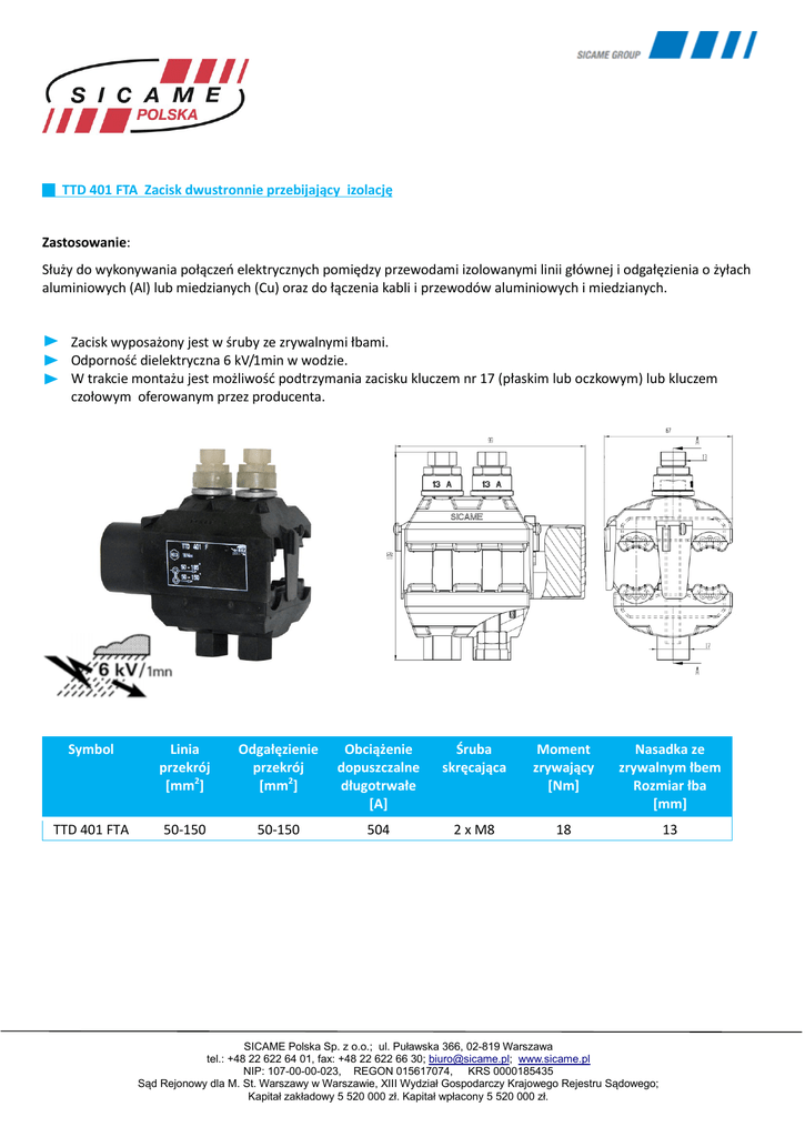 TTD 401 FTA Zacisk dwustronnie przebijający izolację Zastosowanie: Służy do wykonywania połączeń elektrycznych pomiędzy przewodami izolowanymi linii głównej i odgałęzienia o żyłach aluminiowych (Al) lub miedzianych (Cu) oraz do łączenia kabli i przewodów aluminiowych i miedzianych. Zacisk wyposażony jest w śruby ze zrywalnymi łbami. Odporność dielektryczna 6 kV/1min w wodzie. W trakcie montażu jest możliwość podtrzymania zacisku kluczem nr 17 (płaskim lub oczkowym) lub kluczem czołowym oferowanym przez producenta. Symbol Linia przekrój [mm2] Odgałęzienie przekrój [mm2] Obciążenie dopuszczalne długotrwałe [A] Śruba skręcająca Moment zrywający [Nm] Nasadka ze zrywalnym łbem Rozmiar łba [mm] TTD 401 FTA 50-150 50-150 504 2 x M8 18 13 SICAME Polska Sp. z o.o.; ul. Puławska 366, 02-819 Warszawa tel.: +48 22 622 64 01, fax: +48 22 622 66 30; [email protected]; www.sicame.pl NIP: 107-00-00-023, REGON 015617074, KRS 0000185435 Sąd Rejonowy dla M. St. Warszawy w Warszawie, XIII Wydział Gospodarczy Krajowego Rejestru Sądowego; Kapitał zakładowy 5 520 000 zł. Kapitał wpłacony 5 520 000 zł.