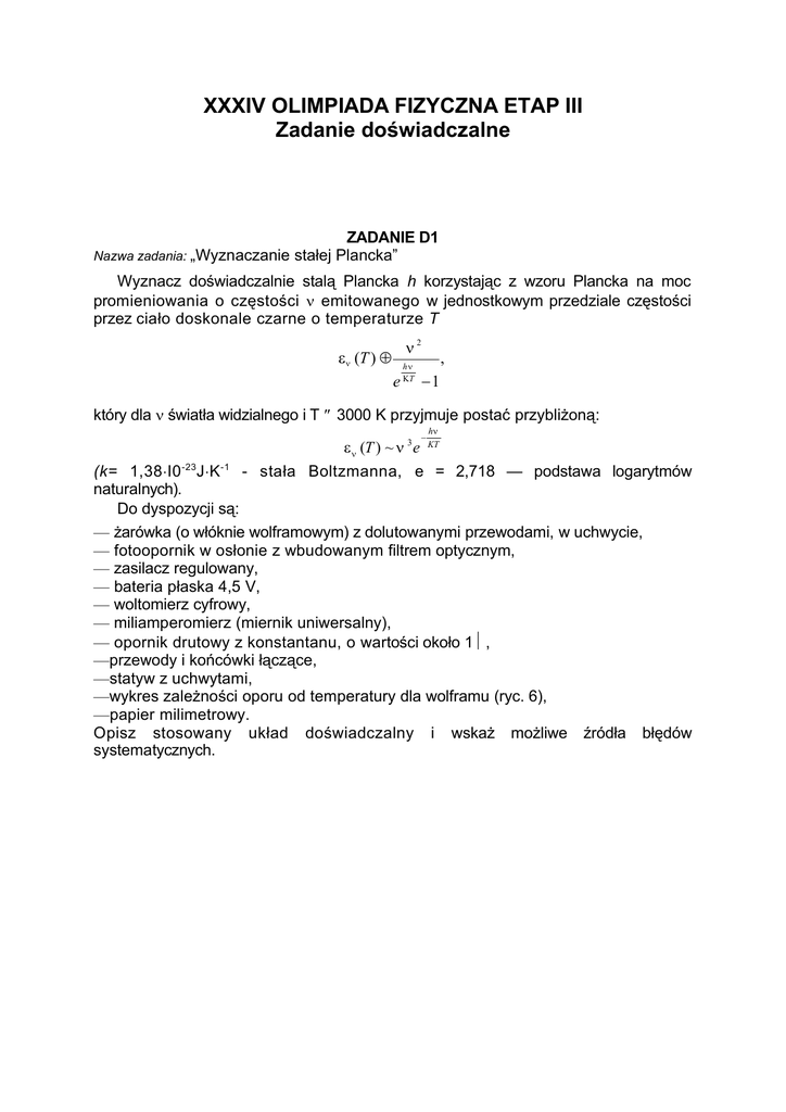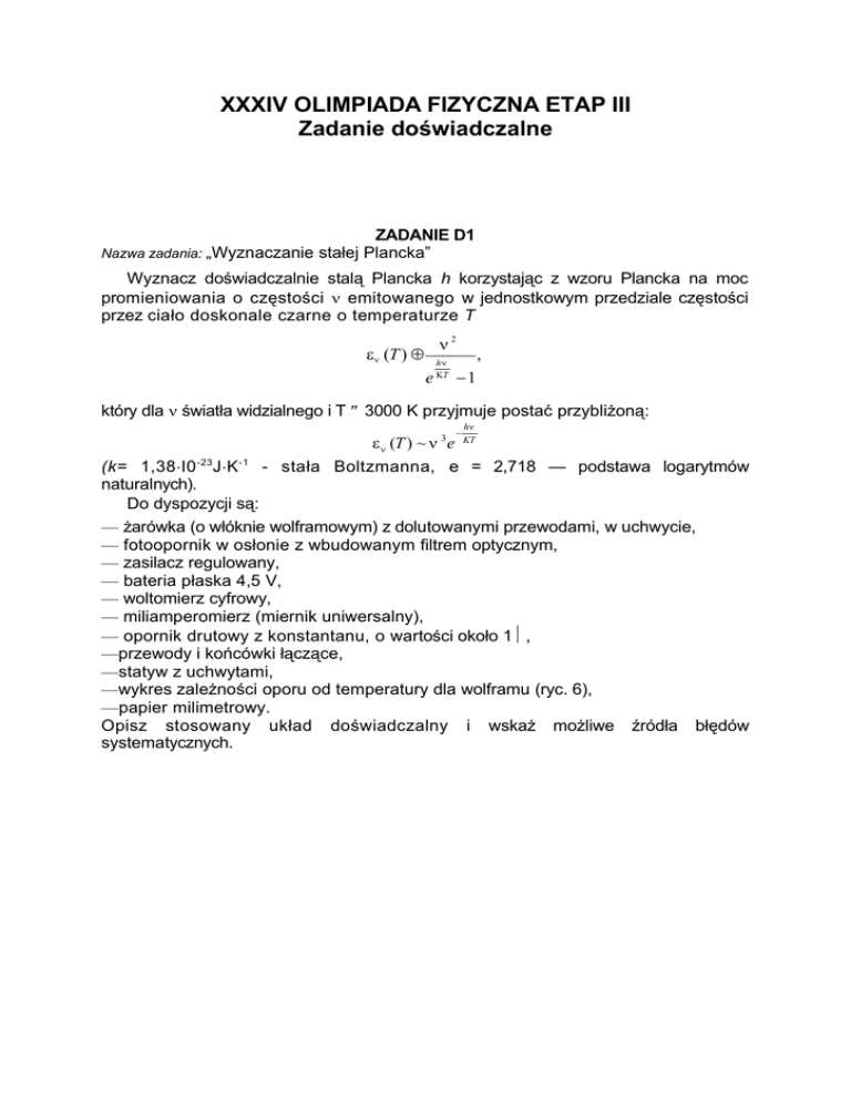 XXXIV OLIMPIADA FIZYCZNA ETAP III Zadanie doświadczalne Nazwa zadania: „Wyznaczanie ZADANIE D1 stałej Plancka” Wyznacz doświadczalnie stalą Plancka h korzystając z wzoru Plancka na moc promieniowania o częstości ν emitowanego w jednostkowym przedziale częstości przez ciało doskonale czarne o temperaturze T ν2 εν (T ) ≈ e hν ΚT , −1 który dla ν światła widzialnego i T ≤ 3000 K przyjmuje postać przybliżoną: − hν ε ν (T ) ~ ν 3 e KT - stała Boltzmanna, e = 2,718 — podstawa logarytmów (k= 1,38⋅I0 -23J⋅K -1 naturalnych). Do dyspozycji są: — żarówka (o włóknie wolframowym) z dolutowanymi przewodami, w uchwycie, — fotoopornik w osłonie z wbudowanym filtrem optycznym, — zasilacz regulowany, — bateria płaska 4,5 V, — woltomierz cyfrowy, — miliamperomierz (miernik uniwersalny), — opornik drutowy z konstantanu, o wartości około 1Ω, —przewody i końcówki łączące, —statyw z uchwytami, —wykres zależności oporu od temperatury dla wolframu (ryc. 6), —papier milimetrowy. Opisz stosowany układ doświadczalny i wskaż możliwe źródła błędów systematycznych. Uwagi: 1. Fotoopornik (z filtrem) reaguje tylko na promowanie o częstości zbliżonej do ν 0 ≈ 4,4 ⋅ 1014 s-1 (λ ≈ 700 nm), przy tym przewodność fotoopornika w przedziale wartości od 3⋅10-5 Ω-1 do 3⋅10-3 Ω-1 jest w przybliżeniu proporcjonalna do natężenia (mocy) padającego promieniowania. 2. Moc wydzielana w fotooporniku nie powinna przekraczać 0,1 W. 3. Żarówkę można zasilać napięciem do 7,5 V. 4. Opór wolframu R i jego temperatura T spełniają w zakresie 300 K ≤ T ≤ 3000 K z dobrym przybliżeniem wzór T ⋅ R −0,82 = const. Z wzoru tego można korzystać zamiast z podanego wykresu R(T). 5. W razie potrzeby można poprosić asystenta o udostępnienie kalkulatora z funkcjami lub tablic matematycznych. ROZWIĄZANIE ZADANIA D1 Część teoretyczna Do wyznaczenia stałej Plancka h wykorzystamy podaną wzorem Plancka zależność Eν (T), w której stała ta występuje jako parametr. Jako promieniowaniem ciała doskonale czarnego posłużymy się promieniowaniem wolframowego włókna żarówki. Temperaturę włókna, która zależna jest od mocy wydzielanej w żarówce – daje się więc regulować, można wyznaczyć na podstawie pomiaru oporu włókna. Do pomiaru mocy promieniowania emitowanego przez włókno żarówki zastosujemy fotoopornik. Dla określonego w treści zadania przedziału wartości przewodność fotoopornika G (t.j. odwrotność oporu) jest proporcjonalna do natężenia padającego nań promieniowania o częstotliwości ν = ν 0 (przyjmujemy, że promieniowanie o częstotliwości ν ≠ ν 0 nie wywiera żadnego wpływu na wartość G). Podanej wartości ν0 = 4,4⋅10 14s-1 odpowiada światło widzialne (przed fotoopornikiem był umieszczony filtr czerwony). Z drugiej strony wiemy, że temperatura włókna w żarówkach nie przekracza normalnie 3000 K, a w każdym razie możemy się ograniczyć do temperatur T ≤ 3000 K. W związku z tym skorzystamy z przybliżonej postaci wzoru Plancka (zwanej wzorem Wiena): hν Eν (T ) ~ ν 3 exp − . kT Na podstawie tego wzoru znajdujemy stosunek mocy promieniowania Eν emitowanego przez włókno przy dwóch różnych temperaturach T 1 i T 2: h ν 1 1 Eν (T2 ) = exp − . (1) Eν (T1 ) k T1 T2 Jeśli położenie fotoopornika względem żarówki będzie ustalone, to padać będzie na niego stale ta sama część emitowanego przez żarówkę promieniowania. Wobec tego przy zaniedbywalnym oświetleniu fotoopornika przez rozproszone światło zewnętrzne (fotoopornik był osłonięty) stosunek przewodności G, odpowiadających dwu różnym temperaturom włókna żarówki, będzie równy G2 Eν (T2 ) = . G1 Eν (T1 ) 0 0 Po uwzględnieniu wzoru ( 1 ) możemy napisać hν 1 1 G2 = exp 0 − G1 k T1 T2 . Logarytmując obie strony tego równania otrzymujemy G hν 0 1 1 ln 2 = − , G1 k T1 T2 a stąd znajdujemy wzór na stałą Plancka: k T1 T2 G h= ln 2 . ν 0 T2 − T1 G1 (2) (3) Posługując się tym wzorem możemy wyznaczyć doświadczalnie wartość stałej h na podstawie pomiaru przewodności fotoopornika dla dwóch temperatur włókna żarówki. Zauważmy jednak, że wzór (2), który określa zależność G od T, można przepisać w postaci zmodyfikowanej: G hν 0 1 h ν 0 1 ln = − . (4) G0 k T0 k T Traktując w tym wzorze T0, i odpowiadające mu G0 jako ustalone otrzymujemy liniową zależność lnG/ G0 od 1/T ze współczynnikiem kierunkowym hν α =− 0 . (5) k Wartości Go i T0 mogą tu stanowić dowolną parę wyników. Ponieważ jednak wartość hν 0 stałej addytywnej nie ma dla nas znaczenia, możemy wzór (4) zapisać w kT0 postaci ln G hν 1 = − 0 + const , G0 k T a za Go przyjąć jednostkę przewodności, np. simens, 1 S = 1Ω -1. Wykreślając na podstawie wyników doświadczalnych InG/Go, w funkcji 1/T powinniśmy otrzymać punkty układające się wzdłuż pewnej prostej (z rozrzutem spowodowanym błędami doświadczalnymi). Na podstawie współczynnika kierunkowego α tej prostej wyznaczamy w oparciu o wzór (5) stalą Plancka: k h = −α . (6) ν0 Część doświadczalna Do wyznaczenia temperatury włókna żarówki (na podstawie wykresu lub podanej zależności) potrzebna jest znajomość stosunku oporu włókna w danej temperaturze do oporu w temperaturze pokojowej, którą przyjmujemy za równą T0 = 293 K. Zestawiamy zatem obwód elektryczny według schematu przedstawionego na ryc. 7. Opór R p ≈ 1Ω symbolizuje dany w zestawie opornik drutowy. Woltomierz cyfrowy mierzy napięcie UBC na żarówce, a po przełączeniu jednego z przewodów z punktu C do punktu A mierzymy spadek napięcia na oporze Rp, który wynosi UAB=RpI, gdzie I jest natężeniem prądu płynącego przez żarówkę. Ponieważ opór woltomierza cyfrowego jest bardzo duży(≥ 107Ω), włączenie go między dowolne punkty obwodu nie wpływa na płynące w obwodzie prądy. 
