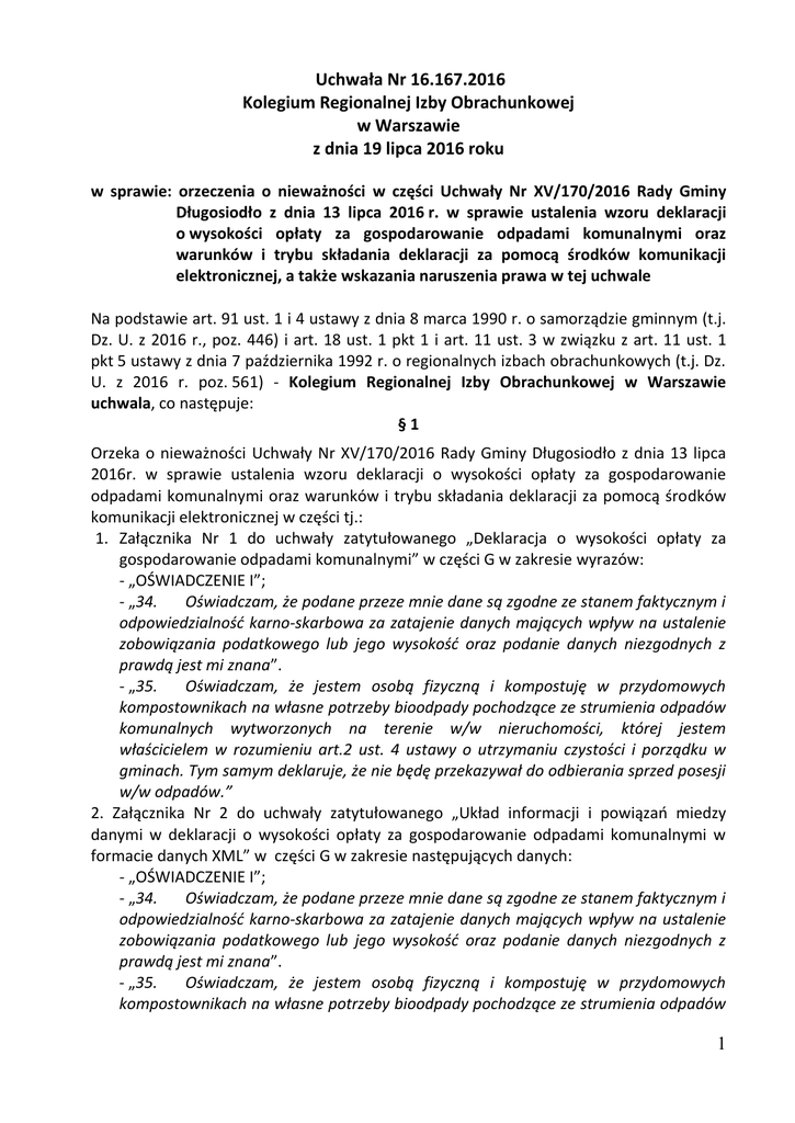 Uchwała Nr 16.167.2016 Kolegium Regionalnej Izby Obrachunkowej w Warszawie z dnia 19 lipca 2016 roku w sprawie: orzeczenia o nieważności w części Uchwały Nr XV/170/2016 Rady Gminy Długosiodło z dnia 13 lipca 2016 r. w sprawie ustalenia wzoru deklaracji o wysokości opłaty za gospodarowanie odpadami komunalnymi oraz warunków i trybu składania deklaracji za pomocą środków komunikacji elektronicznej, a także wskazania naruszenia prawa w tej uchwale Na podstawie art. 91 ust. 1 i 4 ustawy z dnia 8 marca 1990 r. o samorządzie gminnym (t.j. Dz. U. z 2016 r., poz. 446) i art. 18 ust. 1 pkt 1 i art. 11 ust. 3 w związku z art. 11 ust. 1 pkt 5 ustawy z dnia 7 października 1992 r. o regionalnych izbach obrachunkowych (t.j. Dz. U. z 2016 r. poz. 561) - Kolegium Regionalnej Izby Obrachunkowej w Warszawie uchwala, co następuje: §1 Orzeka o nieważności Uchwały Nr XV/170/2016 Rady Gminy Długosiodło z dnia 13 lipca 2016r. w sprawie ustalenia wzoru deklaracji o wysokości opłaty za gospodarowanie odpadami komunalnymi oraz warunków i trybu składania deklaracji za pomocą środków komunikacji elektronicznej w części tj.: 1. Załącznika Nr 1 do uchwały zatytułowanego „Deklaracja o wysokości opłaty za gospodarowanie odpadami komunalnymi” w części G w zakresie wyrazów: - „OŚWIADCZENIE I”; - „34. Oświadczam, że podane przeze mnie dane są zgodne ze stanem faktycznym i odpowiedzialność karno-skarbowa za zatajenie danych mających wpływ na ustalenie zobowiązania podatkowego lub jego wysokość oraz podanie danych niezgodnych z prawdą jest mi znana”. - „35. Oświadczam, że jestem osobą fizyczną i kompostuję w przydomowych kompostownikach na własne potrzeby bioodpady pochodzące ze strumienia odpadów komunalnych wytworzonych na terenie w/w nieruchomości, której jestem właścicielem w rozumieniu art.2 ust. 4 ustawy o utrzymaniu czystości i porządku w gminach. Tym samym deklaruje, że nie będę przekazywał do odbierania sprzed posesji w/w odpadów.” 2. Załącznika Nr 2 do uchwały zatytułowanego „Układ informacji i powiązań miedzy danymi w deklaracji o wysokości opłaty za gospodarowanie odpadami komunalnymi w formacie danych XML” w części G w zakresie następujących danych: - „OŚWIADCZENIE I”; - „34. Oświadczam, że podane przeze mnie dane są zgodne ze stanem faktycznym i odpowiedzialność karno-skarbowa za zatajenie danych mających wpływ na ustalenie zobowiązania podatkowego lub jego wysokość oraz podanie danych niezgodnych z prawdą jest mi znana”. - „35. Oświadczam, że jestem osobą fizyczną i kompostuję w przydomowych kompostownikach na własne potrzeby bioodpady pochodzące ze strumienia odpadów 1 komunalnych wytworzonych na terenie w/w nieruchomości, której jestem właścicielem w rozumieniu art.2 ust. 4 ustawy o utrzymaniu czystości i porządku w gminach. Tym samym deklaruje, że nie będę przekazywał do odbierania sprzed posesji w/w odpadów.” z powodu istotnego naruszenia art. 6n ust. 1 w związku z art. 6m ust. 1b ustawy z dnia 13 września 1996 r. o utrzymaniu czystości i porządku w gminach (Dz. U. z 2016r. poz. 250 z późn. zm.). §2 Wskazuje, że Uchwała Nr XV/170/2016 Rady Gminy Długosiodło z dnia 13 lipca 2016r. w sprawie ustalenia wzoru deklaracji o wysokości opłaty za gospodarowanie odpadami komunalnymi oraz warunków i trybu składania deklaracji za pomocą środków komunikacji elektronicznej w części tj.: w części B Załącznika Nr 1 do uchwały zatytułowanego „Deklaracja o wysokości opłaty za gospodarowanie odpadami komunalnymi” w zakresie przewidzianej możliwości wskazywania przez składającego deklarację, że deklaracja składana jest na okoliczność ustania obowiązku uiszczania opłat i w części B Załącznika Nr 2 do uchwały zatytułowanego „Układ informacji i powiązań miedzy danymi w deklaracji o wysokości opłaty za gospodarowanie odpadami komunalnymi w formacie danych XML” w tym samym zakresie została podjęta z nieistotnym naruszeniem art. 6n ust. 1 w związku z art. 6m ust. 2 ustawy z dnia 13 września 1996 r. o utrzymaniu czystości i porządku w gminach. §3 1. Od niniejszej uchwały, w części o której mowa w § 1 uchwały przysługuje Gminie Długosiodło prawo wniesienia skargi do Wojewódzkiego Sądu Administracyjnego w Warszawie, w terminie 30 dni od dnia jej doręczenia, za pośrednictwem Kolegium Regionalnej Izby Obrachunkowej w Warszawie, 2. Od niniejszej uchwały, w części o której mowa w § 2 uchwały nie przysługuje Gminie Długosiodło prawo wniesienia skargi do Wojewódzkiego Sądu Administracyjnego w Warszawie. Uzasadnienie W dniu 14 lipca 2016 r. została doręczona Regionalnej Izbie Obrachunkowej w Warszawie Uchwała Nr XV/170/2016 Rady Gminy Długosiodło z dnia 13 lipca 2016 r. w sprawie ustalenia wzoru deklaracji o wysokości opłaty za gospodarowanie odpadami komunalnymi oraz warunków i trybu składania deklaracji za pomocą środków komunikacji elektronicznej. Badając wymienioną uchwałę, Kolegium Regionalnej Izby Obrachunkowej w Warszawie ustaliło, co następuje: I. W § 1 uchwały Rada Gminy Długosiodło określiła wzór deklaracji o wysokości opłaty za gospodarowanie odpadami komunalnymi (dalej zwaną „opłatą za g.o.k.”) składanej przez właściciela nieruchomości położonych na terenie Gminy Długosiodło oraz termin i miejsce złożenia deklaracji. (Załącznik Nr 1 do uchwały) 2 W załączniku Nr 1 do badanej uchwały w części G zatytułowanej „Oświadczenie i podpis składającego deklaracje” przewidziano obligatoryjne składanie oświadczeń o treści „Oświadczam, że podane przeze mnie dane są zgodne ze stanem faktycznym i odpowiedzialność karno–skarbowa za zatajenie danych mających wpływ na ustalenie zobowiązania podatkowego lub jego wysokość oraz podanie danych niezgodnych z prawdą jest mi znana” i „Oświadczam, że jestem osobą fizyczną i kompostuj