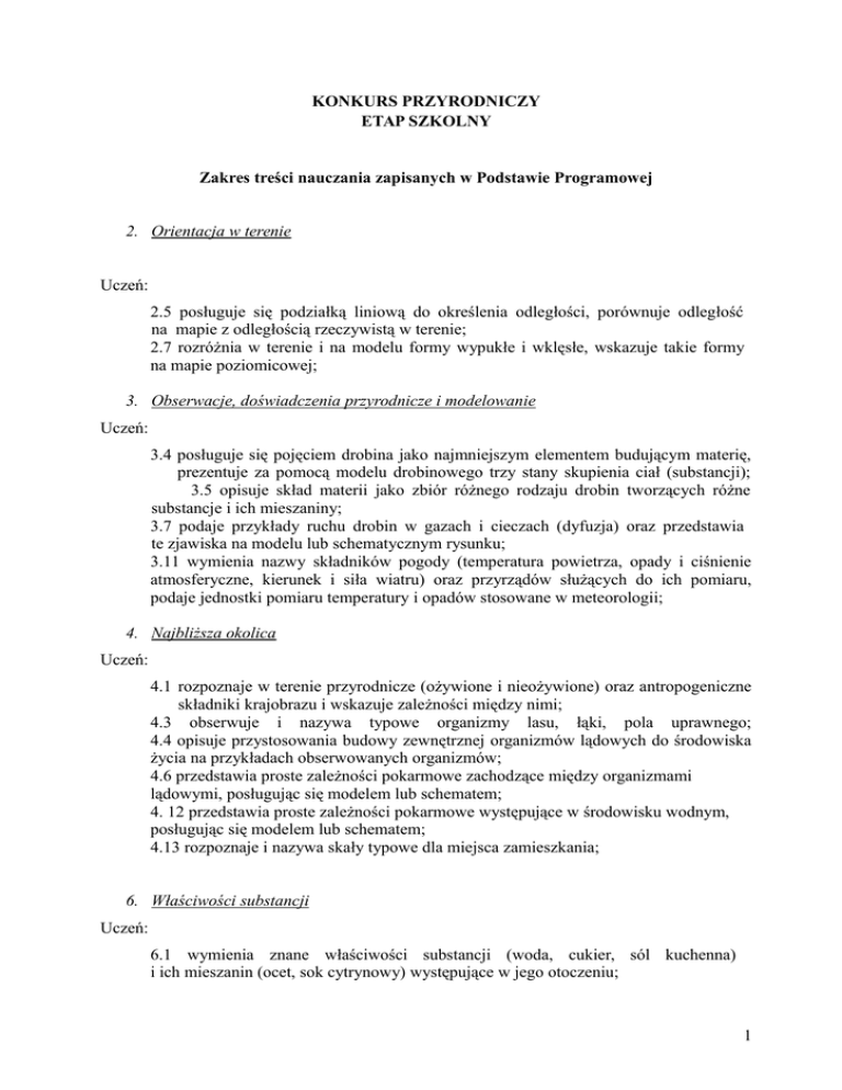 KONKURS PRZYRODNICZY ETAP SZKOLNY Zakres treści nauczania zapisanych w Podstawie Programowej 2. Orientacja w terenie Uczeń: 2.5 posługuje się podziałką liniową do określenia odległości, porównuje odległość na mapie z odległością rzeczywistą w terenie; 2.7 rozróżnia w terenie i na modelu formy wypukłe i wklęsłe, wskazuje takie formy na mapie poziomicowej; 3. Obserwacje, doświadczenia przyrodnicze i modelowanie Uczeń: 3.4 posługuje się pojęciem drobina jako najmniejszym elementem budującym materię, prezentuje za pomocą modelu drobinowego trzy stany skupienia ciał (substancji); 3.5 opisuje skład materii jako zbiór różnego rodzaju drobin tworzących różne substancje i ich mieszaniny; 3.7 podaje przykłady ruchu drobin w gazach i cieczach (dyfuzja) oraz przedstawia te zjawiska na modelu lub schematycznym rysunku; 3.11 wymienia nazwy składników pogody (temperatura powietrza, opady i ciśnienie atmosferyczne, kierunek i siła wiatru) oraz przyrządów służących do ich pomiaru, podaje jednostki pomiaru temperatury i opadów stosowane w meteorologii; 4. Najbliższa okolica Uczeń: 4.1 rozpoznaje w terenie przyrodnicze (ożywione i nieożywione) oraz antropogeniczne składniki krajobrazu i wskazuje zależności między nimi; 4.3 obserwuje i nazywa typowe organizmy lasu, łąki, pola uprawnego; 4.4 opisuje przystosowania budowy zewnętrznej organizmów lądowych do środowiska życia na przykładach obserwowanych organizmów; 4.6 przedstawia proste zależności pokarmowe zachodzące między organizmami lądowymi, posługując się modelem lub schematem; 4. 12 przedstawia proste zależności pokarmowe występujące w środowisku wodnym, posługując się modelem lub schematem; 4.13 rozpoznaje i nazywa skały typowe dla miejsca zamieszkania; 6. Właściwości substancji Uczeń: 6.1 wymienia znane właściwości substancji (woda, cukier, sól kuchenna) i ich mieszanin (ocet, sok cytrynowy) występujące w jego otoczeniu; 1 6.5 podaje przykłady zastosowań różnych substancji w przedmiotach codziennego użytku, odwołując się do właściwości tych substancji; 7. Krajobraz Polski i Europy Uczeń: 7.1 charakteryzuje wybrane krajobrazy Polski: gór wysokich, wyżyny wapiennej, nizinny, pojezierny, nadmorski, wielkomiejski, przemysłowy, rolniczy oraz wskazuje je na mapie; 7.4 wymienia formy ochrony przyrody stosowane w Polsce, wskazuje na mapie parki narodowe, podaje przykłady rezerwatów przyrody, pomników przyrody i gatunków objętych ochroną, występujących w najbliższej okolicy; 8. Organizm człowieka Uczeń: 8.1 podaje nazwy narządów budujących organizm człowieka: układ kostny, oddechowy, pokarmowy, krwionośny, rozrodczy, wskazuje na planszy główne narządy tych układów: a) układ kostny – elementy układu: czaszka, kręgosłup, klatka piersiowa, kończyn górne, kończyny dolne, b) układ oddechowy – jama nosowa, krtań, tchawica, oskrzela, płuca, c) układ pokarmowy – jama ustana, przełyk, żołądek, jelito cienkie, jelito grube, odbytnica, d) układ krwionośny – serce, naczynia krwionośne: żyły i tętnice, e) układ rozrodczy: żeński – jajniki, jajowody, macica, pochwa, męski – jądra, nasieniowody, prącie, 8.6 opisuje rolę zmysłów w odbieraniu wrażeń ze środowiska zewnętrznego; 9. Zdrowie i troska o zdrowie Uczeń: 9.3 wymienia zasady prawidłowego odżywiania się i stosuje je; 14. Przemiany substancji Uczeń: 14.1 podaje przykłady przemian odwracalnych: topnienie, krzepnięcie i nieodwracalnych: ścinanie białka, korozja; 14.5 odróżnia mieszaniny jednorodne od niejednorodnych, podaje przykłady takich mieszanin z życia codziennego; 2 3