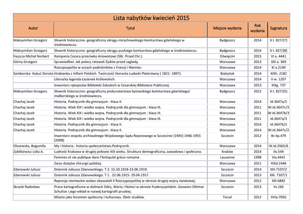 Lista nabytków kwiecień 2015 Autor Tytuł Miejsce wydania Rok wydania Sygnatura Maksymilian Grzegorz Słownik historyczno- geograficzny okręgu mirachowskiego komturstwa gdańskiego w średniowieczu. Bydgoszcz 2014 II t. 827/[7] Maksymilian Grzegorz Słownik historyczno- geograficzny okręgu puckiego komturstwa gdańskiego w średniowieczu. Bydgoszcz 2014 II t. 827/[8] Faszcza Michał Norbert Górny Grzegorz Kampania Cezara przeciwko Ariowistowi (58r. Przed Chr.). Sprawiedliwi. Jak polacy ratowali Żydów przed zagładą. Rzeczpospolita w oczach podróżników z Francji i Niemiec. Oświęcim Warszawa Warszawa 2015 2013 2014 VI a. 4441 XXI a. 369 XI a.2140 Białystok 2014 XIXh. 2182 Literacka legenda Łazienek Królewskich. Warszawa 2014 II w. 1207 Inwentarz rękopisów Biblioteki Załuskich w Cesarskiej Bibliotece Publicznej. Warszawa 2013 XIXg. 737 Maksymilian Grzegorz Słownik historyczno- geograficzny prokuratorstwa bytowskiego komturstwa gdańskiego/ malborskiego w średniowieczu. Bydgoszcz 2012 II t. 827/[5] Chachaj Jacek Chachaj Jacek Chachaj Jacek Chachaj Jacek Historia. Podręcznik dla gimnazjum : klasa II. Historia. Wiek XIX i wielka wojna. Podręcznik dla gimnazjum : klasa III. Historia. Wiek XIX i wielka wojna. Podręcznik dla gimnazjum : klasa III. Historia. Wiek XIX i wielka wojna. Podręcznik dla gimnazjum : klasa III. Warszawa Warszawa Warszawa Warszawa 2014 2011 2011 2011 Id.3647a/2 W.Id.3647c/3 W.Id.3647b/3 Id.3647a/3 Chachaj Jacek Chachaj Jacek Historia. Podręcznik dla gimnazjum : klasa II. Historia. Podręcznik dla gimnazjum : klasa II. Inwentarz zespołu archiwalnego Wojskowego Sądu Rejonowego w Szczecinie [1945] 1946-1955 [2008] Warszawa Warszawa Szczecin 2014 2014 2012 Id.3647b/2 W.Id.3647c/2 Br.IIp.479 Olszewska, Bogumiła. Zyblikiewicz Lidia A. My i historia : historia społeczeństwo.Podręcznik. Ludność Krakowa w drugiej połowie XIX wieku. Struktura demograficzna, zawodowa i społeczna. Femmes et vie publique dans l'Antiquité gréco-romaine. Warszawa Kraków Lausanne 2014 2014 1998 W.Id.3565/6 IIx.544 Via.4441 Zarys dziejów chirurgii polskiej. Warszawa 2011 XIXd.2446 Szczecin 2014 XIII.7107/2 Szczecin Warszawa 2013 2012 XIII. 7107/1 XIII.6882 Szczecin 2013 IIs.166 Toruń 2012 XVIa.7056 Samborska- Kukuć Dorota Hrabianka z Inflant Polskich. Twórczość literacka Ludwiki Platerówny ( 1821- 1897). Zdanowski Juliusz Dziennik Juliusza Zdanowskiego. T.2. 15.10.1918-23.06.1919. Zdanowski Juliusz Dziennik Juliusza Zdanowskiego. T.1 . 22.06.1915- 29.04.1917. Represje niemieckie wobec obywateli II Rzeczypospolitej w okresie drugiej wojny światowej. Skrycki Radosław Prace kartograficzne w dolinach Odry, Warty i Noteci w okresie fryderycjańskim. Goswien Othmar Schultze i jego wkład w rozwój kartografii pruskiej. Miasto jako fenomen społeczny i kulturowy. Zbiór studiów. Lista nabytków kwiecień 2015 Autor Tytuł Miejsce wydania Rok wydania Sygnatura Warszawa łomianki 2010 2014 Ic.1607 XIII.7108 Toruń 2013 IIp.912 Iggers Georg G. Cichoracki Piotr Historiografia XX wieku. Przegląd kierunków badawczych. Województwo poleskie 1921- 1939. Z dziejów politycznych. Roman Wanda Krystyna Współczesna kultura dokumentacyjna. Sasanka Paweł Cywiński Bogdan Rok Bogdan The Cold War. A Short History of a World Divided. Dzieje Narodów Europy Wschodniej. Szańce kultur. Świat kultury staropolskiej. Teksty źródłowe i studia. Nauka. Warsaw Warszawa Toruń Wrocław 2015 2014 2014 2014 XIV.10202 Id.3649 Xib.1600 Ic.1605 Barszcz Anna Warszawa 2014 IIp.911 Wrocław 2014 XIII.7109 Traverso Enzo Prezydium Rady Ministrów i Urząd Rady Ministrów jako wytwórcy państwowego zasobu archiwalnego (1945- 1996). "Łączmy się przeciw wrogom jedności!" Związek Walki Młodych i inne organizacje dla młodzieży na Dolnym Śląsku w latach 1945-1948. Historia jako pole bitwy. Interpretacja przemocy w XX wieku. Warszawa 2014 Ic.1606 Riasanovsky Nicholas V. Moreira Isabel Historia Rosji. Heaven's purge. Purgatory in late antiquity. Kraków Oxford 2009 2014 Id.3648 XVIIIa.4274 Columella Lucius Iunius Moderatus Columella Lucius Iunius Modera Columella on Agriculture. Books 1-4. Cambridge 2006 VIb.1488/1 Columella on Agriculture. Books 5-9. Cambridge 2006 VIb.1488/2 Columella Lucius Iunius Modera Geremek Bronisław Columella on Agriculture. Books 10-12. Cambridge 2006 VIb.1488/3 1971 IIz.2558b Voegelin Eric Meier Christian Meier Christian Arystoteles. Powstanie polityczności u Greków. Powstanie polityczności u Greków. Wrocław-WarszawaKraków- Gdańsk Warszawa Warszawa Warszawa 2011 2012 2012 Via. 4443 W.Via.4444a VIa.4444b Voegelin Eric McPherran Mark L. Świat polis. Religia Sokratesa. Księgowanie. Literatura, kobiety, pieniądze. Warszawa Warszawa Szczecin 2013 2014 2014 Via.4445 VIa.4446 XIXh.2183 Kuskin Vladimir V. Political Grouping in the Czechoslovak Reform Movement. Glasgow 1972 XIV.10181 Palczyński Michał Ludzie marginesu w średniowiecznym Paryżu XIV- XV wiek. Lista nabytków kwiecień 2015 Autor Tytuł Miejsce wydania Rok wydania Sygnatura Kraków Warszawa 2014 2012 XIXh.2184/2 IIw.868/4 Najder Zdzisław Tyszka Andrzej Tadeusz Życie Josepha Conrada Korzeniowskiego. Tom2. Nekrologi "Kuriera Warszawskiego" 1821- 1939.T.IV. 1859-1861. Simms Brendan Taniec mocarstw. Walka o dominację w Europie os XV do XXI wieku. Poznań 2015 Id.3650 Walaszczyk Anna Tajemniczy świat Chasydów w królestwie mistycyzmu, kabały, śpiewu, tańca i ekstazy. Świadectwa zagłady. Obóz w Chełmnie nad Nerem. Getto wiejskie Czachulec. Łódź Gdańsk 2009 2014 XXIa.372 XXIa.371 Polacy- Żydzi. Kontakty kulturowei literackie. Kraków 2014 XXI.370 Chwalba Andrzej Marzęta Dariusz Samobójstwo Europy. Wielka wojna 1914- 1918. Herby i znaki mennicze na szelagach polskich i z Polską powiązanych. Kraków Lublin 2014 2014 XXa.4188 IIf.417 Najder Zdzisław Gajowniczek Zygmunt Tomasz Życie Josepha Conrada Korzeniowskiego. T.1 Powstanie styczniowe na pograniczu Mazowsza, Podlasia i Lubelszc