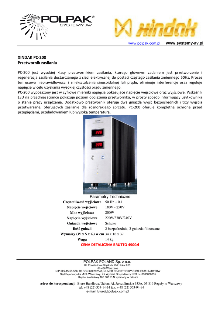 www.polpak.com.pl www.systemy-av.pl XINDAK PC-200 Przetwornik zasilania PC-200 jest wysokiej klasy przetwornikiem zasilania, którego głównym zadaniem jest przetworzenie i regeneracja zasilania dostarczanego z sieci elektrycznej do postaci częstego zasilania zmiennego 50Hz. Proces ten usuwa nieprawidłowości i zniekształcenia sinusoidalnej fali prądu, eliminuje interferencje oraz reguluje napięcie w celu uzyskania wysokiej czystości prądu zmiennego. PC-200 wyposażony jest w cyfrowe mierniki napięcia pokazujące napięcie wejściowe oraz wyjściowe. Wskaźnik LED na przedniej ściance pokazuje poziom obciążenia przetwornika, w prosty sposób informujący użytkownika o stanie pracy urządzenia. Dodatkowo przetwornik oferuje dwa gniazda wyjść bezpośrednich i trzy wyjścia przetwarzane, oferujących zasilanie dla różnorakiego sprzętu. PC-200 oferuje kompletną ochronę przed przepięciami, przeładowaniem lub wysoką temperaturą. Parametry Techniczne Częstotliwość wyjściowa 50 Hz ± 0.1 180V - 250V Napięcie wejściowe 200W Moc wyjściowa 220V/230V/240V Napięcia wyjściowe Schuko Gniazda wejściowe 2 bezpośrednie, 3 gniazda filtrowane Ilość gniazd Wymairy (W x S x G) w cm 34 x 16 x 37 14 kg Waga CENA DETALICZNA BRUTTO 4900zł POLPAK POLAND Sp. z o.o. Ul. Powstańców Śląskich 106d lokal 203 01-466 Warszawa NIP 525-15-58-506, REGON 012292542, NUMER REJESTROWY GIOŚ: E0001241WZBW Sąd Rejonowy dla M.St. Warszawy, XX Wydział Gospodarczy KRS nr. 0000066055 Kapitał zakładowy 100 000 PLN wpłacony w całości Adres do korespondencji: Biuro Handlowe/ Salon: Al. Jerozolimskie 333A, 05-816 Reguły k/ Warszawy tel. +48 (22) 353-14-14 fax. + 48 (22) 353-94-94 e-mail: [email protected]