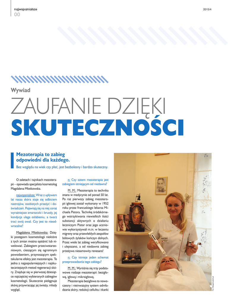 2015/4 00 Wywiad ZAUFANIE DZIĘKI SKUTECZNOŚCI Mezoterapia to zabieg odpowiedni dla każdego. Bez względu na wiek czy płeć, jest bezbolesny i bardzo skuteczny. najwspanialsze: Wraz z upływem lat nasza skóra staje się odbiciem nastrojów, osobistych przeżyć i doświadczeń. Pojawiają się na niej coraz wyraźniejsze zmarszczki i bruzdy, jej kondycja ulega osłabieniu, a twarz traci swój owal. Czy jest to nieodwracalne? Magdalena Młotkowska: Dzięki postępom kosmetologii niektóre z tych zmian można opóźnić lub niwelować. Zabiegiem przeciwstarzeniowym, cieszącym się ogromnym powodzeniem, przynoszącym spektakularne efekty jest mezoterapia. To jedna z najpopularniejszych i najskuteczniejszych metod regeneracji skóry. Znajduje się w pierwszej dziesiątce najczęściej wybieranych zabiegów kosmetologii. Skutecznie pielęgnuje skórę przywracając jej świeży, młody wygląd. n: Czy zatem mezoterapia jest zabiegiem istniejącym od niedawna? M. M.: Mezoterapia to technika znana w medycynie od ponad 50 lat. Po raz pierwszy zabieg mezoterapii igłowej został wykonany w 1952 roku przez francuskiego lekarza Michaela Pistora. Technikę śródskórnego wstrzykiwania niewielkich ilości substancji aktywnych o działaniu leczniczym Pistor oraz jego uczniowie wykorzystywali m.in. w leczeniu migreny oraz przewlekłych zespołów bólowych żylaków kończyn dolnych. Przez wiele lat zabieg weryfikowano i ulepszano, a od niedawna zabieg przeżywa niesamowity renesans! n: Czy istnieje jeden schemat przeprowadzania tego zabiegu? M. M.: Wyróżnia się trzy podstawowe rodzaje mezoterapii: bezigłową, igłową i mikroigłową. Mezoterapia bezigłowa to nowoczesny i nieinwazyjny system odmładzania skóry, redukcji cellulitu i tkanki Fot. Cleopatra-plock.pl O zaletach i tajnikach mezoterapii – opowiada specjalista kosmetolog Magdalena Młotkowska. 00 tłuszczowej, oraz leczenia różnorodnych problemów skóry twarzy i ciała. Godny podkreślenia jest fakt, iż mezoterapii bezigłowa zdobyła Nagrodę Nobla w dziedzinie chemii. Urządzenia do mezoterapii bezigłowej wykorzystują zjawiska fizyczne zachodzące w błonach komórkowych i w warstwie rogowej skóry, pozwalające na udostępnieniu nowych dróg wprowadzania aktywnych preparatów bez konieczności użycia igieł. Mezoterapii oparta jest na zjawisku elektroporacji oraz ultradźwięków. Mezoterapia igłowa polega na ostrzykiwaniu skóry koktajlem substancji odżywczych. Mezoterapia może być wykonywana: • za pomocą igły i strzykawki – co pozwala na podanie większej ilości preparatu w miejscach szczególnie wymagających np. w obrębie głębokich zmarszczek (tworzy się tzw. depozyty). To zabieg dokładny i precyzyjny; • za pośrednictwem specjalnego aparatu, który wzbogacony w specjalny automatyczny tryb pracy, zapewnia jednakowe podanie preparatu w obrębie całej partii skóry. Mezoterapia mikroigłowa – istotą zabiegu jest tworzenie w skórze mikronakłuć, których funkcją jest zapoczątkowanie szeregu procesów regeneracyjnych oraz zwiększenie przepuszczalności skóry dla składników aktywnych zawartych w koncentratach. W czasie pięciominutowego rolowania skóry powstaje ok. 250 000 mikrokanalików, stanowiących wrota dla substancji aktywnych, których zdolność wnikania zwiększa się o około 1000 razy. n: Jak często należy wykonywać tego typu zabiegi? M. M.: W przypadku mezoterapii bezigłowej początkowo poddaję swojego pacjenta jednemu zabiegowi na tydzień przez dwa miesiące, następnie wykonuję jeden zabieg na miesiąc dla podtrzymania efektów. Mezoterapia igłowa z kolei przynosi najlepsze efekty po ok. 6 zabiegach wykonywanych co 10 dni. n: Jakie są zalety mezoterapii? M. M.: Mezoterapia nie jest metodą inwazyjną, nie ma skutków ubocznych, zabieg jest bezbolesny, pacjenta i jego skóry. Jest to bowiem zabieg szyty na miarę. n: Czy mezoterapię łączy Pani z innymi zabiegami? M. M.: Przed zabiegiem mezoterapii dobrze jest oczyścić skórę pilingiem kawitacyjnym. Jesienią warto także zastosować kwasy owocowe oraz mikrodermabrazję, która złuszczy naskórek, a tym samym ułatwi transport substancji w głąb skóry. Dla uzyskania lepszego efektu, często łączę mezoterapię bezigłową z igłową. n: Czy mezoterapia igłowa jest zabiegiem bezpiecznym? Mezoterapia to jedna z najpopularniejszych i najskuteczniejszych metod regeneracji skóry. Znajduje się w pierwszej dziesiątce najczęściej wybieranych zabiegów kosmetologii. zapobiega i leczy różnego rodzaju defekty skórne, pozwala usunąć oznaki starzenia przy maksymalnym komforcie dla pacjenta, nie wymaga żadnego okresu rekonwalescencji, bezpośrednio po zabiegu skóra jest nawilżona, wygładzona i rozświetlona. n: Jakie substancje aktywne stosuje kosmetolog najczęściej do zabiegu? M. M.: Bez wątpienia najczęściej wybieram kwas hialuronowy, który stosuję w zabiegach nawilżających i przeciwzmarszczkowych. Wyjątkowe cechy tego kwasu wynikają z jego wysokiej masy cząsteczkowej oraz dużej objętości. Przeplatające się łań- cuchy kwasu hialuronowego wypełniają przestrzenie między włóknami kolagenowymi, zatrzymując wodę – działają jak „molekularna gąbka”. 1 g kwasu hialuronowego wiąże aż 6 l wody! Jest to mój ulubieniec wśród składników aktywnych. Gdy skóra wymaga rozświetlenia, stosuję koktajl z dużą dawką witaminy C, gdy traci jędrność, wybieram witaminę E, w zabiegach stymulujących, pobudzających używam kofeinę i L-karnitynę. Bardzo indywidualnie dobieram zestaw składników, dlatego też ważna jest ciągła współpraca specjalisty kosmetologa z pacjentem. Przed zabiegiem umawiam na wstępną konsultację, aby zweryfikować potrzeby M. M.: Tak, mezoterapia igłowa jest zabiegiem bezpiecznym. Używane w zabiegu materiały są jednorazowe, zawsze pracuję w rękawiczkach, skóra przed i po zabiegu jest odpowiednio dezynfekowana. Mezoterapię przeprowadzam p