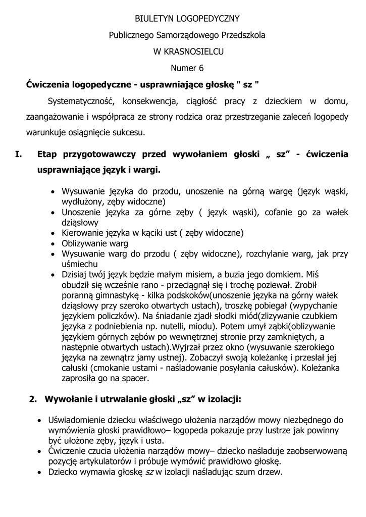 BIULETYN LOGOPEDYCZNY Publicznego Samorządowego Przedszkola W KRASNOSIELCU Numer 6 Ćwiczenia logopedyczne - usprawniające głoskę " sz " Systematyczność, konsekwencja, ciągłość pracy z dzieckiem w domu, zaangażowanie i współpraca ze strony rodzica oraz przestrzeganie zaleceń logopedy warunkuje osiągnięcie sukcesu. I. Etap przygotowawczy przed wywołaniem głoski „ sz” - ćwiczenia usprawniające język i wargi. Wysuwanie języka do przodu, unoszenie na górną wargę (język wąski, wydłużony, zęby widoczne) Unoszenie języka za górne zęby ( język wąski), cofanie go za wałek dziąsłowy Kierowanie języka w kąciki ust ( zęby widoczne) Oblizywanie warg Wysuwanie warg do przodu ( zęby widoczne), rozchylanie warg, jak przy uśmiechu Dzisiaj twój język będzie małym misiem, a buzia jego domkiem. Miś obudził się wcześnie rano - przeciągnął się i trochę poziewał. Zrobił poranną gimnastykę - kilka podskoków(unoszenie języka na górny wałek dziąsłowy przy szeroko otwartych ustach), troszkę pobiegał (wypychanie językiem policzków). Na śniadanie zjadł słodki miód(zlizywanie czubkiem języka z podniebienia np. nutelli, miodu). Potem umył ząbki(oblizywanie językiem górnych zębów po wewnętrznej stronie przy zamkniętych, a następnie otwartych ustach).Wyjrzał przez okno (wysuwanie szerokiego języka na zewnątrz jamy ustnej). Zobaczył swoją koleżankę i przesłał jej całuski (cmokanie ustami - naśladowanie posyłania całusków). Koleżanka zaprosiła go na spacer. 2. Wywołanie i utrwalanie głoski „sz” w izolacji: Uświadomienie dziecku właściwego ułożenia narządów mowy niezbędnego do wymówienia głoski prawidłowo– logopeda pokazuje przy lustrze jak powinny być ułożone zęby, język i usta. Ćwiczenie czucia ułożenia narządów mowy– dziecko naśladuje zaobserwowaną pozycję artykulatorów i próbuje wymówić prawidłowo głoskę. Dziecko wymawia głoskę sz w izolacji naśladując szum drzew. II. Utrwalanie głosek Utrwalanie głoski sz Ćwiczenie głoski „sz” w izolacji Łączenie głoski „sz” z samogłoskami ( sz przedłużamy) - Szsza, szszo, szsze, szszu, szszy, Szsza – fa, szsza – lik, szsza – tnia, szsza – bla, szsza – chy, szszo – fer, szszy – ba, szszy – ny, szszy – ja Następny etap to „sz” w środku wyrazu (początkowo dzielimy wyrazy na sylaby) - Ka – sza, ka – szel, ma – szy – na, no – sze, ka – lo – sze, ko – szu – la, kie – szeń, wie – szak, pu – szek, gro – szek Następnie sz” na końcu wyrazu ( przedłużamy sz ) - Koszsz, kapeluszsz, myszsz, listonoszsz Z kolei ćwiczymy w układach dwuwyrazowych i w zdaniach Szary szalik nasza szatnia Szerokie szelki koszyk gruszek Na wieszaku wisi szalik. Mama szyje koszulę. W szatni stoją wieszaki. W koszyku jest groszek. Oddzielnych ćwiczeń wymaga głoska sz przed spółgłoskami; początkowo ją podwajamy Szszkoła, szszkło, szszklanka, szszpital, szszpada, szszpak, szsznurek, szsznurowadło, szszmata W środku wyrazu głoskę sz podwajamy i wyraz dzielimy na sylaby My – szszka, puszsz – ka, bro – szszka, gru – szszka Szkolna szatnia wyszywana poduszka Pluszowy kapelusz bursztynowa broszka Puszka groszku W szkole jest szatnia. W szufladzie są szachy. wasza szkoła Urszula idzie do szkoły. Nasza pani pisze na maszynie. Podczas ćwiczeń należy zapewnić dziecku różne formy aktywności. Ćwicząc głoskę sz możemy polecić dziecku rysowanie szafy, wieszaka, koszyka, szkoły, szklanki itp. Ponadto dziecko może wycinać obrazki oraz lepić z plasteliny. W ten sposób można wykonać z dzieckiem całą tablicę i zestawy do ćwiczeń utrwalających