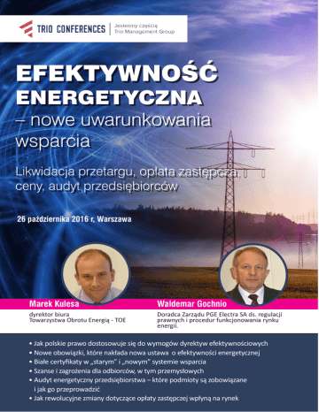 EFEKTYWNOŚĆ ENERGETYCZNA – nowe uwarunkowania wsparcia Likwidacja przetargu, opłata zastępcza, ceny, audyt przedsiębiorców 26 października 2016 r, Warszawa Marek Kulesa Waldemar Gochnio dyrektor biura Towarzystwa Obrotu Energią - TOE Doradca Zarządu PGE Electra SA ds. regulacji prawnych i procedur funkcjonowania rynku energii. • Jak polskie prawo dostosowuje się do wymogów dyrektyw efektywnościowych • Nowe obowiązki, które nakłada nowa ustawa o efektywności energetycznej • Białe certyfikaty w „starym” i „nowym” systemie wsparcia • Szanse i zagrożenia dla odbiorców, w tym przemysłowych • Audyt energetyczny przedsiębiorstwa – które podmioty są zobowiązane i jak go przeprowadzić • Jak rewolucyjne zmiany dotyczące opłaty zastępczej wpłyną na rynek W dniu 20 maja 2016 r. sejm przyjął nową ustawę o efektywności energetycznej, która wejdzie w życie z dniem 1 października 2016 r. Wprowadzi on szereg zmian dla przedsiębiorców, zarówno podmiotów zobowiązanych, jak i odbiorców końcowych! Udział w naszych warsztatach, które odbędą się w czasie po wejściu w życie nowych przepisów pozwolą Państwu na kompleksowe uporządkowanie wiedzy i rozwianie wątpliwości, które na pewno pojawią się na starcie obowiązywania nowych wymogów. DOWIEDZĄ SIĘ PAŃSTWO JAK: • pozyskać białe certyfikaty – katalog podmioty i przedmiotowy • wdrażana jest ustawa i jakie kolejne zmiany czekają polski rynek • wygląda system wsparcia inwestycji proefektywnościowych • nowe obowiązki zmienią sytuację odbiorców energochłonnych • kształtuje się i może się kształtować obrót prawami majątkowymi wynikającymi z białych certyfikatów • zmieni się giełdowy system notowań białych certyfikatów • przygotować się i przeprowadzić audyt • będą kształtowały się nowe trendy w elektroenergetyce • jak nowe regulacje wpłyną na sytuację spółek obrotu (stopniowanie opłaty zastępczej) Eksperci – Marek Kulesa i Waldemar Gochnio nie tylko przedstawią kluczowe zmiany, ale odpowiedzą na wszelkie pytania i wątpliwości dotyczące nowych wymogów. Będzie to wiedza z „pierwszej ręki”, ponieważ ww. eksperci brali udział z ramienia TOE w pracach nad ustawą na wszystkich poziomach legislacji. Dodatkowym atutem będzie obecność innych uczestników reprezentujących różne branże, z którymi będą mogli Państwo wymienić swoją wiedzą i praktyką. Dzięki formule warsztatowej, wydarzenie będzie miało charakter interaktywny. GWARANTUJEMY 100% PRAKTYCZNEJ WIEDZY! PRELEGENCI Marek Kulesa – dyrektor biura Towarzystwa Obrotu Energią - TOE. Absolwent Politechniki Śląskiej (1997), studiów podyplomowych Akademii Ekonomicznej w Katowicach (1998). Od grudnia 2010 roku Członek Zespołu ds. związanych z wprowadzeniem inteligentnych sieci elektro -energetycznych w Polsce. Od lutego 2014 roku członek Zespołu Doradczego ds. rozwiązań systemowych w sektorze energetyki. Od lipca 2015 roku Członek Komitetu Odwoławczego ds. certyfikacji instalatorów OZE. Brał czynny udział w tworzeniu licznych spółek obrotu, opracowywaniu strategii tych spółek na rynku energii. W TOE współpracuje na bieżąco z kluczowymi spółkami obrotu w Polsce. Waldemar Gochnio. Ponad czterdzieści lat pracy w elektroenergetyce, w tym ponad dwadzieścia w obszarze rynku energii, początkowo w Zakładzie Energetycznym Łódź Teren a następnie w PSE SA i PGE Electra SA. Uczestniczył w pracach przygotowujących projekty aktów wykonawczych do ustawy Prawo energetyczne. Wykonawca wielu ekspertyz w zakresie energetyki opartej o źródła odnawialne. Wielokrotny wykładowca na szkoleniach organizowanych przez PTPiREE, TOE i poszczególne przedsiębiorstwa energetyki zawodowej. Członek międzynarodowych zespołów roboczych Unipede, Eurelectric, Baltic Ring i Baltrel w obszarze taryf, rozwoju rynku konkurencyjnego w Europie i współpracy międzynarodowej. Aktualnie zatrudniony jako Doradca Zarządu PGE Electra SA ds. regulacji prawnych i procedur funkcjonowania rynku energii. Absolwent Wydziału Elektrycznego Politechniki Łódzkiej i Wydziału Socjologiczno - Ekonomicznego Uniwersytetu Łódzkiego. AGENDA EFEKTYWNOŚĆ ENERGETYCZNA 9:00 Rejestracja uczestników, poranna kawa 9:20 Powitanie uczestników Marcin Jędrzejewski, Trio Conferences 9:30 Wybrane uwarunkowania unijne w zakresie efektywności energetycznej a polskie ustawodawstwo (30 min.) • cele unijnej polityki energetycznej a efektywności energetyczna • dyrektywa Parlamentu Europejskiego i Rady 2012/27/UE z dnia 25 października 2012 r. w sprawie efektywności energetycznej, zmiany dyrektyw 2009/125/WE i 2010/30/UE oraz uchylenia dyrektyw 2004/8/WE i 2006/32/WE • wdrożenie unijnych dyrektyw efektywnościowych do prawa polskiego • przebieg procesu legislacyjnego nowej ustawy o efektywności energetycznej 10:00 Nowa ustawa z dnia 20 maja 2016 r. o efektywności energetycznej cz. 1 (120 min) • definicje i oznaczenia • podmioty współdziałające dla wzrostu efektywności energetycznej • system wsparcia inwestycji proefektywnościowych realizowany przez podmioty zobowiązane • odbiorca energochłonny a nowe obowiązki 11:00 Przerwa na kawę 11:20 Nowa ustawa z dnia 20 maja 2016 r. o efektywności energetycznej cz. 2 • krajowy plan działań dotyczący efektywności energetycznej • kary pieniężne • zmiany w przepisach obowiązujących, przepisy przejściowe, wejście w życie ustawy 12:20 Lunch 13:00 Świadectwa efektywności energetycznej (tzw. białe certyfikaty) w „starym” i „nowym” systemie (90 min) • zasady wydawania świadectw efektywności energetycznej • rozliczenie obowiązku - przedsięwzięcia, świadectwa efektywności energetycznej, opłata zastępcza • ograniczanie stosowania opłat zastępczych na rzecz realizacji przedsięwzięć proefektywnościowych • prawa majątkowe wynikające z białych certyfikatów • 