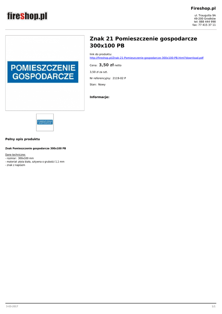 Fireshop.pl ul. Traugutta 9A 49-200 Grodków tel: 888 444 998 fax: 77 415 37 11 Znak 21 Pomieszczenie gospodarcze 300x100 PB link do produktu: http://fireshop.pl/Znak-21-Pomieszczenie-gospodarcze-300x100-PB.html?download.pdf Cena: 3,50 zł netto 3,50 zł za szt. Nr referencyjny: 2119-02 P Stan: Nowy Informacje: Pełny opis produktu Znak Pomieszczenie gospodarcze 300x100 PB Dane techniczne: - rozmiar: 300x100 mm - materiał: płyta biała, sztywna o grubości 1,1 mm - znak z napisem 3-03-2017 1/1