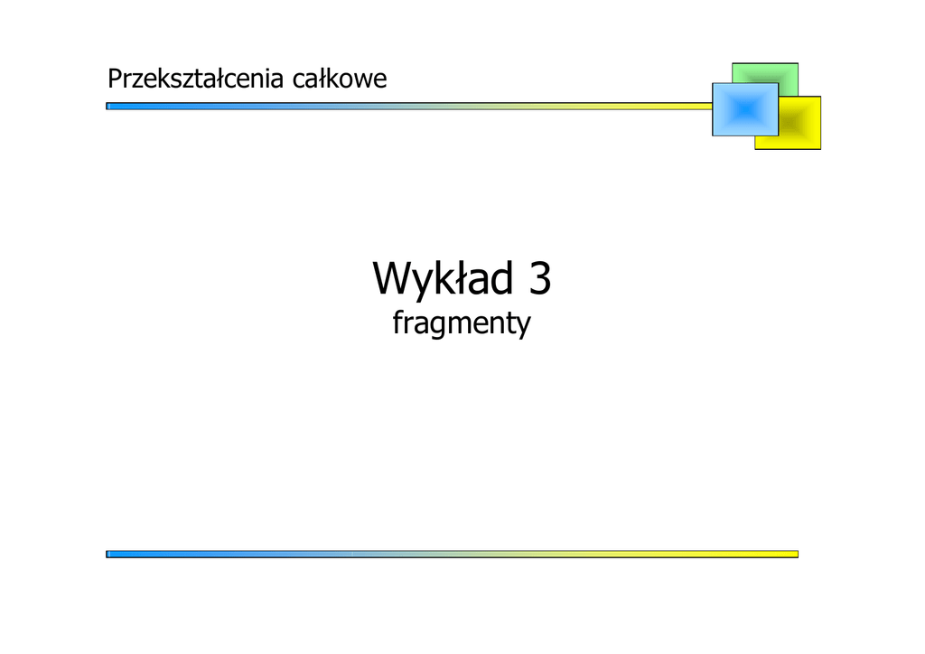Przekształcenia całkowe Wykład 3 fragmenty Funkcja zespolona zmiennej zespolonej Całkowanie funkcji zmiennej zespolonej Twierdzenie 1: Jeżeli funkcja f ( z ) = u ( x, y ) + iv ( x, y ) jest ciągła wzdłuż krzywej regularnej C, to całka istnieje i oblicza się ją ze wzoru: β ∫ f ( z ) d z = ∫ f ⎡⎣ z ( t )⎤⎦ z′ ( t ) d t C α gdzie: z = z ( t ) , α ≤ t ≤ β jest równaniem krzywej całkowania C. Funkcja zespolona zmiennej zespolonej Całka krzywoliniowa funkcji zmiennej zespolonej zachowuje wszystkie własności całki krzywoliniowej funkcji zmiennej rzeczywistej: 1. ∫ ⎡⎣ f ( z ) ± f ( z )⎤⎦ d z = ∫ f ( z ) d z ± ∫ f ( z ) d z 1 2 1 C 2. C ∫ k ⋅ f ( z ) d z = k ⋅∫ f ( z ) d z , C 3. 2 C k = idem C ∫ f ( z ) d z = −∫ f ( z ) d z −C C gdzie C - krzywa, w której zmieniono zwrot na przeciwny. Funkcja zespolona zmiennej zespolonej Definicja 1: Mówimy, że funkcja F ( z ) jest funkcją pierwotną funkcji f ( z ) w obszarze D, jeżeli w każdym punkcie tego obszaru F '( z ) = f ( z ) Twierdzenie 2: Jeżeli funkcja f ( z ) jest ciągła w obszarze jednospójnym D i ma w tym obszarze funkcję pierwotną F ( z ) , to całka krzywoliniowa wzdłuż dowolnej drogi regularnej C zawartej w D o początku z1 i końcu z2 nie zależy od drogi całkowania i wyraża się wzorem ∫ f ( z )d z = F (z ) − F (z ) 2 C 1 Funkcja zespolona zmiennej zespolonej Wzór całkowy Cauchy’ego Twierdzenie 3 (całkowe Cauchy’ego): Jeżeli funkcja f ( z ) jest holomorficzna w obszarze jednospójnym domkniętym D, to całka krzywoliniowa funkcji f ( z ) wzdłuż każdej krzywej regularnej zamkniętej C przebiegającej w D równa jest zeru, czyli: ∫ f ( z)d z = 0 C Funkcja zespolona zmiennej zespolonej Twierdzenie 4 (wzór całkowy Cauchy’ego): Jeżeli funkcja f ( z ) jest holomorficzna w obszarze jednospójnym domkniętym D, którego brzegiem jest kontur C, to w każdym punkcie wewnętrznym z obszaru D wyraża się ona wzorem: Wniosek: 1 f (z) d z, ξ ∈ D f (ξ) = ∫ 2πi C z − ξ ∫ C f (z) d z = 2πi f ( ξ ) , ξ ∈ D z −ξ Funkcja zespolona zmiennej zespolonej Twierdzenie 5 (uogólniony wzór całkowy Cauchy’ego): Jeżeli funkcja f ( z ) jest holomorficzna w obszarze jednospójnym domkniętym D, którego brzegiem jest kontur C, to ma w każdym punkcie wewnętrznym z tego obszaru pochodne wszystkich rzędów określone wzorami f ( n) f ( z) n! d z , n = 1, 2,… (ξ) = ∫ n +1 2πi C ( z − ξ ) Wniosek: f ( z) ∫ ( z − ξ) C dz = n +1 2πi ( n ) f ( ξ ) , n = 1, 2,… n!