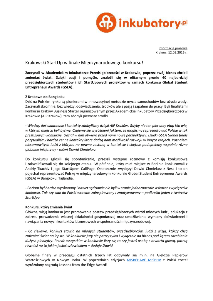 Informacja prasowa Kraków, 12.05.2016 r. Krakowski StartUp w finale Międzynarodowego konkursu! Zaczynali w Akademickim Inkubatorze Przedsiębiorczości w Krakowie, poprzez swój biznes chcieli zmieniać świat. Dzięki pasji i pomyśle, znaleźli się w elitarnym gronie 40 najbardziej przedsiębiorczych studentów i ich StartUpowych projektów w ramach konkursu Global Student Entrepreneur Awards (GSEA). Z Krakowa do Bangkoku Dziś na Polskim rynku są pionierami w innowacyjnej metodzie mycia samochodów bez użycia wody. Zaczynali skromnie, bez wiedzy, doświadczenia, środków ale z pasją i zapałem do pracy. Byli finalistami konkursu Kraków Business Starter organizowanym przez Akademickie Inkubatory Przedsiębiorczości w Krakowie (AIP Kraków), tam zdobyli pierwsze środki. - Wiedzę, doświadczenie i kontakty zdobyliśmy dzięki AIP Kraków. Gdyby nie ten pierwszy etap kto wie, w którym miejscu byli byśmy. Czujemy się wyróżnieni faktem, że mogliśmy reprezentować Polskę w tak prestiżowym konkursie. Udział w nim otwiera przed nami nowe perspektywy. Dzięki GSEA Global finals pozyskaliśmy bardzo cenne kontakty które dadzą nam możliwość rozwoju w innych krajach. Poznałem niesamowitych ludzi z którymi na pewno zostanę w kontakcie i chętnie podejmiemy wspólnie różne globalne inicjatywy - mówi Dawid Chmielarz Do konkursu zgłosili się spontanicznie, przeszli wstępne rozmowy z komisją konkursową i zakwalifikowali się do kolejnego etapu. W półfinale, który miał miejsce w Berlinie konkurowali z Andriy Tkachiv i jego StartUpem CallPage. Ostatecznie zwyciężył Dawid Chmielarz z Ness i to on pojechał reprezentować Polskę w międzynarodowym konkursie Global Student Entrepreneur Awards (GSEA) w Bangkoku, Tajlandia. - Poziom był bardzo wyrównany i nawet sędziowie nie byli w stanie jednoznacznie wskazać zwycięzców konkursu. Tak czy siak do Polski wracam zainspirowany i zmotywowany – podkreśla jeden z twórców StartUpu Konkurs, który zmienia świat Główną misją konkursu jest promowanie postaw przedsiębiorczych wśród młodych ludzi, edukacja z zakresu prowadzenia własnej działalności gospodarczej oraz umożliwienie wymiany doświadczeni i nawiązania nowych kontaktów biznesowych w społeczności międzynarodowej. - Co ciekawe, konkurs stawia na młodych studentów, przedsiębiorców, ludzi z wizją, którzy chcą zmieniać świat na lepsze. W konkursie jury nie patrzy tylko i wyłącznie na biznes pod kątem zarabiania dużych pieniędzy. Przede wszystkim w konkursie liczy się to czy jesteś osobą z otwarta głową, patrzą również na to jakim jesteś człowiekiem – dodaje Dawid Globalne finały w przeciągu ostatnich trzech lat odbywały się m.in. na Giełdzie Papierów Wartościowych w Nowym Jorku. W poprzednich edycjach MISBEHAVE MISBHV z Polski został wyróżniony nagrodą Lessons from the Edge Award! Czas na rozwój – myśl globalnie działaj lokalnie Ness to projekt realizowany przez trzech studentów Ivan Kosarovych, Mateusza Patrzałek i Dawida Chmielarza. Ich pomysł polega na wykorzystaniu technologii australijskich naukowców. Metoda ta pozwala na wymycie samochodu przy wykorzystaniu zaledwie około 0,5 litra wody. Podczas mycia samochodu cząsteczki brudu są zbierane i pochłaniane w tzw. nanopowłowki, który ścieramy za pomocą szmatki z mikrofibry. Swój startup na początku założyli w AIP Kraków, dzięki czemu umożliwiło im to przetestowanie pomysłu na preferencyjnych warunkach bez płacenia ZUS’u. W ramach preinkubacji dostali wsparcie księgowych, prawników, trenerów i mentorów. Od 3 miesięcy działają już na swoim i wspólnie w założyli sp. z o.o. StartUp. Aktualnie posiadają punkt stacjonarny w Krakowskim Business Parku oraz na Parkingu Wawel Ascan. Już niedługo wystartują z aplikacją mobilną, która będzie połączona z google maps i pozwoli zamówić usługę w każdym miejscu i o każdej porze. W najbliższym czasie planują też ekspansję na inne miasta, w związku z tym cały czas szukają partnerów do współpracy. Stopniowo wprowadzają też dodatkowe usługi, takie jak np. Hydrofobowa warstwa ochronna, która jest aplikowana na zewnętrzną stronę szyby samochodu i jak sama nazwa wskazuje odpycha wodę a efekt utrzymuje się od 3 do 6 miesięcy. Więcej o startupie możemy dowiedzieć się na www.ness.auto.pl. GSEA Global Student Entrepreneur Awards to nagroda dla studentów, którzy posiadają i rozwijają swój własny biznes w trakcie nauki w szkole średniej, lub będąc na studiach, od co najmniej 6 miesięcy. Celem programu jest promowanie przedsiębiorczości wśród młodych ludzi na całym świecie, zachęcanie uczniów i studentów do stania się przedsiębiorcami poprzez zapewnienie międzynarodowego wsparcia dla ich projektów, które są innowacyjne, rentowne, społecznie odpowiedzialne i zgodne z wysokimi standardami etycznymi. Program GSEA został zapoczątkowany w 1998 roku przez Uniwersytet Saint Louis. Od 2006 roku jest jednym z programów w międzynarodowej organizacji skupiającej przedsiębiorców przedsiębiorczej Entrepreneurs' Organization (EO). Od tego czasu studenci - przedsiębiorcy mogą czerpać wiedzę i doświadczenie od członków organizacji, jak również mają dostęp do globalnych sieci handlowych, których członkowie rozumieją, co to pasja, walka, determinacja i pragnienie sukcesu. Entrepreneurs' Organization już od ponad 15 lat tworzy dynamiczną sieć składającą się z 8 tys. właścicieli przedsiębiorstw z 40 krajów. EO to przedsięwzięcie, które tworzy przestrzeń wzajemnej wymiany doświadczeń i wiedzy, prowadząc do wzmacniania sukcesów biznesowych i wzbogacając życie wszystkich zaangażowanych członków. Inkubatory AIP (AIP) są praktyczną szkołą prowadzenia biznesu dla startupów. AIP umożliwiają przetestowanie pomysłów na rynku na preferencyjnych warunkach i bez konieczności rejestracji działalności gosp