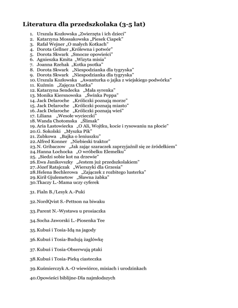 Literatura dla przedszkolaka (3-5 lat) 1. Urszula Kozłowska „Zwierzęta i ich dzieci” 2. Katarzyna Mossakowska „Piesek Ciapek” 3. Rafał Wejner „O małych Kotkach” 4. Dorota Gellner „Królewna i potwór” 5. Dorota Skwark „Smocze opowieści” 6. Agnieszka Kmita „Wizyta misia” 7. Joanna Rzehak „Kotka psotka” 8. Dorota Skwark „Niespodzianka dla tygryska” 9. Dorota Skwark „Niespodzianka dla tygryska” 10. Urszula Kozłowska „Awanturka o jajka z wiejskiego podwórka” 11. Kuźmin „Zajęcza Chatka” 12. Katarzyna Sendecka „Mała syrenka” 13. Monika Kiersnowska „Świnka Peppa” 14. Jack Delaroche „Króliczki poznają morze” 15. Jack Delaroche „Króliczki poznają miasto” 16. Jack Delaroche „Króliczki poznają wieś” 17. Liliana „Wesołe wycieczki” 18. Wanda Chotomska „Ślimak” 19. Aria Łastowiecka „O Ali, Wojtku, kocie i rysowaniu na płocie” 20.G. Sokolski „Myszka Pik” 21. Zubkowa „Bajka o leniuszku” 22.Alfred Konner „Niebieski traktor” 23.N. Gribaczow „Jak zając szaraczek zaprzyjaźnił się ze źródełkiem” 24.Hanna Łochocka „O wróbelku Elemelku” 25. „Siedzi sobie kot na drzewie” 26.Ewa Janikovszky „Jestem już przedszkolakiem” 27. Józef Ratajczak „Wierszyki dla Grzesia” 28.Helena Bechlerowa „Zajączek z rozbitego lusterka” 29.Kirił Gjulemetow „Sławna żabka” 30.Tkaczy L.-Mama uczy cyferek 31. Fialn B./Lesyk A.-Puki 32.NordQvist S.-Pettson na biwaku 33.Parent N.-Wystawa u prosiaczka 34.Socha Jaworski L.-Piosenka Tee 35.Kubuś i Tosia-Idą na jagody 36.Kubuś i Tosia-Budują żaglówkę 37. Kubuś i Tosia-Obserwują ptaki 38.Kubuś i Tosia-Pieką ciasteczka 39.Kuśmierczyk A.-O wiewiórce, misiach i urodzinkach 40.Opowieści biblijne-Dla najmłodszych