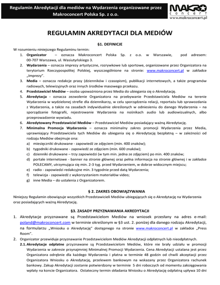 Regulamin Akredytacji dla mediów na Wydarzenia organizowane przez Makroconcert Polska Sp. z o.o. REGULAMIN AKREDYTACJI DLA MEDIÓW §1. DEFINICJE W rozumieniu niniejszego Regulaminu termin: 1. Organizator – oznacza Makroconcert Polska Sp. z o.o. w Warszawie, pod adresem: 00-707 Warszawa, ul. Wasiutyńskiego 3. 2. Wydarzenia – oznacza imprezy artystyczne, rozrywkowe lub sportowe, organizowane przez Organizatora na terytorium Rzeczypospolitej Polskiej, wyszczególnione na stronie: www.makroconcert.pl w zakładce „Imprezy”. 3. Media – oznacza redakcje prasy (dzienników i czasopism), publikacji internetowych, a także programów radiowych, telewizyjnych oraz innych środków masowego przekazu. 4. Przedstawiciel Mediów – osoba upoważniona przez Media do ubiegania się o Akredytację. 5. Akredytacja - oznacza zezwolenie Organizatora na przebywanie Przedstawiciela Mediów na terenie Wydarzenia w wydzielonej strefie dla dziennikarzy, w celu sporządzenia relacji, reportażu lub sprawozdania z Wydarzenia, a także na zasadach indywidualnie określonych w odniesieniu do danego Wydarzenia – na sporządzanie fotografii, rejestrowanie Wydarzenia na nośnikach audio lub audiowizualnych, albo przeprowadzenie wywiadu. 6. Akredytowany Przedstawiciel Mediów – Przedstawiciel Mediów posiadający ważną Akredytację. 7. Minimalna Promocja Wydarzenia – oznacza minimalny zakres promocji Wydarzenia przez Media, uprawniający Przedstawiciela tych Mediów do ubiegania się o Akredytację bezpłatną – w zależności od rodzaju Mediów obejmuje ona: a) miesięczniki drukowane - zapowiedź ze zdjęciem (min. 400 znaków); b) tygodniki drukowane - zapowiedź ze zdjęciem (min. 600 znaków); c) dzienniki drukowane – trzy zapowiedzi (w tym min. jedna ze zdjęciem) po min. 400 znaków; d) portale internetowe - banner na stronie głównej oraz pełna informacja na stronie głównej i w zakładce POLECAMY, utrzymująca się min. 2-3 tyg. przed Wydarzeniem, w dobrze widocznym miejscu; e) radio - zapowiedzi redakcyjne min. 3 tygodnie przed datą Wydarzenia; f) telewizja - zapowiedź z wykorzystaniem materiałów video; g) inne Media – do ustalenia z Organizatorem. § 2. ZAKRES OBOWIĄZYWANIA Niniejszy Regulamin obowiązuje wszystkich Przedstawicieli Mediów ubiegających się o Akredytację na Wydarzenia oraz posiadających ważną Akredytację. §3. ZASADY PRZYZNAWANIA AKREDYTACJI 1. Akredytacje przyznawane są Przedstawicielom Mediów na wniosek przesłany na adres e-mail: [email protected] w terminie określonym w §3 ust. 2. poniżej dla danego rodzaju Akredytacji, na formularzu „Wniosku o Akredytację” dostępnego na stronie www.makroconcert.pl w zakładce „Press Room”. 2. Organizator przewiduje przyznawanie Przedstawicielom Mediów Akredytacji odpłatnych lub nieodpłatnych. 2.1. Akredytacje odpłatne przyznawane są Przedstawicielom Mediów, które nie brały udziału w promocji Wydarzenia w zakresie przynajmniej Minimalnej Promocji Wydarzenia. Cena Akredytacji ustalana jest przez Organizatora odrębnie dla każdego Wydarzenia i płatna w terminie 48 godzin od chwili akceptacji przez Organizatora Wniosku o Akredytację, przelewem bankowym na wskazany przez Organizatora rachunek bankowy. Zakup Akredytacji zostanie potwierdzony w terminie 5 dni roboczych od momentu zaksięgowania wpłaty na koncie Organizatora. Ostateczny termin składania Wniosku o Akredytację odpłatną upływa 10 dni Regulamin Akredytacji dla mediów na Wydarzenia organizowane przez Makroconcert Polska Sp. z o.o. 3. 4. 5. 6. przed datą Wydarzenia. Organizator zastrzega sobie możliwość odmowy udzielenia Akredytacji odpłatnej bez podania przyczyny. Akredytacje odpłatne są imienne i niezbywalne. Organizator nie przyjmuje zwrotów zakupionych Akredytacji. 2.2. Akredytacje nieodpłatne przyznawane są przedstawicielom Mediów, które brały udział w promocji Wydarzenia w zakresie uzgodnionym uprzednio z Organizatorem, nie mniejszym niż Minimalna Promocja Wydarzenia. Ostateczny termin składania wniosku o Akredytację nieodpłatną upływa 14 dni przed datą Wydarzenia. Akredytacje nieodpłatne są przyznawane najpóźniej 7 dni przed datą Wydarzenia. Organizator zastrzega sobie możliwość odmowy udzielenia Akredytacji nieodpłatnej w przypadku wyczerpania miejsc na widowni przeznaczonych dla Akredytowanych Przedstawicieli Mediów. Maksymalna ilość Akredytacji, o którą mogą się ubiegać Przedstawiciele Mediów, w zależności od rodzaju Mediów wynosi: a) radio- 2 szt. b) prasa drukowana - 2 szt. c) portale internetowe- 2 szt. d) telewizja- 4 szt. e) inne Media – 1 szt. Jeżeli w danym mieście Wydarzenie odbywa się kilka razy danego dnia lub kilka dni pod rząd, Akredytacje są wydawane ZAWSZE na pierwsze Wydarzenie, pierwszego dnia. Przyznanie Mediom tytułu Patrona Medialnego czy nawiązanie współpracy redakcyjnej nie jest jednoznaczne z przyznaniem Akredytacji. Zainteresowani Przedstawiciele Mediów zobowiązani są do zgłaszania Wniosków o Akredytację na poszczególne Wydarzenia na zasadach określonych niniejszym Regulaminem. Złożenie Wniosku o Akredytację nie jest równoznaczne z udzieleniem Akredytacji. §4. ZASADY OBOWIĄZUJĄCE AKREDYTOWANYCH PRZEDSTAWICIELI MEDIÓW 1. Akredytowani Przedstawiciele Mediów mają obowiązek odebrania Akredytacji najwcześniej godzinę, a najpóźniej 15 minut przed rozpoczęciem Wydarzenia w wyznaczonym przez Organizatora miejscu przed wejściem na Wydarzenie, po okazaniu dokumenty tożsamości i podaniu numeru Akredytacji. Po upływie powyższego czasu ważność Akredytacji wygasa, a Przedstawiciele Mediów, którzy nie odebrali Akredytacji nie będą wpuszczani na teren Wydarzenia. 2. Akredytowani Przedstawiciele Mediów zobowiązani są do noszenia w widocznym miejscu przekazanych przez Organizatora identyfikatorów, przez cały czas przebywania na terenie Wydarzenia. 3. Akredytowani Przedstawiciele Mediów mogą utrwalać przebieg Wydarzeni