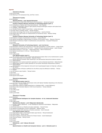 Agenda 2010-05-24 Monday 14:00 Lunch break 15:00 Meeting of the Symposium Org. and Tech. Comm. --2010-05-25 Tuesday 09:00 Breakfast Opening Session - prof. Ryszard Romaniuk 10:30 Introduction to IEEE-SPIE-PSP WILGA 2010 Symposium - Romaniuk Ryszard Faculty of Physics Warsaw University of Technology Session (part 1) 10:45 Comparison of optical and X-Ray brest phantom - Piotr Sobotka 11:00 Degree of polarization fading of light passing through birefringent medium with optical axis variation - Piotr Makowski 11:15 Tunable Photonic Liquid Crystal Fibers - Łukasz Garncarek 11:30 Fiber loop as vibration sensor - Tomasz Poczęsny 11:45 Hollow Core Bragg Fiber for Bio-sensing applications - Karolina Mileńko 12:00 Hybrid fiber optic sensor for measurements of mechanical stress - Mateusz Szeląg 12:15 coffee break Faculty of Physics Warsaw University of Technology Session (part 2) 12:30 Problem of degree of polarization for photons - Łukasz Michalik 12:45 Optical tomography imaging based on analysis of the Mueller matrix - Slawomir Miernicki 13:00 Temporal coherence of light in interferometry and polarimetry - Krzysztof Prokopczuk 13:15 break 13:30 Lunch break Bialystok University of Technology Session - prof. Jan Dorosz 14:30 Stochastic model for the description of laser light propagation in turbid medium - Łukasz Gryko 14:45 Spectroscopic properties of Yb3+/Er3+ - doped antimony-phosphate glasses - Jacek Żmojda 15:00 Phase-locking of 7-core Yb3+ - doped optical fibre - Marcin Kochanowicz 15:15 Optical transmission in I2C bus - Maciej Zajkowski 15:30 (filler) 15:45 coffee break First WILGA session (part 1) 16:00 The selection method of the single mode telecommunication fiber to the interferometric current sensor depending on the destinati - Sławomir Torbus 16:15 Secure real-time wireless video streaming in the aeronautical telecommunications network. Jakub Olszyna 16:30 Application of an optical parametric generator to cavity enhanced experiment - Beata Rutecka 16:45 MEMS-based random number generator for low-power distributed measurement systems. Jakub Olszyna 17:00 Optimalization of the dispersion formula for Q-24 spectrograph based on OriginLab. software. Jan Domin 17:15 Measurements of Poisson coefficient for the fibres using the diffraction methods. - Tomasz Więcek 17:30 3D Scanner Laser System - Tomasz Kuźma 17:45 break 18:00 Lunch break 19:00 Social events & grill --2010-05-26 Wednesday 09:00 Breakfast First WILGA session (part 2) 10:00 Low-Cost and Low-Energy Transmission Units with Optical Feedback Operating at the Shannon Boundary - Anatoliy Platonov 10:15 FEB-based method of ENOB assessment in intelligent ADCs - Łukasz Małkiewicz 10:30 Phase Jitter Generator Based on VCO Circuit Dynamics - Tomasz Adamski 10:45 (filler) 11:30 coffee break 11:45 break 13:00 Lunch break --2010-05-27 Thursday 09:00 Breakfast Computational Inteligence for Complex Systems - dr inż. Jankowski Stanisław 10:00 (filler) 11:00 coffee break Mechatronics Session - prof. Małgorzata Jakubowska 11:15 Printed, organic electronics - a new challange for electronic technologies - Malgorzata Jakubowska 11:30 Printed electronic on flexible and glass substrates. - Konrad Futera 11:45 Method of preparation of silver nanopowder - Mateusz Jarosz 12:00 Screen printed UHF antennas on flexible substrates - Kamil Janeczek First WILGA session (part 3) 12:15 Dependable design using Programmable Logic Devices - Maciej Kwiatkowski 12:30 White Rabbit - Maciej Lipinski 12:45 Some Aspects of Acoustic Analysis for Chosen Vowels - Jacek Kołodziejski 13:00 Thermal Display - Maciej Fimiarz 13:15 (filler) 13:30 break 13:45 Lunch break Palindromy - prof. Tadeusz Morawski 14:45 (filler) Special Session on Health and Computer Science - prof. J. Mulawka (part 1) 15:45 On exploration of medical database - Anna Manerowska 16:00 (filler) IMiO Session, Warsaw University of Technology, Photonic Devices, dr inż. Michał Borecki 16:30 Vaginal sample volume frontier for fertility sensing with optical capillary use - Michal Borecki 16:45 Investigation of luminescence excitated by cold emission from carbon nano-tube cathode Mateusz Mroczkowski 17:00 Fiber laser with loop reflector - P Florczyk 17:15 Development of the automated setup for m-line spectroscopy of highly refractive planar waveguides - R Andrzejewski 17:30 Design of integrated photonic transmitter for application in FTTH systems - K Ławniczuk 17:45 Rare-earth doped nanopowders for applications in novel, polymer-based light sources - P Polis 18:00 dinner break Astro Session - prof. Lech Mankiewicz 19:00 Pi of the Sky catalogue of the variable stars from 2006-2007 data. - Agnieszka Majczyna 19:15 Estimation of space debris detection possibility by Pi of the Sky telescopes - Miroslaw Nalezyty 19:30 Improving photometry of the Pi of the Sky - Rafał Opiela 19:45 Analysis of Cepheids based on photometric data from the Pi of the Sky experiment - Malgorzata Siudek 20:00 Looking for confirmation of gravitational waves detection in optical band – Pi of the Sky involvement in Looc-Up project - Adam Zadrożny 20:15 Advanced CCD/CMOS Cameras for the Pi of The Sky Project and industrial applications Grzegorz Kasprowicz 20:30 Social events & grill --2010-05-28 Friday 09:00 Breakfast First PERG sesion (part 1) 10:00 Thermal Imaging Camera with Web Server. - Krzysztof Sielewicz 10:15 Digital noise reduction techniques for CCD cameras - Piotr Obroslak 10:30 Master Oscillator DOOCS Server - Piotr Więckowski 10:45 Automated deployment in an office and DC - Piotr Miedzik 11:00 Intelligent BLDC servo motor controller with optical interface. - Adrian Samociuk 11:15 Java client for CCII communication - Piotr Romanowski 11:30 coffee break First PERG sesion (part 2) 11:45 Advances of fully differential analogue chain in CCD camera. - Piotr Sitek 12:00 Architecture of location modules for PROTEUS system elements - Radoslav Darakchiev 12:15 ultra low power CMOS camera with wireless interface - Kamil Bor