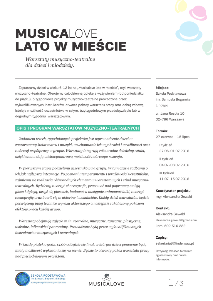 MUSICALOVE LATO W MIEŚCIE Warsztaty muzyczno-teatralne dla dzieci i młodzieży. Zapraszamy dzieci w wieku 6-12 lat na „Musicalove lato w mieście”, czyli warsztaty Miejsce: muzyczno-teatralne. Oferujemy całodzienną opiekę z wyżywieniem (od poniedziałku Szkoła Podstawowa do piątku), 3 tygodniowe projekty muzyczno-teatralne prowadzone przez im. Samuela Bogumiła wykwalifikowanych instruktorów, otwarte pokazy warsztatu pracy oraz dobrą zabawę. Lindego Istnieje możliwość uczestnictwa w całym, trzytygodniowym przedsięwzięciu lub w dogodnym tygodniu warsztatowym. OPIS I PROGRAM WARSZTATÓW MUZYCZNO-TEATRALNYCH Zadaniem trzech, tygodniowych projektów jest wprowadzenie dzieci w ul. Jana Rosoła 10 02-786 Warszawa Termin: 27 czerwca - 15 lipca zaczarowany świat teatru i muzyki, uruchamianie ich wyobraźni i wrażliwości oraz I tydzień twórczej współpracy w grupie. Warsztaty integrują różnorodne dziedziny sztuki, 27.06-01.07.2016 dzięki czemu dają wielowymiarową możliwość twórczego rozwoju. W pierwszym etapie podzielimy uczestników na grupy. W tym czasie zadbamy o II tydzień 04.07-08.07.2016 ich jak najlepszą integrację. Po poznaniu temperamentu i wrażliwości uczestników, III tydzień zajmiemy się realizacją różnorodnych elementów warsztatowych i etiud muzyczno- 11.07-15.07.2016 teatralnych. Będziemy tworzyć choreografie, pracować nad poprawną emisją głosu i dykcją, uczyć się piosenek, budować a następnie animować lalki, tworzyć Koordynator projektu: scenografię oraz bawić się w aktorów i wokalistów. Każdy dzień warsztatów będzie mgr Aleksandra Gewald poświęcony innej technice wyrazu aktorskiego a następnie zakończony pokazem efektów pracy każdej grupy. Kontakt: Aleksandra Gewald Warsztaty obejmują zajęcia m.in. teatralne, muzyczne, taneczne, plastyczne, wokalne, lalkarskie i pantomimę. Prowadzone będą przez wykwalifikowanych [email protected] kom. 602 316 282 instruktorów muzycznych i teatralnych. Zapisy: W każdy piątek o godz. 14.00 odbędzie się finał, w którym dzieci ponownie będą miały możliwość wykazania się na scenie. Będzie to otwarty pokaz warsztatu pracy nad pięciodniowym projektem. [email protected] Otrzymają Państwo formularz zgłoszeniowy oraz dalsze informacje. 1/3 Miejsce: W PROGRAMIE: Szkoła Podstawowa im. Samuela Bogumiła • W świecie teatru i muzyki - Wprowadzenie, zajęcia integracyjne, zabawy z instrumentami muzycznymi. • Ciało w przestrzeni - plastyka ruchu scenicznego, elementy pantomimy. ul. Jana Rosoła 10 • Teatr lalek - podstawy animacji przedmiotu, budowa lalek. 02-786 Warszawa • Tańce hulańce - układy choreograficzne. • Śpiewać każdy może - trening wokalny, impostacja głosu, praca nad dykcją, nauka piosenek. Lindego Termin: 27 czerwca - 15 lipca I tydzień PONADTO: 27.06-01.07.2016 • Improwizacje aktorskie i muzyczne. II tydzień • Praca nad etiudami aktorskimi. 04.07-08.07.2016 • Praca nad rolą -elementarne zadania aktorskie. • Ruch sceniczny. • Tworzenie scenografii. PLAN DNIA: III tydzień 11.07-15.07.2016 Koordynator projektu: mgr Aleksandra Gewald 8.30-10.00 Organizacja czasu na świetlicy / na dworze z przerwą śniadaniową Kontakt: 10.00-14.30 WARSZTATY MUZYCZNO-TEATRALNE z przerwą obiadową [email protected] 14.30-17.00 Organizacja czasu na świetlicy / na dworze z przerwą na podwieczorek Aleksandra Gewald kom. 602 316 282 Zapisy: [email protected] Otrzymają Państwo formularz zgłoszeniowy oraz dalsze informacje. 2/3 Miejsce: CENNIK Szkoła Podstawowa MUSICALOVE LATO W MIEŚCIE 8.30-17.00 im. Samuela Bogumiła Lindego ul. Jana Rosoła 10 • Całodzienna opieka • Warsztaty muzyczno-teatralne • Organizacja czasu poza warsztatami muzyczno-teatralnymi (świetlica/plac zabaw) • 3 posiłki: śniadanie, obiad, podwieczorek 02-786 Warszawa Termin: 27 czerwca - 15 lipca • Wykwalifikowana kadra instruktorów I tydzień • Pomoce dydaktyczne i sprzęt estradowy 27.06-01.07.2016 • Otwarte pokazy pracy II tydzień 1 tydzień - 500 zł 2 tygodnie - 950 zł 3 tygodnie - 1 400 zł 04.07-08.07.2016 III tydzień 11.07-15.07.2016 Koordynator projektu: mgr Aleksandra Gewald Kontakt: Aleksandra Gewald [email protected] kom. 602 316 282 Zapisy: [email protected] Otrzymają Państwo formularz zgłoszeniowy oraz dalsze informacje. 3/3