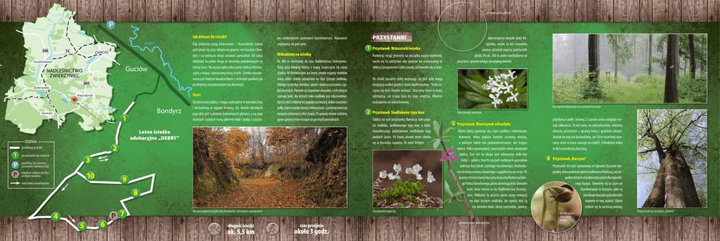 Przetacznik górski P Wolic a Jak dotrzeć do ścieżki? Wieprz 848 74 or Top Szczebrzeszyn n Gdy jedziemy szosą Zwierzyniec – Krasnobród, należy zatrzymać się przy sklepie na granicy wsi Guciów i Bondyrz i na poboczu drogi zostawić samochód. Od szosy odchodzi tu polna droga w kierunku południowym (w stronę lasu). Na jej początku zobaczymy tablicę informacyjną z mapą i zaznaczoną trasą ścieżki. Ścieżka oznakowana jest białymi kwadracikami z zielonym paskiem po przekątnej, namalowanymi na drzewach. ZAMOŚĆ ica Guciów nadleśnictwo ZWIERZYNIEC 849 Zwierzyniec Echo Wie pr Start Krasnobród z Górecko 1 LEGENDA: P P Po 400 m docieramy do lasu Nadleśnictwa Zwierzyniec. Tutaj, przy kolejnej tablicy z mapą, rozpoczyna się nasza ścieżka. W drzewostanie po lewej stronie mijamy stuletnie sosny, które zostały posadzone na zbyt żyznym siedlisku, dlatego są niezbyt dorodne, sękate i słabo oczyszczone z gałęzi bocznych. Obecnie są stopniowo usuwane, a ich miejsce zajmują buki, dla których takie siedlisko jest odpowiednie. Oprócz nich widzimy też pojedyncze brzozy, dzikie czereśnie i jodły. Latem ścieżka tworzy zielony tunel, a jesienią mieni się różnymi odcieniami żółci i brązu. Po prawej stronie widzimy gęste uprawy leśne rosnące na gruntach prywatnych. 2 przystanki na ścieżce Przystanki 1 Wchodzimy na ścieżkę Leśna ścieżka edukacyjna „Debry” przebieg ścieżki 1 Bondyrz Od pierwszej tablicy z mapą wędrujemy w kierunku lasu i wchodzimy w wąwóz lessowy. Na dwóch odcinkach jego dno jest wyłożone betonowymi płytami, a na jego stromych ścianach rosną głównie buki i graby z częścio- wo odsłoniętymi systemami korzeniowymi. Wąwozem wspinamy się pod górę. Przystanek Wskazówki leśnika Ponieważ wciąż jesteśmy na początku naszej wędrówki, warto się tu zatrzymać aby spojrzeć na umieszczoną tu tablicę i przypomnieć sobie zasady zachowania się w lesie. Po chwili ruszamy dalej wspinając się pod górę drogą biegnącą wzdłuż granicy lasów Nadleśnictwa. Teren zaczyna się dość stromo wznosić. Skręcamy nieco w lewo, odchodząc od ściany lasu do jego wnętrza. Wkrótce wchodzimy na wierzchowinę. Buczyna karpacka na wierzchowinie 2 Przystanek Siedliskowe typy lasu Tablica na tym przystanku tłumaczy nam pojęcie siedliska, siedliskowego typu lasu, a także charakteryzuje podstawowe siedliskowe typy polskich lasów. Po lewej stronie teren obniża się w kierunku wąwozu. W runie leśnym 3 parking (tu można zostawić samochód) miejsce odpoczynku w lesie (wiata) 10 9 kierunek zwiedzania 8 4 5 6 P 7 Szczawik zajęczy Na początek ścieżki dochodzimy stromym wąwozem długość ścieżki ok. 5,5 km czas przejścia około 3 godz. obserwujemy okazałe płaty kopytnika, rośnie tu też marzanka wonna, szczawik zajęczy, przetacznik górski. Po ok. 200 m znów wychodzimy na skraj lasu i gruntu ornego (po prawej stronie). Marzanka wonna 3 pojedyncze jodły i jesiony. Z czasem sosna ustępuje niemal całkowicie. Przed nami, na wierzchowinie, widzimy otwartą przestrzeń z uprawą leśną i gruntem rolnym. Jednak do niej nie dochodzimy, ale 50 m wcześniej skręcamy ostro w lewo (uwaga na znaki!). Schodzimy lekko w dół rozrzedzoną buczyną. Przystanek Wawrzynek wilczełyko Warto bliżej zapoznać się z tym rzadkim i chronionym krzewem, który pięknie kwitnie wczesną wiosną, a późnym latem ma jaskrawoczerwone, ale trujące owoce. Kilka egzemplarzy wawrzynka rośnie nieopodal tablicy. Tam też na skraju lasu zobaczymy dziki bez hebd – jeden z trzech naszych rodzimych gatunków dzikiego bzu (obok czarnego i koralowego). Dochodzimy do końca terenu otwartego i zagłębiamy się w las. Po prawej stronie mamy buczynę karpacką Roztoczańskiego Parku Narodowego, gdzie dominują dość dorodne buki, lewa strona to las Nadleśnictwa Zwierzyniec. Widzimy tu jeszcze sporo sosny rosnącej na zbyt żyznym siedlisku, ale oprócz niej są też dorodne buki, klony zwyczajne, jawory, Wawrzynek wilczełyko 4 Przystanek „Buczyna” Przystanek ten jest usytuowany w typowej buczynie karpackiej, która podobnie jak bór jodłowy na Roztoczu, jest zespołem leśnym charakterystycznym dla regla dolnego Karpat. Dowiemy się tu czym się charakteryzuje ta buczyna, jakie są jej rodzaje oraz jakie gatunki roślin możemy w niej znaleźć. Warto wybrać się tu wczesną wiosną, Kiełkujące nasiona buka Stary buk na ścieżce „Debry” Fioletowy łan żywca gruczołowatego w ostępach leśnych ścieżki Debry kiedy fioletowymi łanami kwitnie żywiec gruczołowaty lub bielą się dywany zawilców. Schodzimy dalej mijając gęsty podrost bukowy i grabowy, po czym ponownie wchodzimy w drzewostan sosnowy. W drugim piętrze rosną dorodne buki, które niebawem staną się drzewostanem Żywiec głównym. Po obu stronach trasy biegną wąwozy gruczołowaty o przekroju poprzecznym w kształcie litery V. Wkrótce dochodzimy do miejsca, gdzie oba wąwozy łączą się w jeden, schodzimy w dół i dalej idziemy dnem wąwozu porośniętego na zboczach tym samym typem drzewostanu. 5 9 Przystanek – Żywiec cebulkowy Warto zapoznać się z tą niezwykle ciekawą rośliną, rozmnażającą się głównie wegetatywnie za pomocą bulwek usytuowanych w kątach liści. Kwitnie ona bladoróżowo, zwykle w połowie maja i nie tworzy tak zwartych dywanów, jak jej kuzyn – żywiec gruczołowaty. Ok. 150 m dalej mamy następny przystanek. 6 7 Przystanek – Zwierzęta leśne Dowiemy się tu nie tylko, jak wyglądają najczęściej spotykane w lesie Wąwóz o przekroju w kształcie litery V, potocznie zwany „debrą” Wiata - idealne miejsce na odpoczynek Kwiat zawilca gajowego Na ścieżce gatunki zwierząt, ale poznamy też niezwykłe ciekawostki z ich życia. Dalej teren zaczyna się wznosić, a nasza ścieżka skręca w prawo. Idziemy drogą biegnącą u podnóża wzniesienia i dochodzimy do następnego przystanku. 8 Kopytnik pospolity