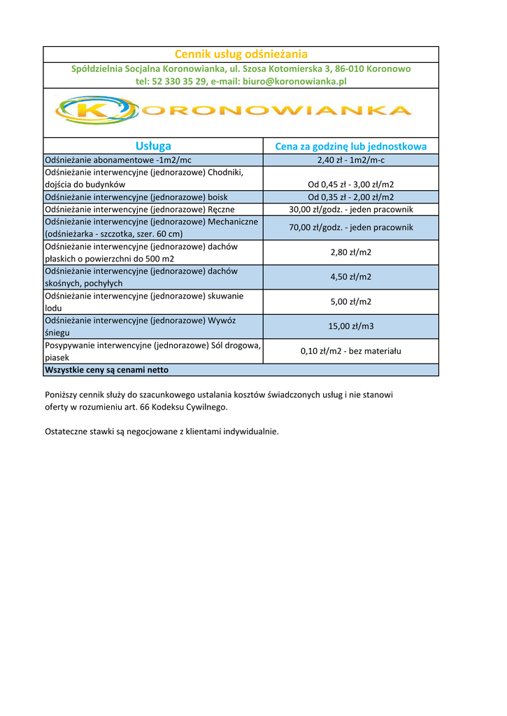 Cennik usług odśnieżania Spółdzielnia Socjalna Koronowianka, ul. Szosa Kotomierska 3, 86-010 Koronowo tel: 52 330 35 29, e-mail: [email protected] Usługa Cena za godzinę lub jednostkowa Odśnieżanie abonamentowe -1m2/mc Odśnieżanie interwencyjne (jednorazowe) Chodniki, dojścia do budynków Odśnieżanie interwencyjne (jednorazowe) boisk Odśnieżanie interwencyjne (jednorazowe) Ręczne Odśnieżanie interwencyjne (jednorazowe) Mechaniczne (odśnieżarka - szczotka, szer. 60 cm) Odśnieżanie interwencyjne (jednorazowe) dachów płaskich o powierzchni do 500 m2 Odśnieżanie interwencyjne (jednorazowe) dachów skośnych, pochyłych Odśnieżanie interwencyjne (jednorazowe) skuwanie lodu Odśnieżanie interwencyjne (jednorazowe) Wywóz śniegu Posypywanie interwencyjne (jednorazowe) Sól drogowa, piasek Wszystkie ceny są cenami netto 2,40 zł - 1m2/m-c Od 0,45 zł - 3,00 zł/m2 Od 0,35 zł - 2,00 zł/m2 30,00 zł/godz. - jeden pracownik 70,00 zł/godz. - jeden pracownik 2,80 zł/m2 4,50 zł/m2 5,00 zł/m2 15,00 zł/m3 0,10 zł/m2 - bez materiału Poniższy cennik służy do szacunkowego ustalania kosztów świadczonych usług i nie stanowi oferty w rozumieniu art. 66 Kodeksu Cywilnego. Ostateczne stawki są negocjowane z klientami indywidualnie.