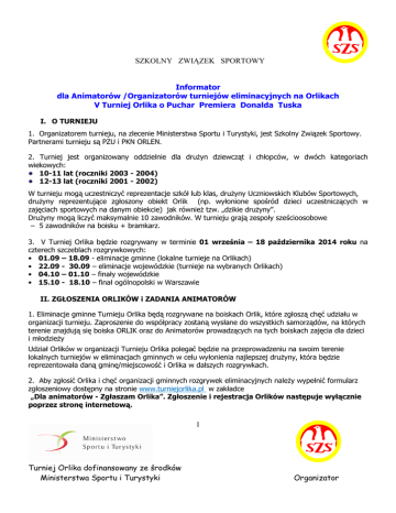 SZKOLNY ZWIĄZEK SPORTOWY Informator dla Animatorów /Organizatorów turniejów eliminacyjnych na Orlikach V Turniej Orlika o Puchar Premiera Donalda Tuska I. O TURNIEJU 1. Organizatorem turnieju, na zlecenie Ministerstwa Sportu i Turystyki, jest Szkolny Związek Sportowy. Partnerami turnieju są PZU i PKN ORLEN. 2. Turniej jest organizowany oddzielnie dla drużyn dziewcząt i chłopców, w dwóch kategoriach wiekowych: • 10-11 lat (roczniki 2003 - 2004) • 12-13 lat (roczniki 2001 - 2002) W turnieju mogą uczestniczyć reprezentacje szkół lub klas, drużyny Uczniowskich Klubów Sportowych, drużyny reprezentujące zgłoszony obiekt Orlik (np. wyłonione spośród dzieci uczestniczących w zajęciach sportowych na danym obiekcie) jak również tzw. „dzikie drużyny”. Drużyny mogą liczyć maksymalnie 10 zawodników. W turnieju grają zespoły sześcioosobowe – 5 zawodników na boisku + bramkarz. 3. V Turniej Orlika będzie rozgrywany w terminie 01 września – 18 października 2014 roku na czterech szczeblach rozgrywkowych: • 01.09 – 18.09 - eliminacje gminne (lokalne turnieje na Orlikach) • 22.09 - 30.09 – eliminacje wojewódzkie (turnieje na wybranych Orlikach) • 04.10 – 01.10 – finały wojewódzkie • 15.10 - 18.10 – finał ogólnopolski w Warszawie II. ZGŁOSZENIA ORLIKÓW i ZADANIA ANIMATORÓW 1. Eliminacje gminne Turnieju Orlika będą rozgrywane na boiskach Orlik, które zgłoszą chęć udziału w organizacji turnieju. Zaproszenie do współpracy zostaną wysłane do wszystkich samorządów, na których terenie znajdują się boiska ORLIK oraz do Animatorów prowadzących na tych boiskach zajęcia dla dzieci i młodzieży Udział Orlików w organizacji Turnieju Orlika polegać będzie na przeprowadzeniu na swoim terenie lokalnych turniejów w eliminacjach gminnych w celu wyłonienia najlepszej drużyny, która będzie reprezentowała daną gminę/miejscowość i Orlika w dalszych rozgrywkach. 2. Aby zgłosić Orlika i chęć organizacji gminnych rozgrywek eliminacyjnych należy wypełnić formularz zgłoszeniowy dostępny na stronie www.turniejorlika.pl w zakładce „Dla animatorów - Zgłaszam Orlika”. Zgłoszenie i rejestracja Orlików następuje wyłącznie poprzez stronę internetową. 1 Turniej Orlika dofinansowany ze środków Ministerstwa Sportu i Turystyki Organizator SZKOLNY ZWIĄZEK SPORTOWY Zgłoszenia Orlików będą przyjmowane do dnia 30 czerwca 2014r. W zgłoszeniu należy podać: • dokładny adres Orlika, • imię, nazwisko oraz dane kontaktowe animatora/organizatora rozgrywek (tel. komórkowy, mail), • planowaną liczbę drużyn w rozgrywkach oraz liczbę zawodniczek i zawodników w poszczególnych kategoriach wiekowych, planowany termin rozgrywek. 3. Na jednym Orliku można zgłosić i przeprowadzić w każdej kategorii wiekowej tylko jeden turniej eliminacyjny dziewcząt i jeden turniej eliminacyjny chłopców (łącznie maksymalnie 4 turnieje). Turniej eliminacyjny to rozgrywki minimum 4 drużyn. W wyjątkowych przypadkach (np. małe miejscowości z niewielką liczbą szkół w okolicy ), za zgodą koordynatora turnieju lub odpowiedniego koordynatora wojewódzkiego Animator /organizator eliminacji na Orliku może zgłosić organizację turnieju z udziałem 3 drużyn. Wykaz wszystkich zgłoszonych Orlików wraz z informacjami o planowanych na nich rozgrywkach umieścimy na stronie www.turniejorlika.pl na specjalnej mapie zakładce „ORLIKI”. 4. Orliki, które zgłoszą udział w V Turnieju Orlika otrzymają dofinansowanie do kosztów organizacji turniejów eliminacyjnych - przewidujemy ryczałt w kwocie 190,00 zł brutto dofinansowania kosztów przeprowadzenia jednego turnieju eliminacyjnego w jednej kategorii wiekowej. Dofinansowanie obejmuje koszty: • przygotowania i przeprowadzenia rozgrywek eliminacyjnych na Orliku - stawka do 90,00 brutto za turniej • opieki medycznej – stawka do 50,00 brutto za turniej • ryczałt sędziowski – stawka do 50,00 brutto za turniej Przykład - dofinansowanie do organizacji turniejów eliminacyjnych dla drużyn dziewcząt i chłopców w jednej kategorii wiekowej wyniesie 380,00 (2 turnieje eliminacyjne) , dofinansowanie do organizacji turniejów w obu kategoriach wiekowych, dziewczęta, chłopcy – wyniesie 760,00 (4 turnieje eliminacyjne). 5. Animatorzy, którzy przeprowadzą na swoim Orliku minimum 3 turnieje eliminacyjne otrzymają pamiątkową koszulkę polo. Przykład – koszulkę polo otrzyma Animator, który zorganizuje turnieje eliminacyjne dla chłopców w obu kategoriach wiekowych (2 turnieje) i turniej dla dziewcząt w jednej kategorii wiekowej 6. Każdy Orlik, zakwalifikowany do organizacji turniejów eliminacyjnych otrzyma „Pakiet promocyjny dla Orlika”: • super modne, pamiątkowe opaski na rękę z limitowanej serii FANKLUBU ORLIKA wydanej z okazji jubileuszowej 5 edycji Turnieju Orlika (liczba w pakiecie będzie ustalana na podstawie liczby drużyn i zawodników wykazanych w zgłoszeniu przesłanym przez animatora) 2 Turniej Orlika dofinansowany ze środków Ministerstwa Sportu i Turystyki Organizator SZKOLNY ZWIĄZEK SPORTOWY • pamiątkowe koszulki T – shirt dla trenerów drużyn, które zagrają w rozgrywkach • pamiątkowe dyplomy/certyfikaty dla wszystkich dzieci i wszystkich drużyn grających w rozgrywkach na Orliku. 7. Zadania animatorów przy organizacji gminnych turniejów eliminacyjnych: • promocja Turnieju Orlika na swoim terenie - naszym wspólnym celem jest udział w turnieju jak największej liczby dziecięcych drużyn piłkarskich. Ważne aby animatorzy byli aktywni, aby zachęcali dzieci grające na ich Orliku, nauczycieli okolicznych szkół, opiekunów i trenerów do zgłaszania drużyn i do udziału w turnieju; • rekrutacja drużyn – zachęcamy do rekrutacji drużyn i organizacji turniejów w obu kategoriach wiekowych. • zaplanowanie i przeprowadzenie rozgrywek - Animatorzy/organizatorzy eliminacji gminnych na Orlikach samo